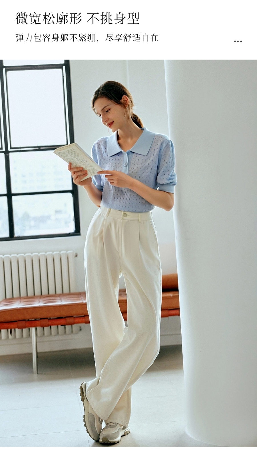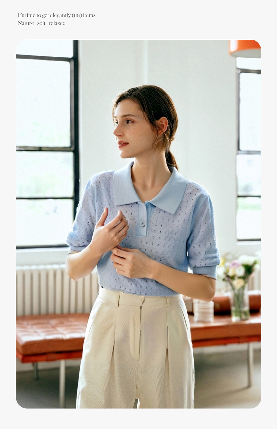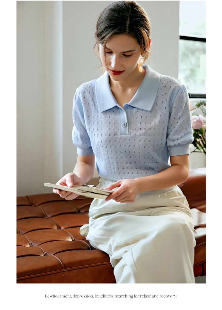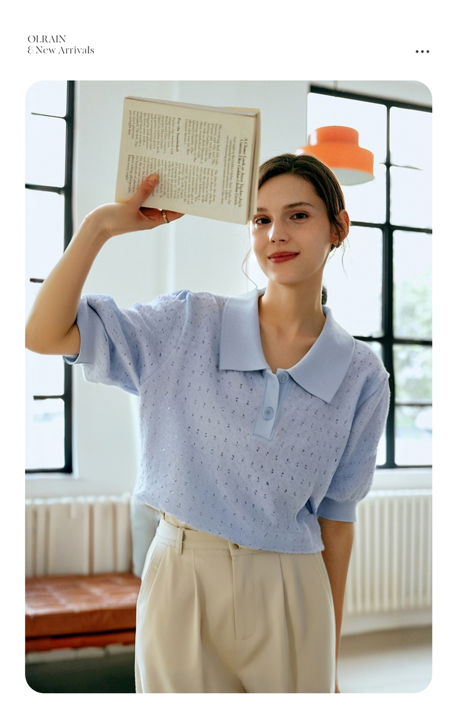OLrain欧芮儿蓝色POLO领毛针织套头衫女夏季2025新款宽松短袖上衣