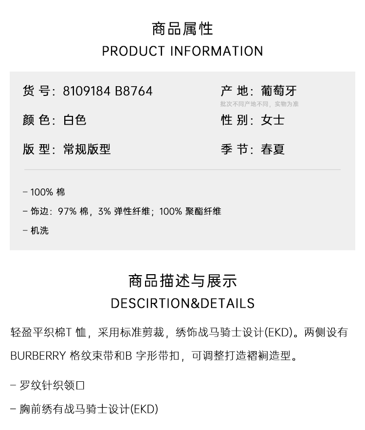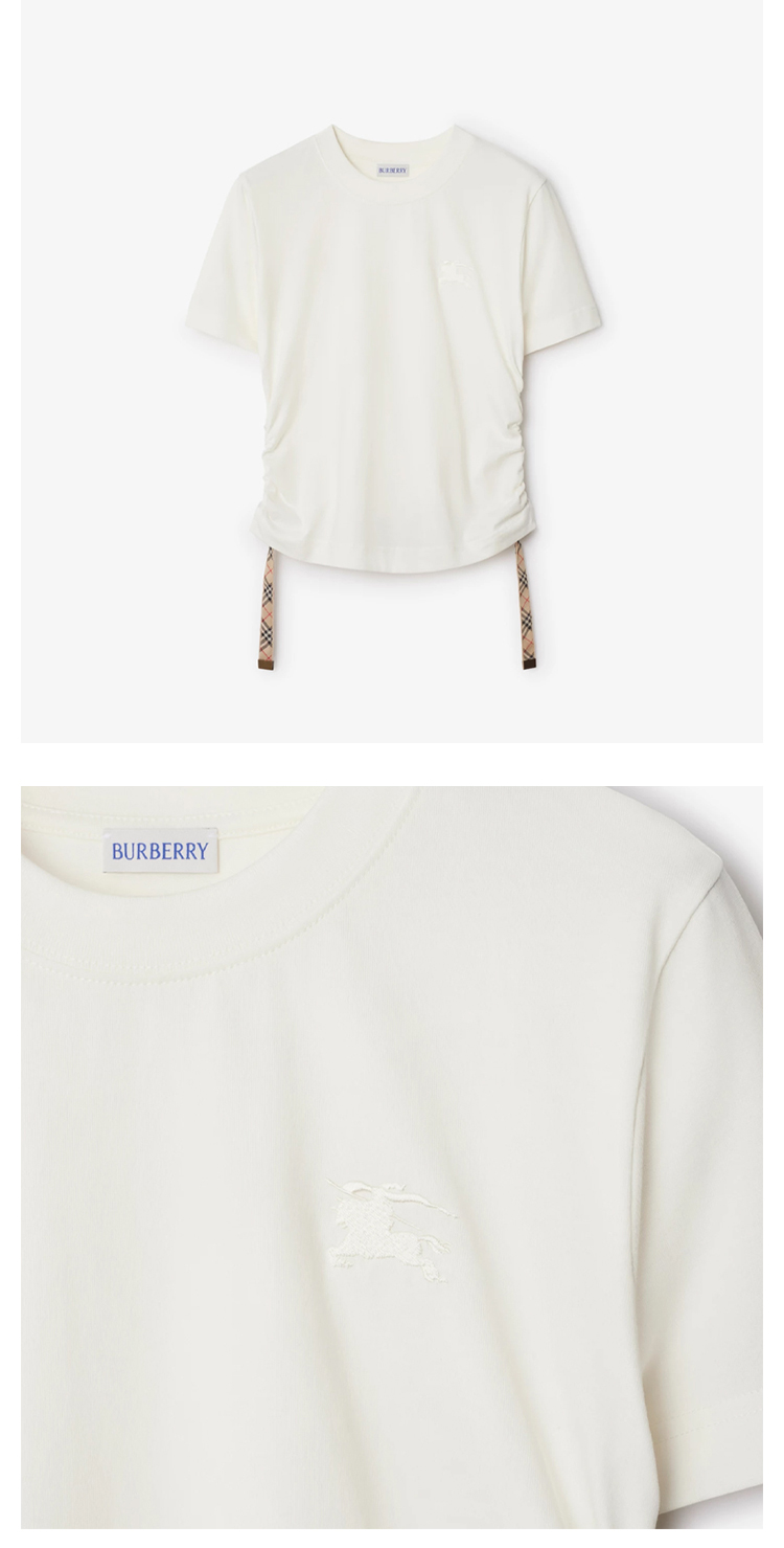 BURBERRY 巴宝莉 女士马术骑士徽标刺绣 Festival 棉质圆领短袖T恤 白色 8109184 B8764