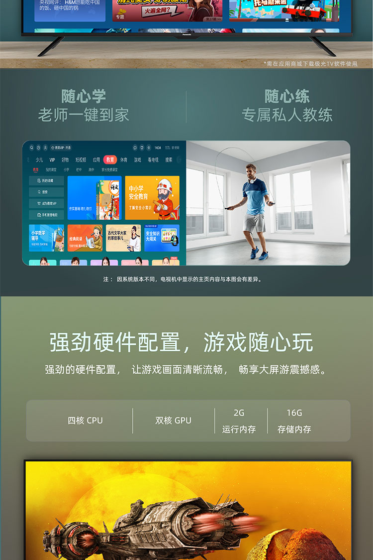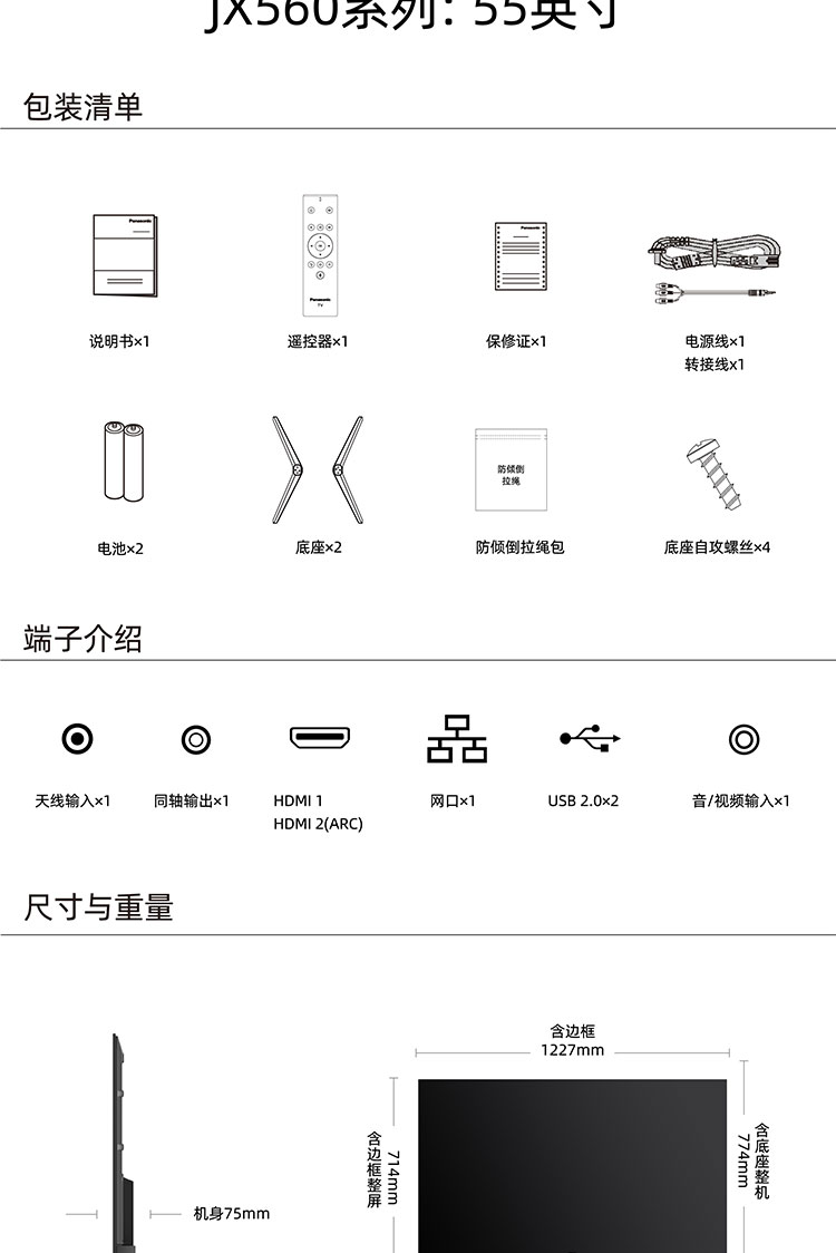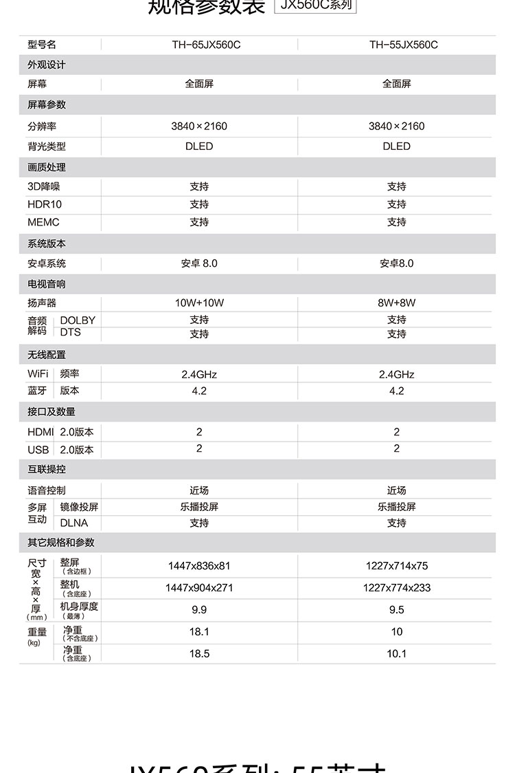 松下(Panasonic)TH-55JX560C 55英寸 4K超清全面屏 六色优化引擎开机无广告 家长模式教育电视