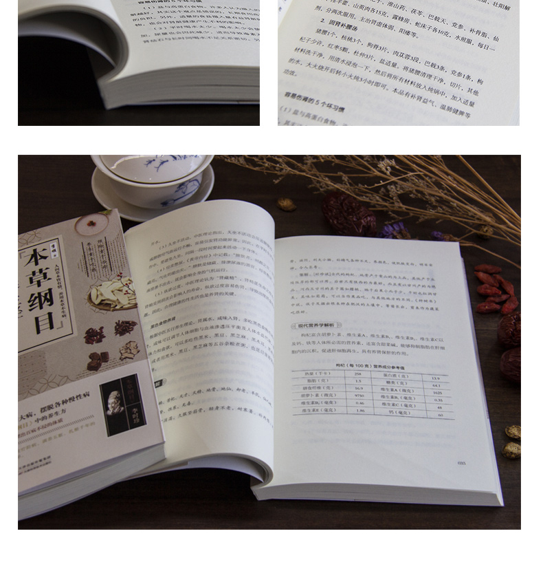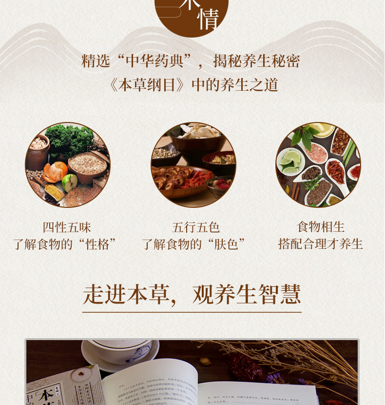 《本草纲目》的养生理念是“药食同源”,简单理解就是食物即药物,打破了食物与药物的分界线,将中药的“四性”“五味”运用到食物之中。每一种食物都有“四性”和“五味”,“四性”即寒、热、温、凉,“五味”即辛、甘、酸、苦、咸。