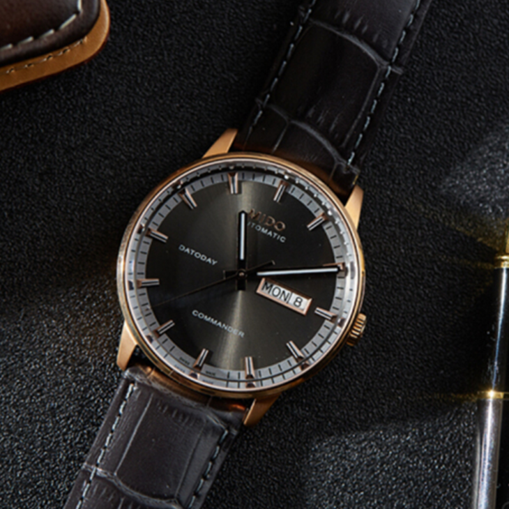 镜面 材质 | 蓝宝石水晶玻璃 | 表盘 | 精钢/PVD镀玫瑰金表壳 烟煤灰色表盘 日期 星期显示 夜光 密底 |