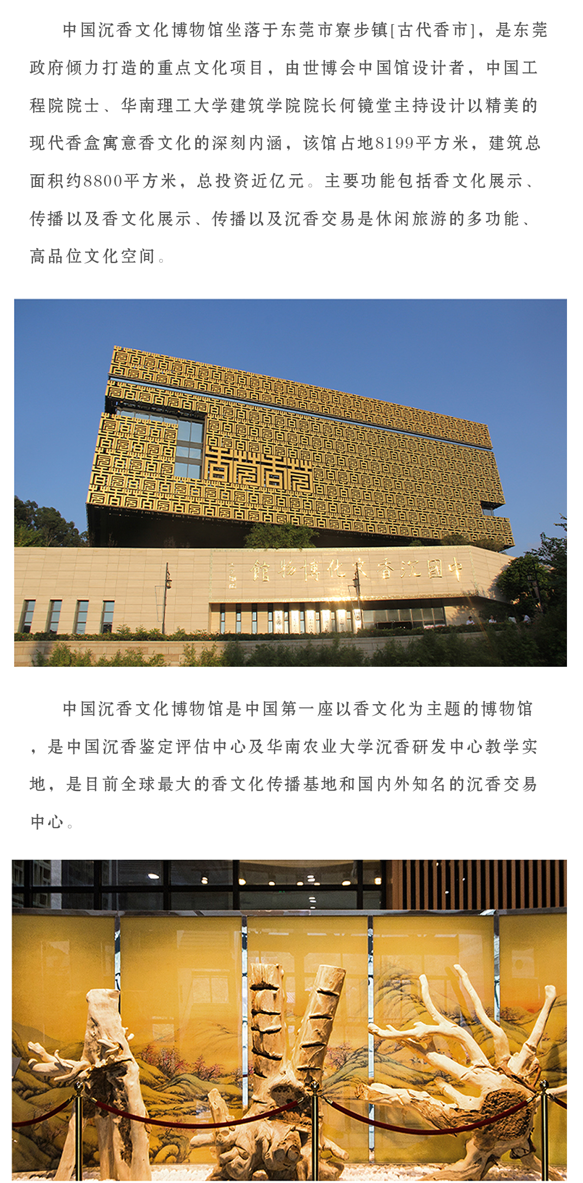 中国沉香文化博物馆坐落于古代[香市]东莞市寮步镇,是东莞政府倾力打造的重点文化项目,由世博会中国馆设计者,中国工程院院士、华南理工大学建筑学院院长何镜堂主持设计,以精美的现代[香盒]寓意香文化的深刻内