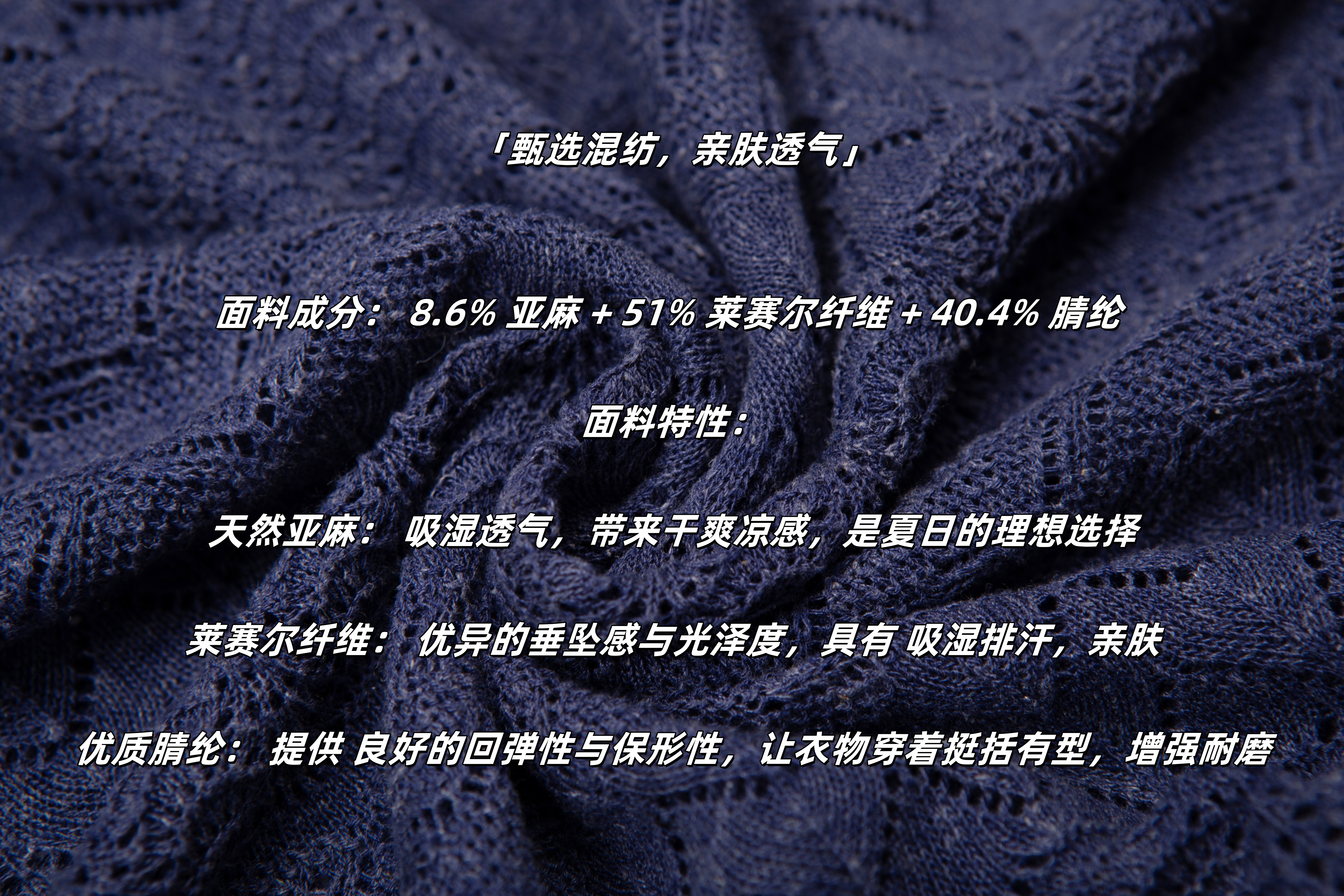 面料成分: 8.6% 天然亚麻 + 51% 莱赛尔纤维 + 40.4% 腈纶