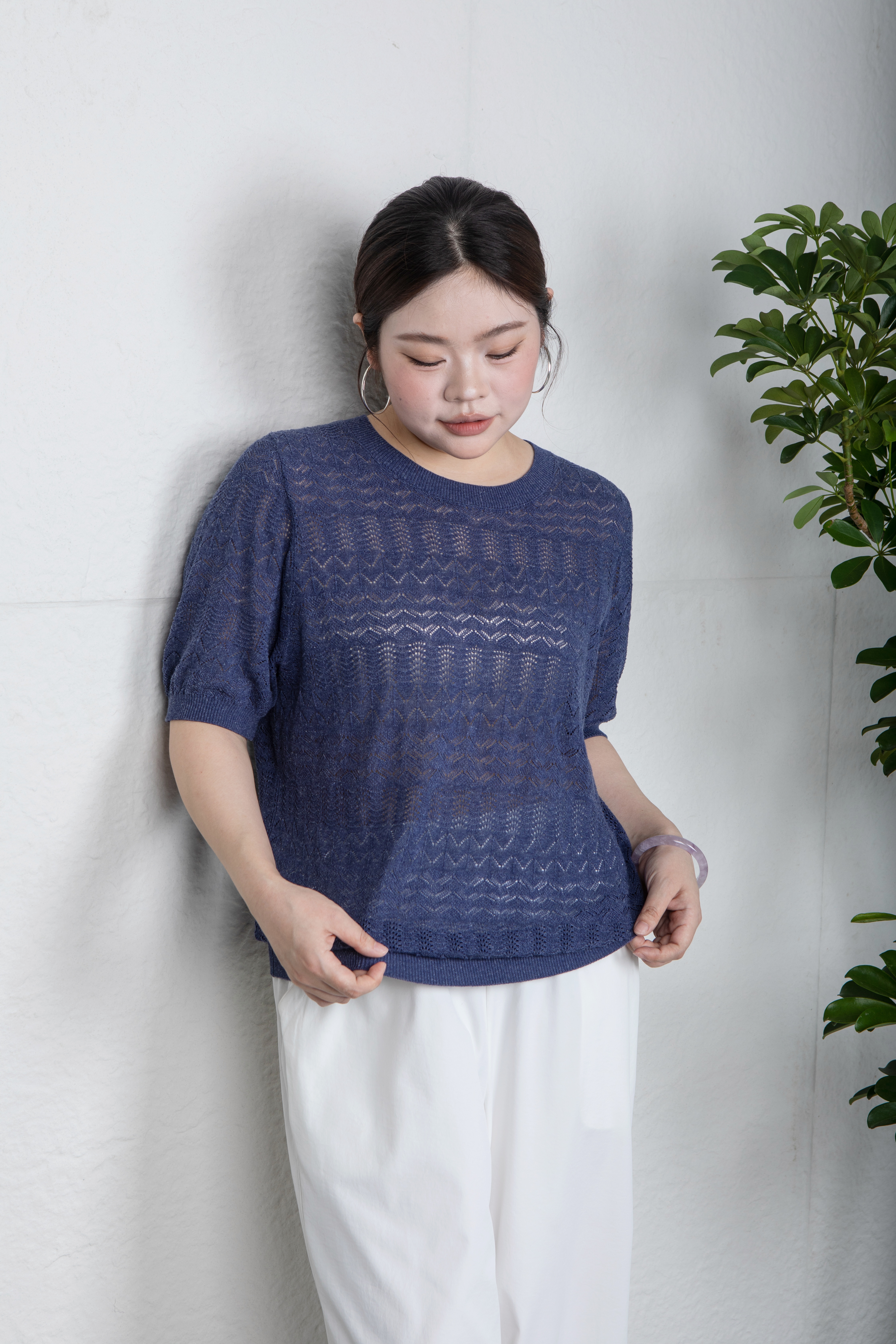 ✨【现货 48小时内发货】不缩水不闷汗,亚麻莱赛尔腈纶面料,正码正拍,经典合身版,细腻镂空肌理,💙清爽蓝色系,打造松弛感!简约圆领镂空肌理短袖针织衫上衣