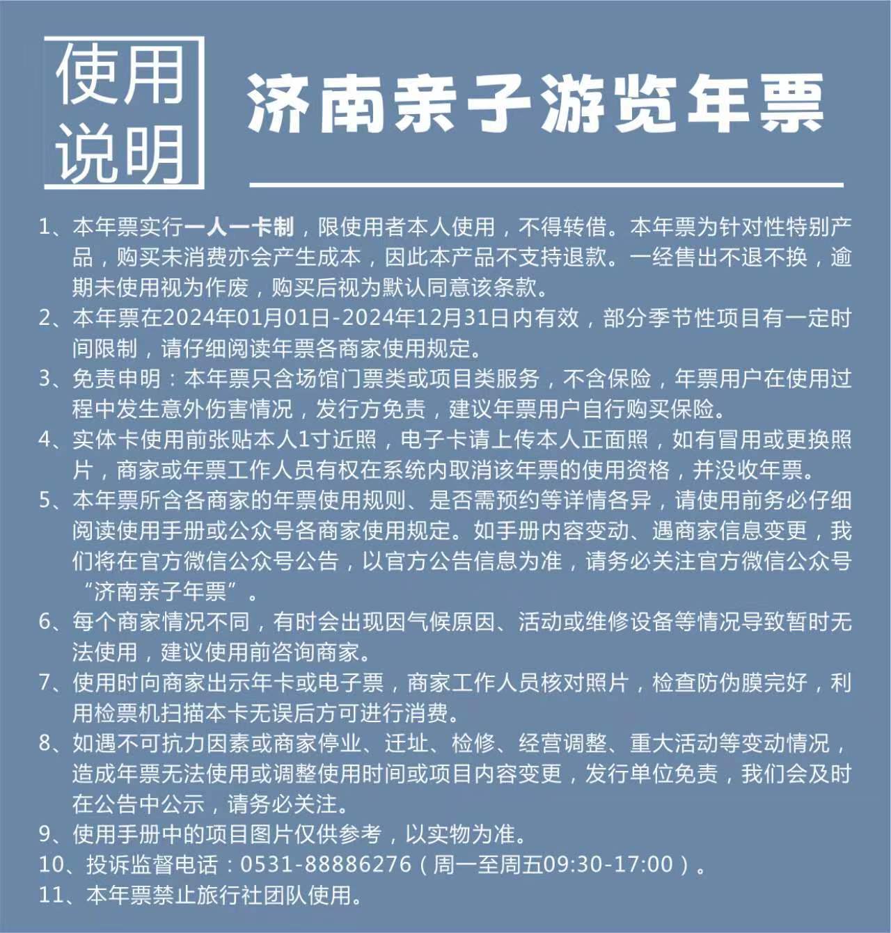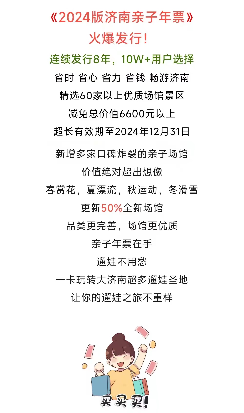 2024济南亲子游览年票精选济南及周边60家以上优质场馆景区,总减免价值6600元以上,限时特惠价198元,超长有效期至2024年12月31日。