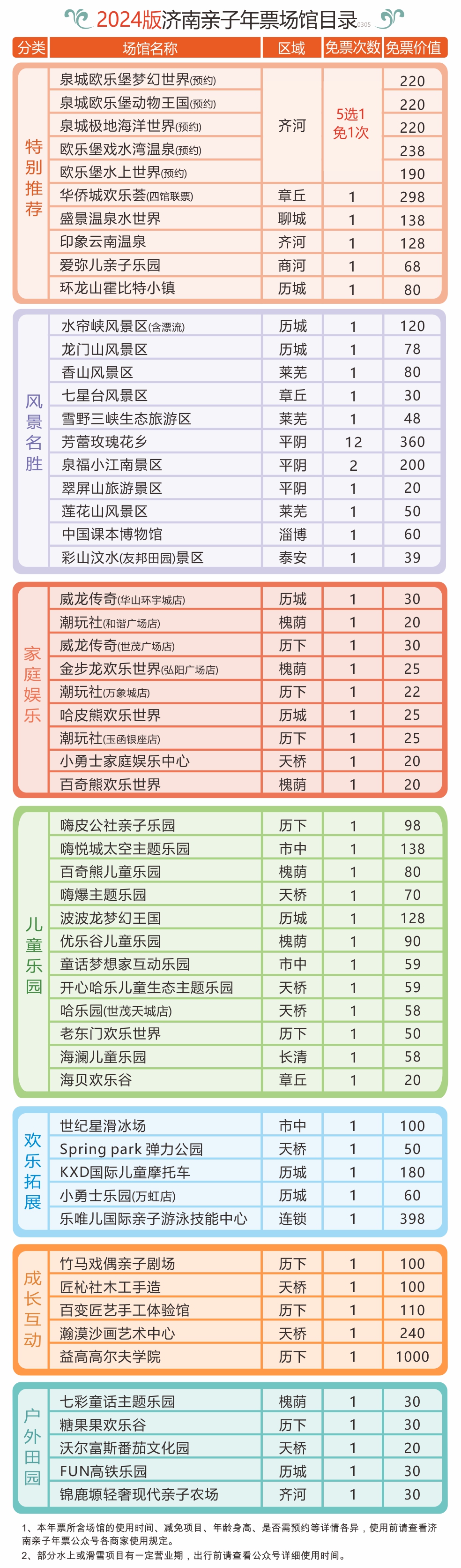 2024版济南亲子游览年票包括七大类:优秀主题、风景名胜、儿童乐园、家庭娱乐、欢乐拓展、成长互动、户外田园。