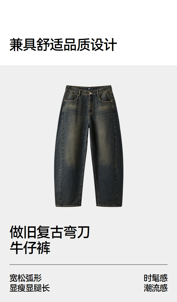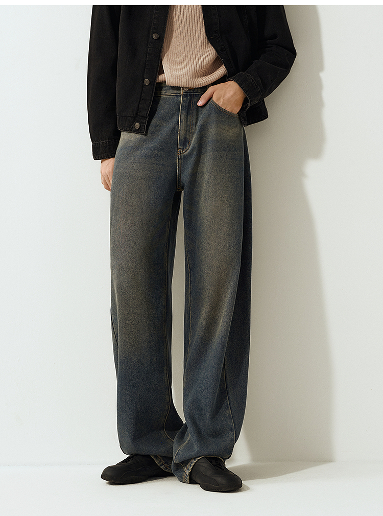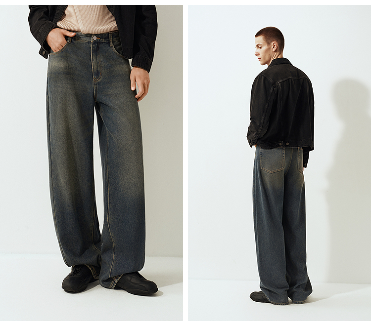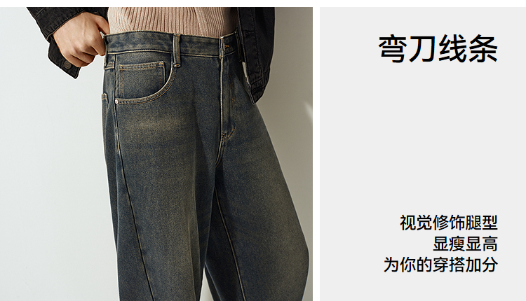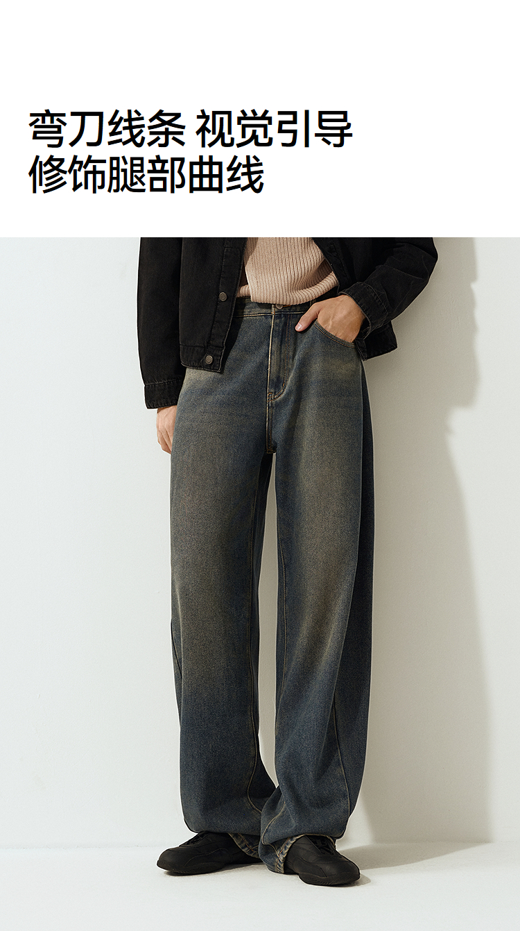 森马牛仔裤男做旧复古阔感弯刀裤宽松弧形裤2025冬新款长裤丹宁布