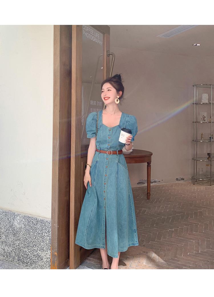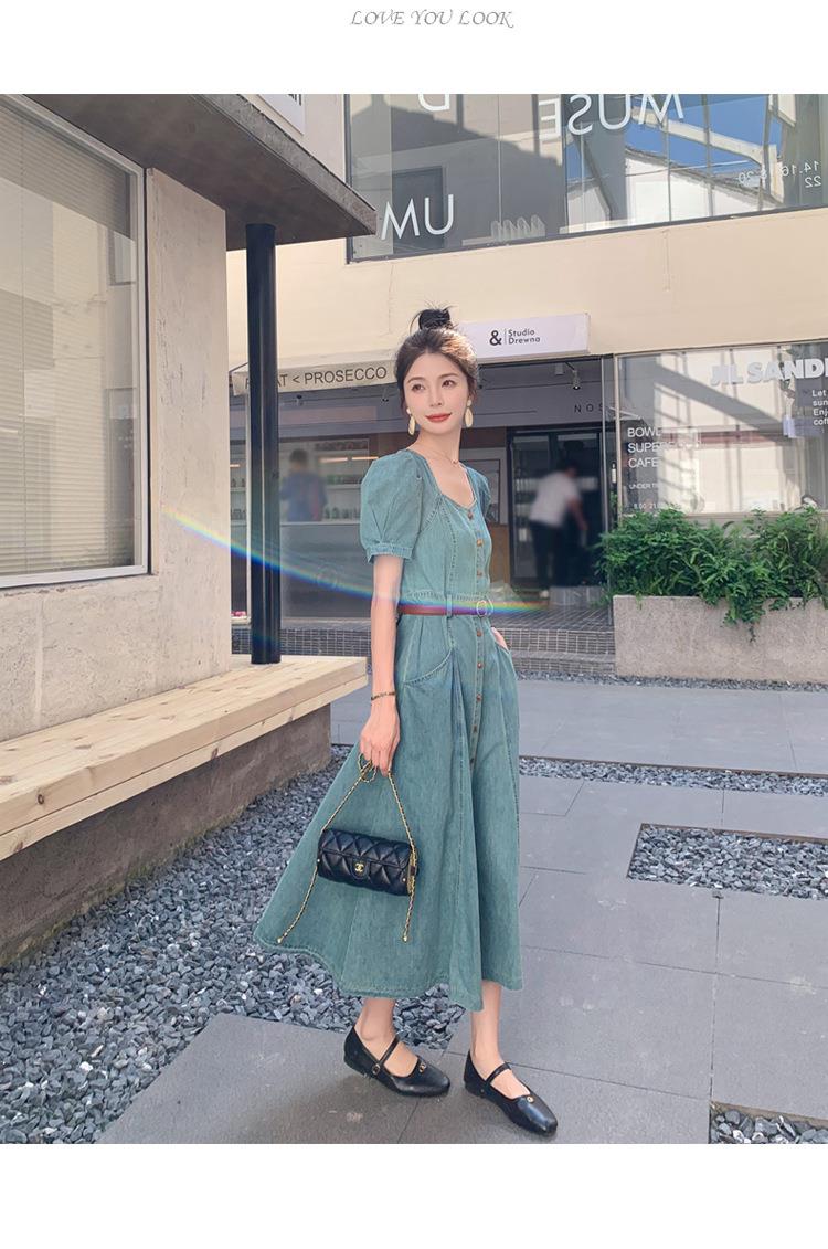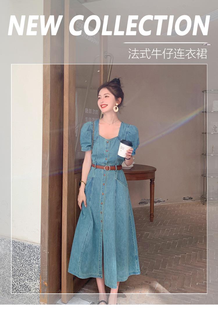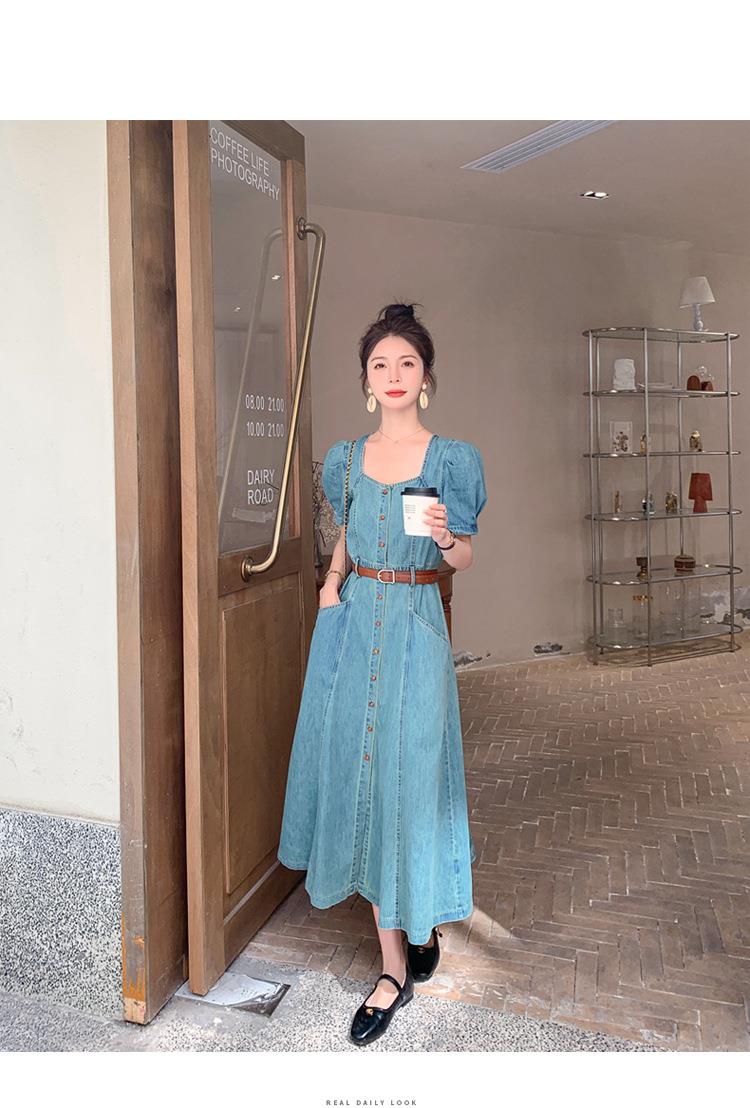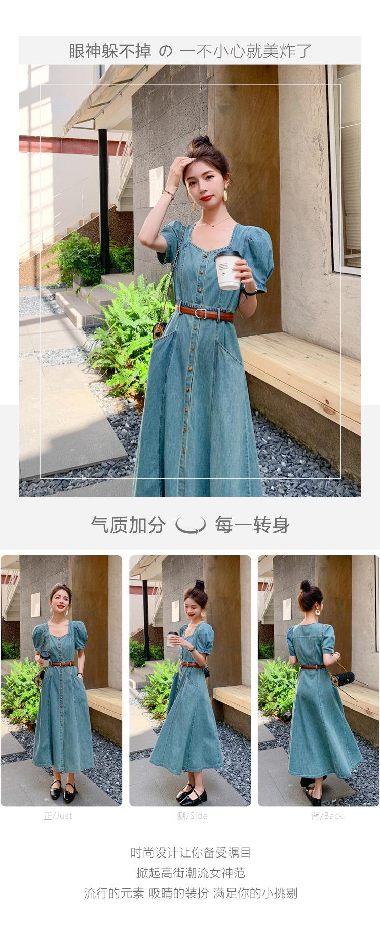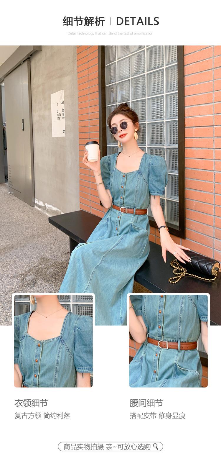 法式复古泡泡袖薄款牛仔连衣裙女夏季新款方领修身气质长款裙子