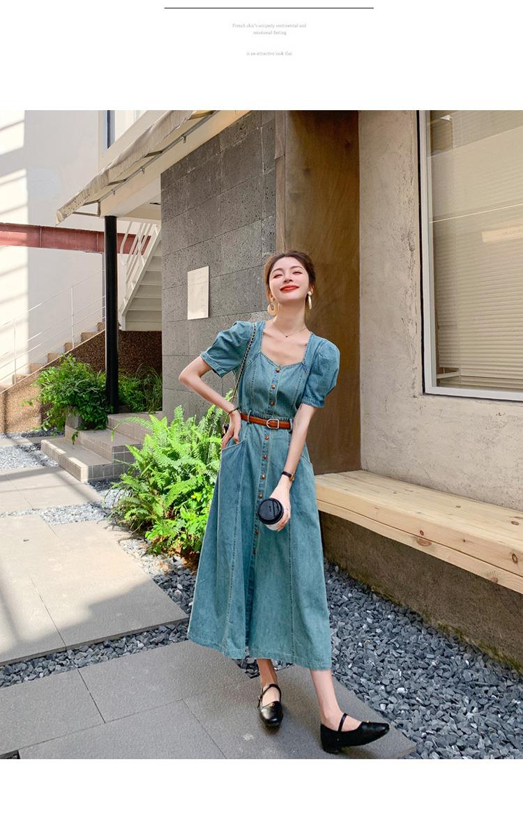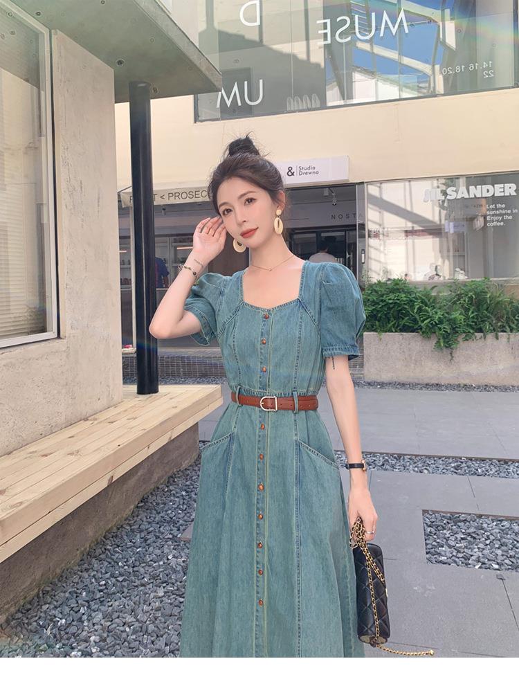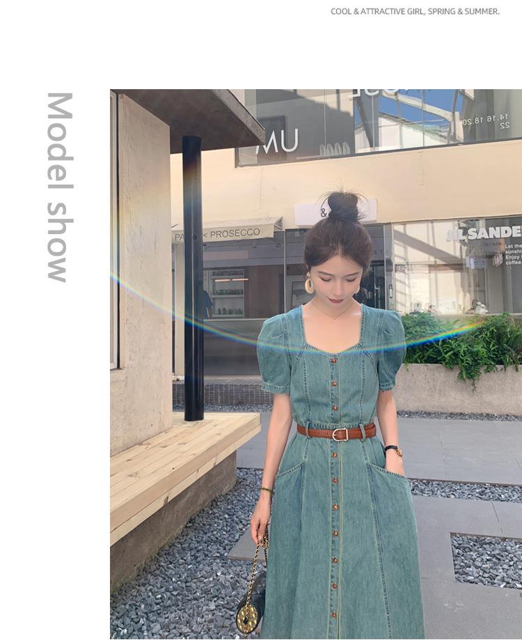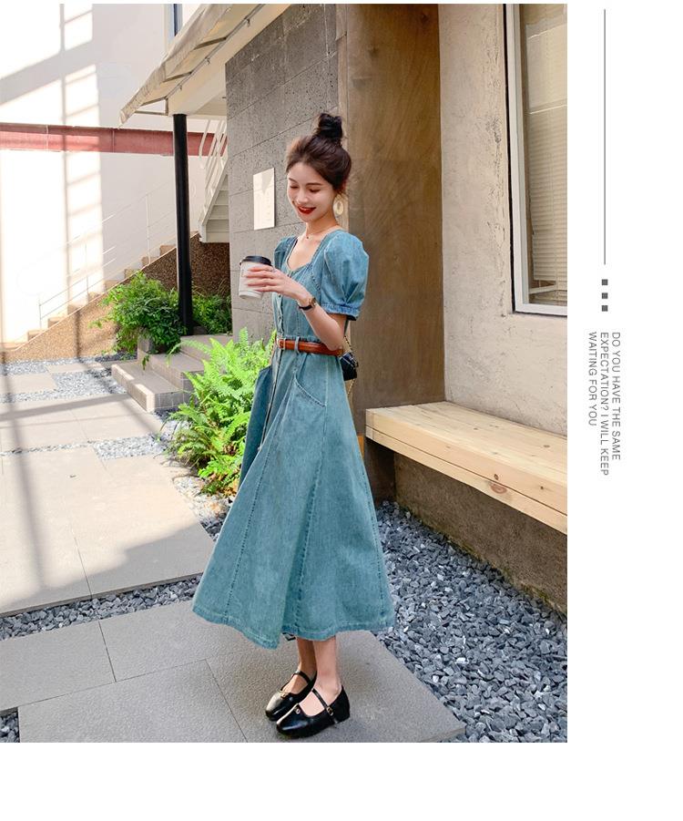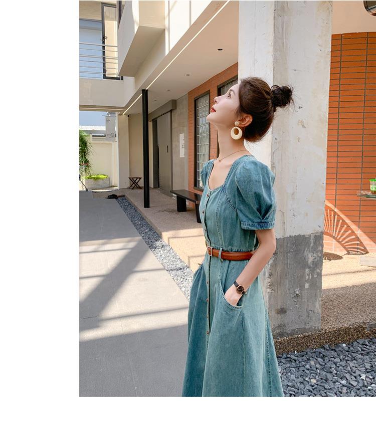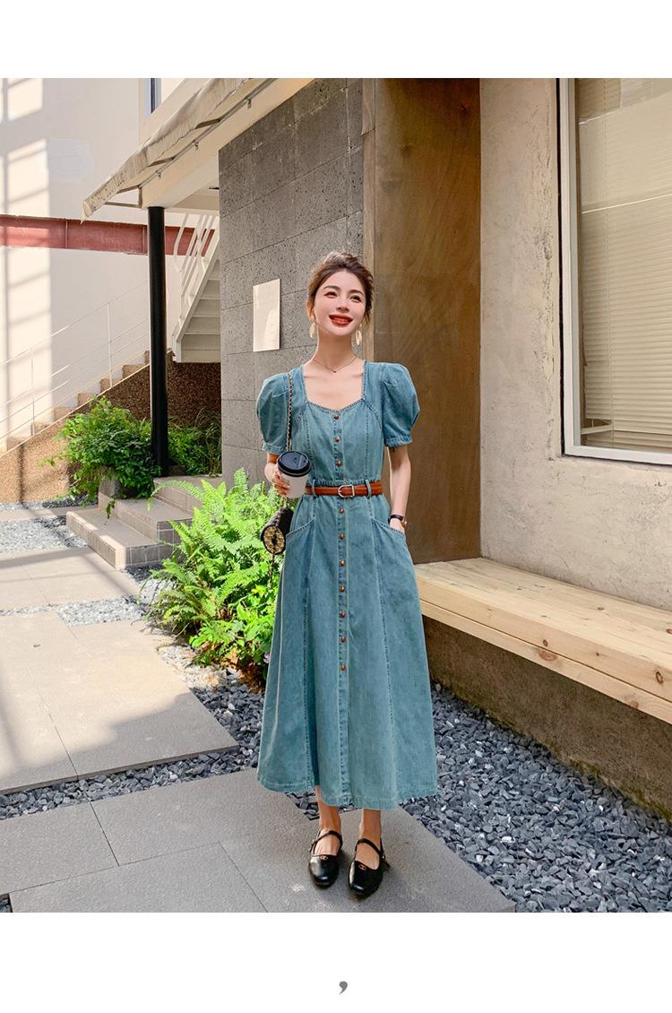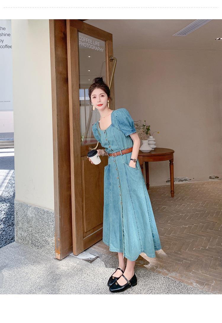 法式复古泡泡袖薄款牛仔连衣裙女夏季新款方领修身气质长款裙子