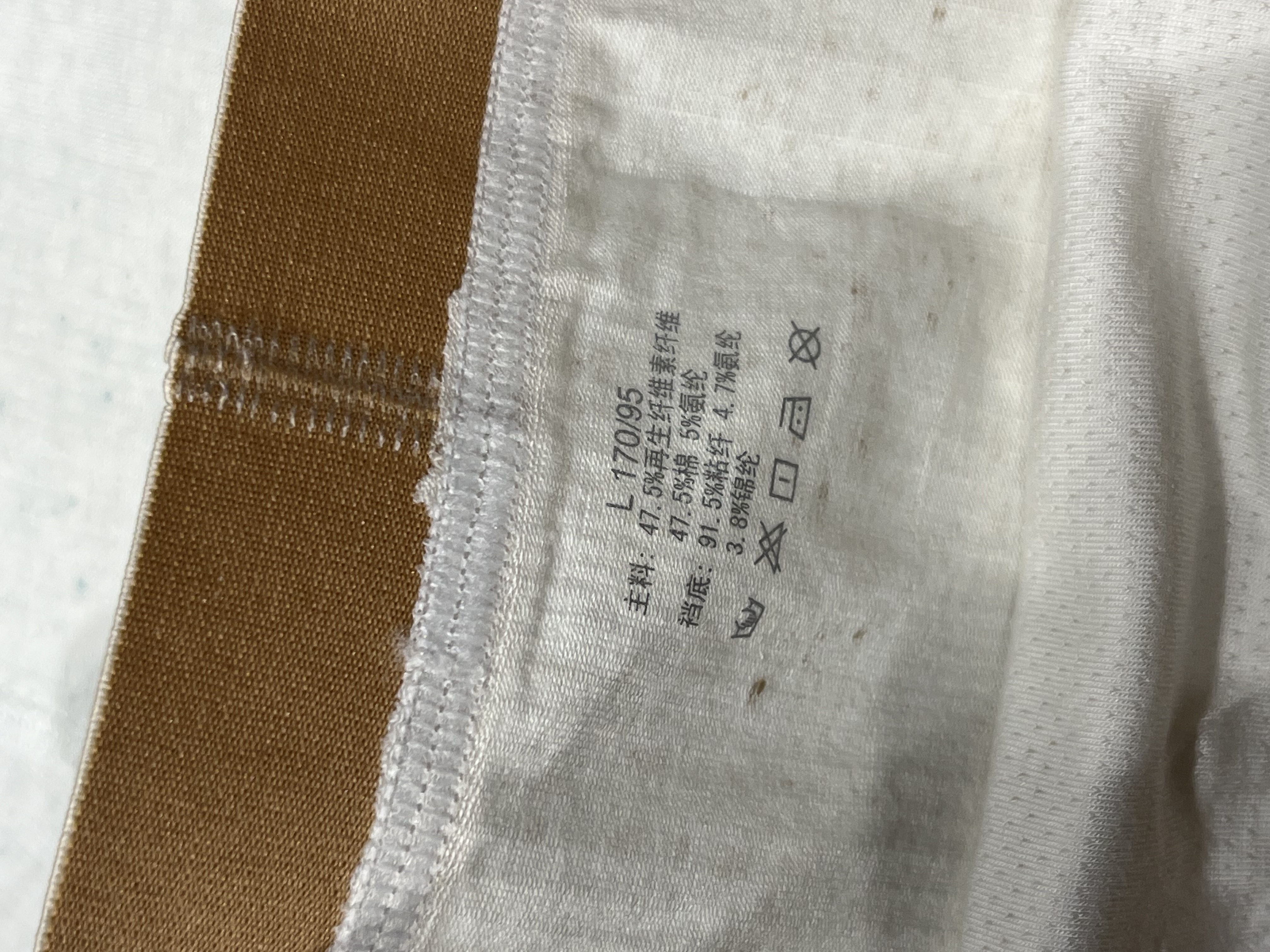 面料成分:47.5%再生纤维,47.5%棉,5%氨纶,内档成分:91.5%粘纤,4.7%氨纶,8%锦纶