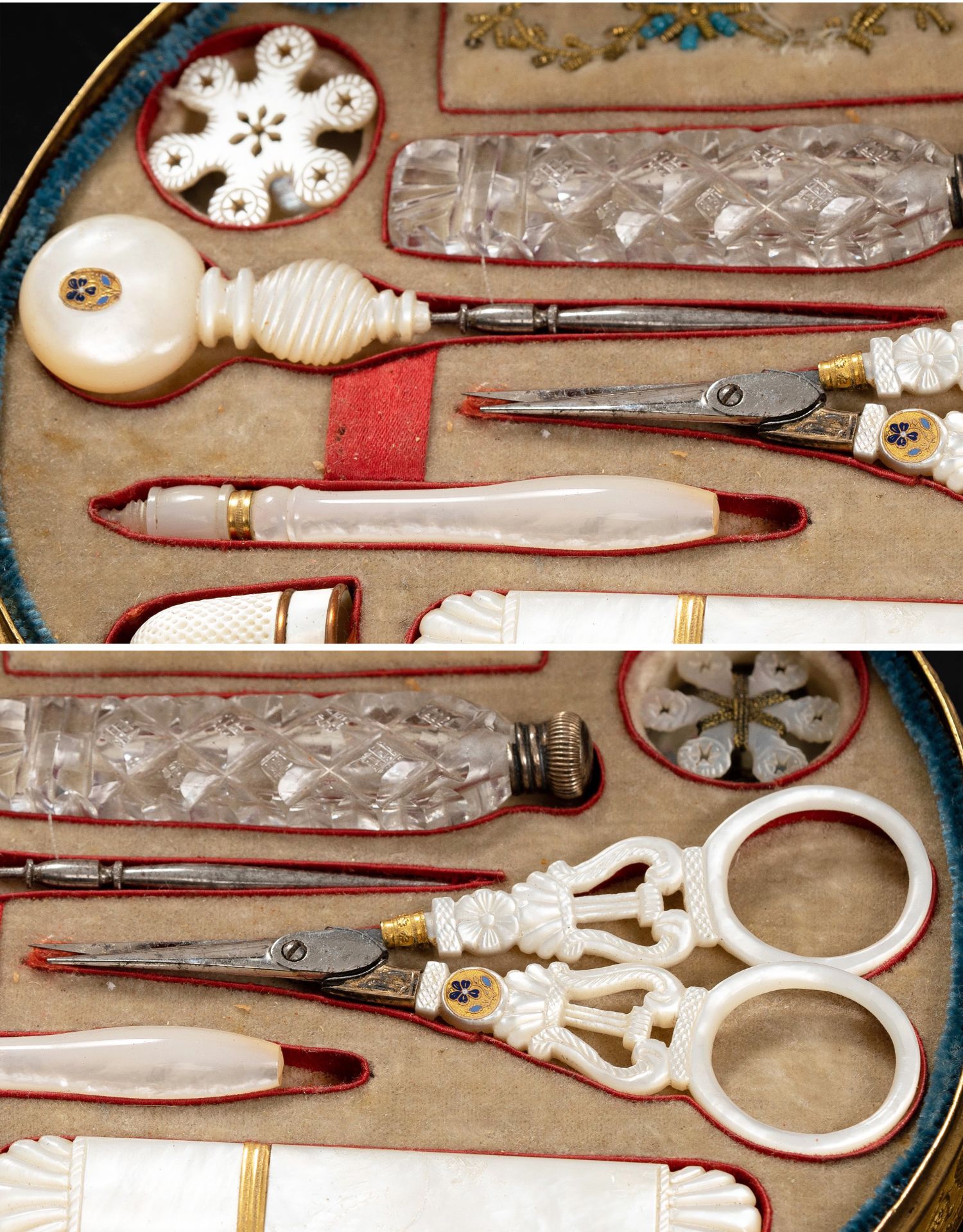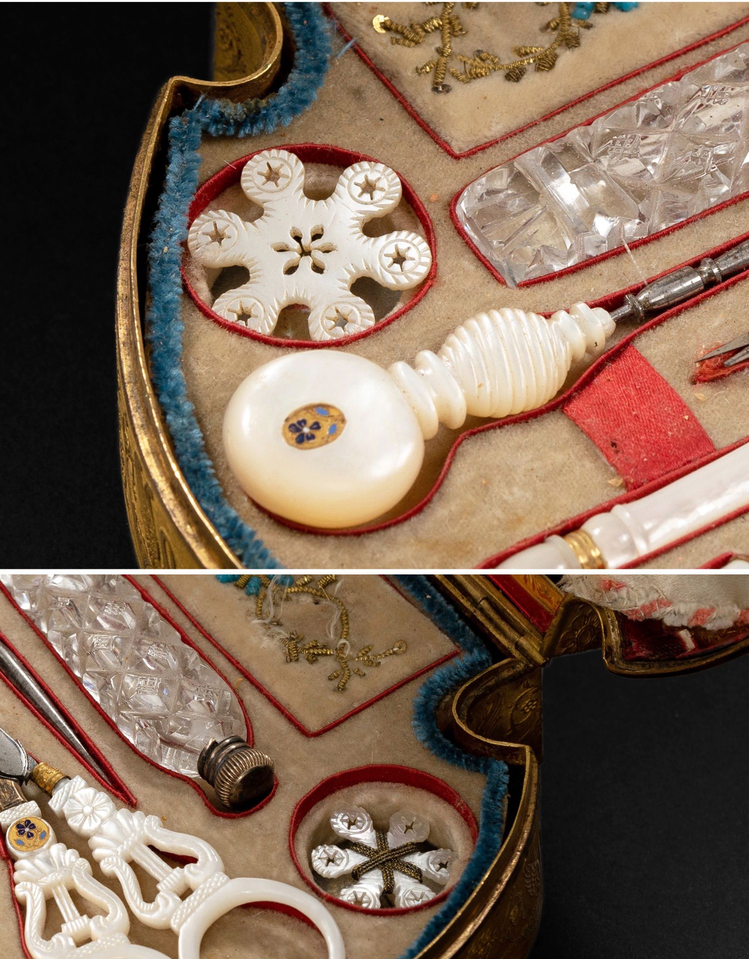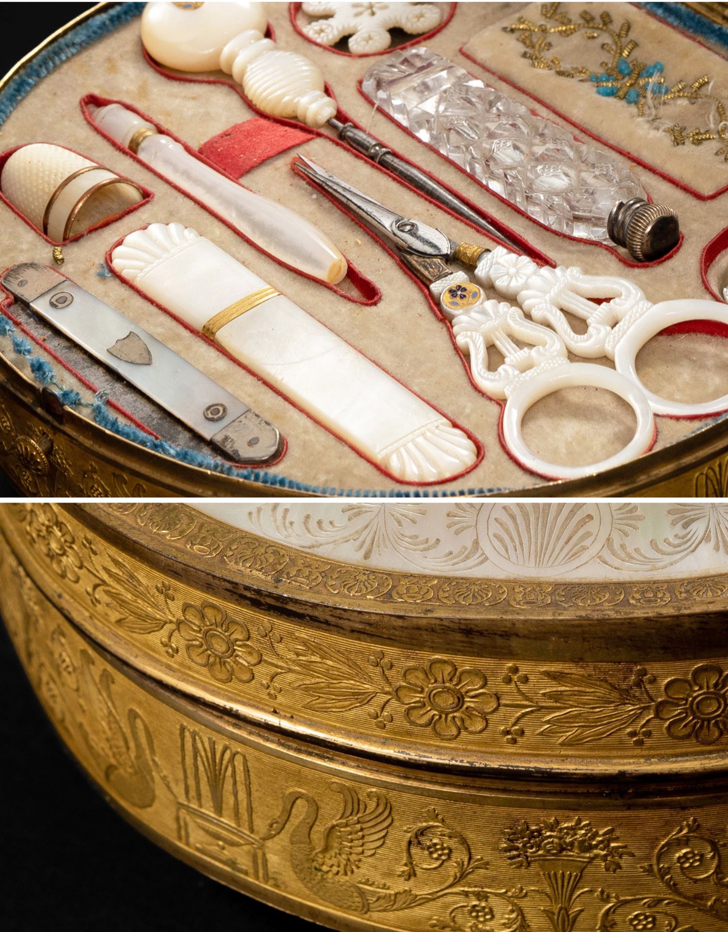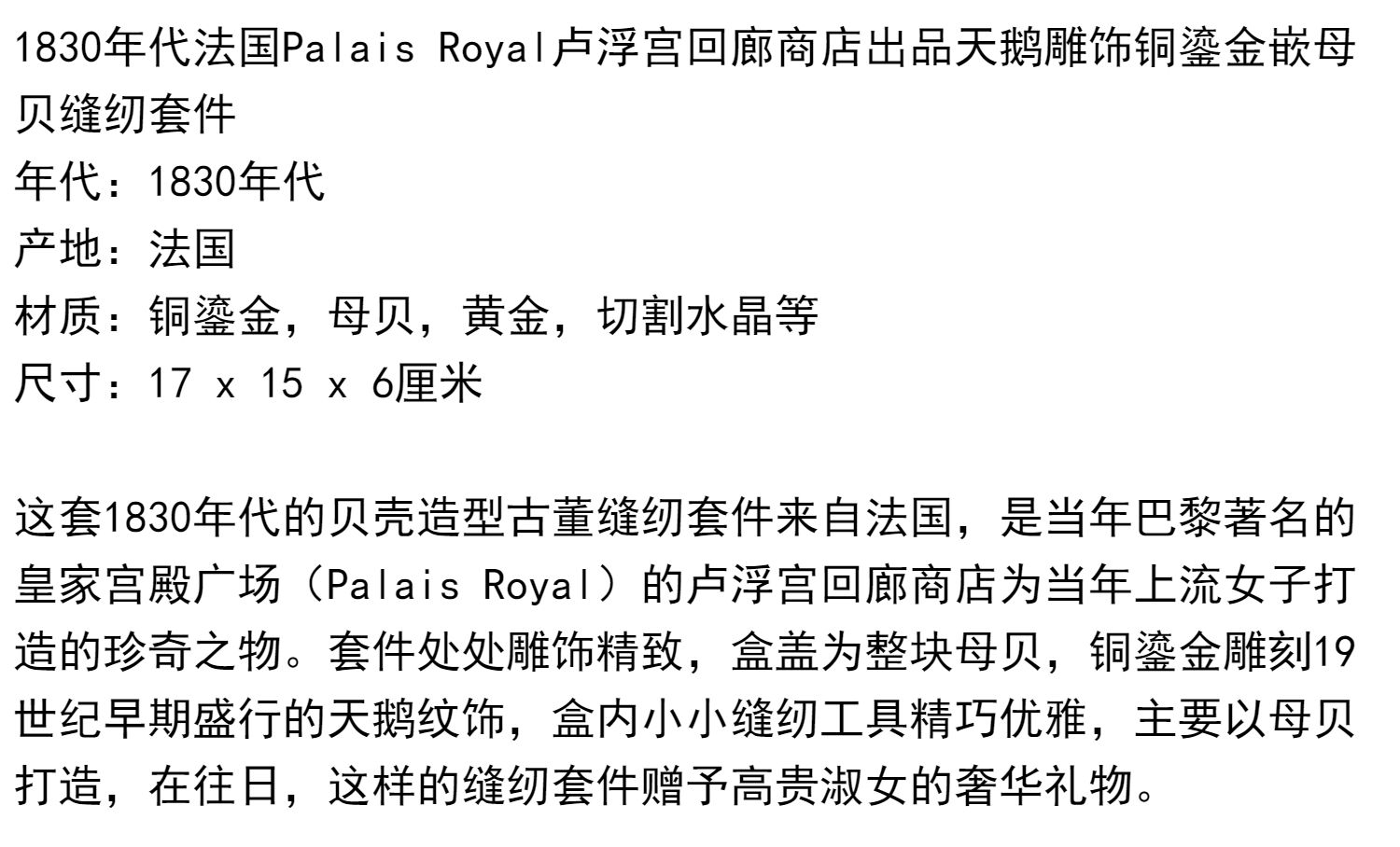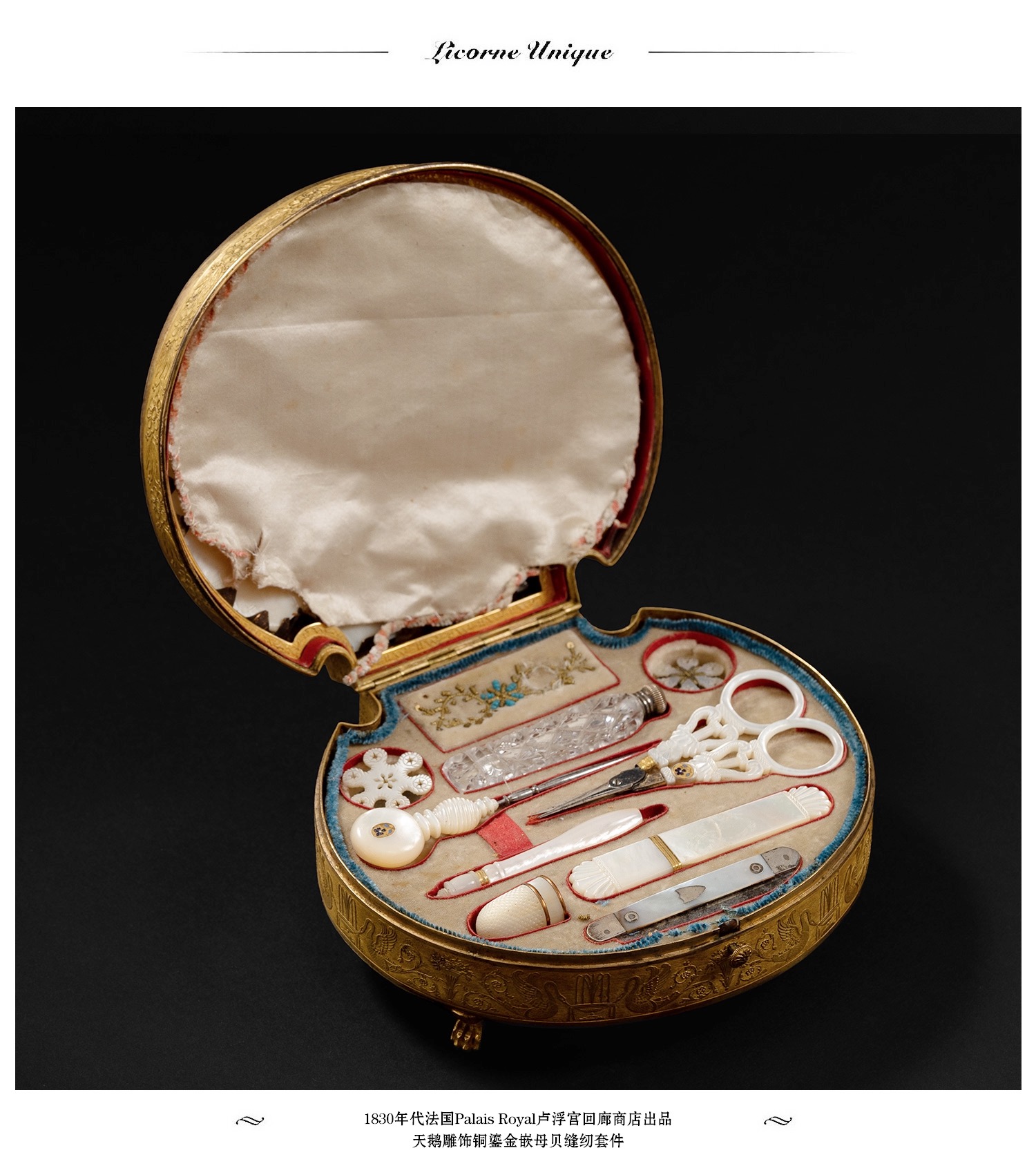 独角鹿西洋古董法国卢浮宫回廊商店天鹅雕饰铜鎏金嵌母贝缝纫套件