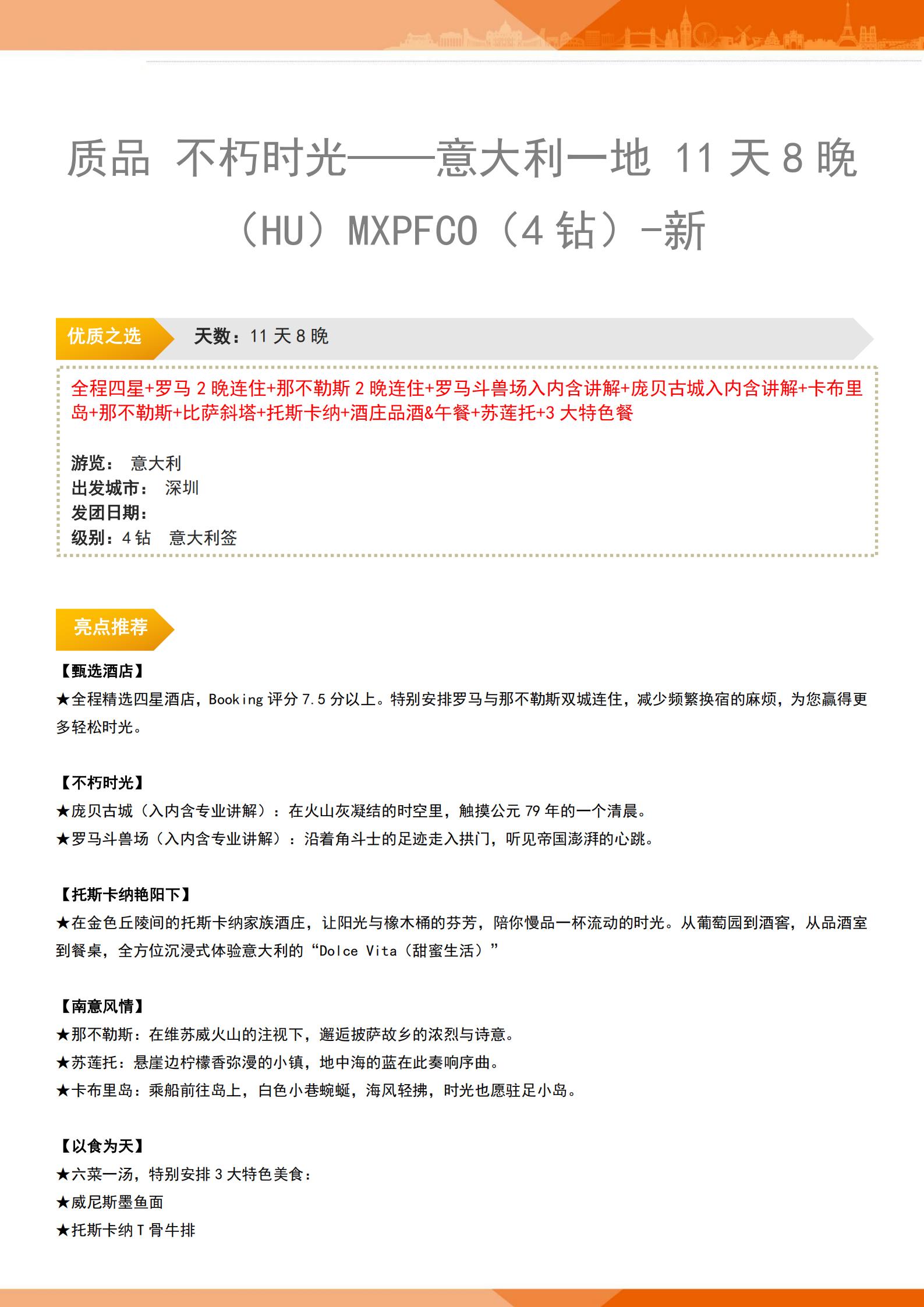 【暑假】<意大利一地11天8晚-深圳直飞往返>全程四星+罗马2晚连住+那不勒斯2晚连住+罗马斗兽场入内含讲解+庞贝古城入内含讲解+卡布里岛+比萨斜塔+托斯卡纳+酒庄品酒&午餐+苏莲托+3大特色餐
