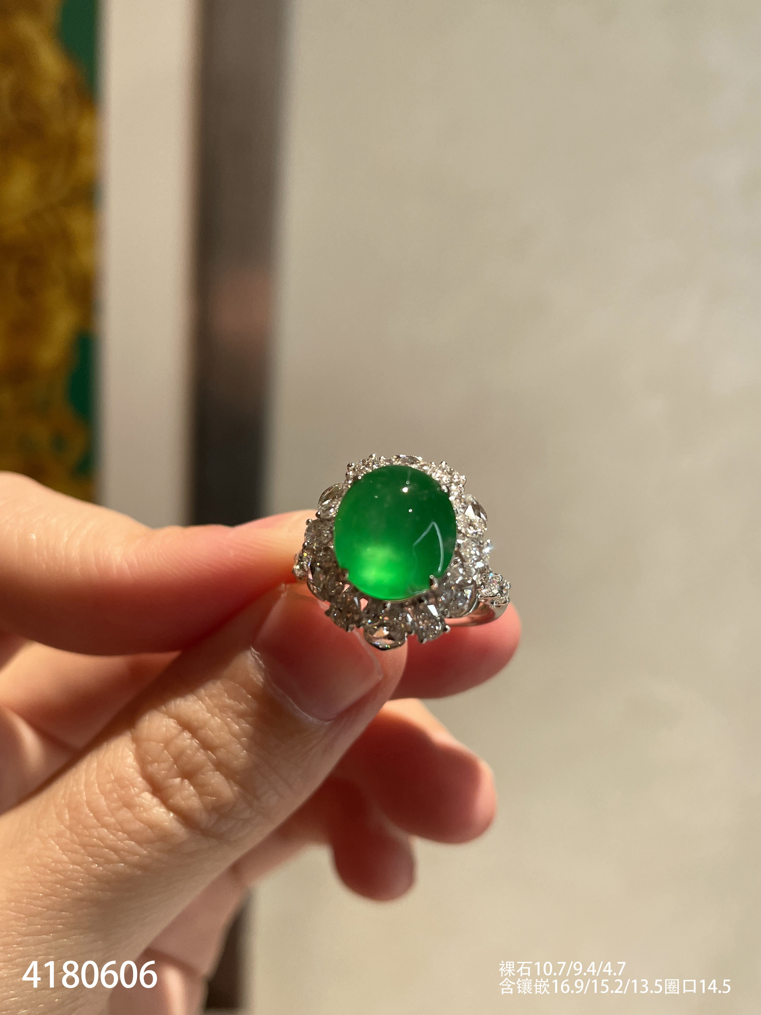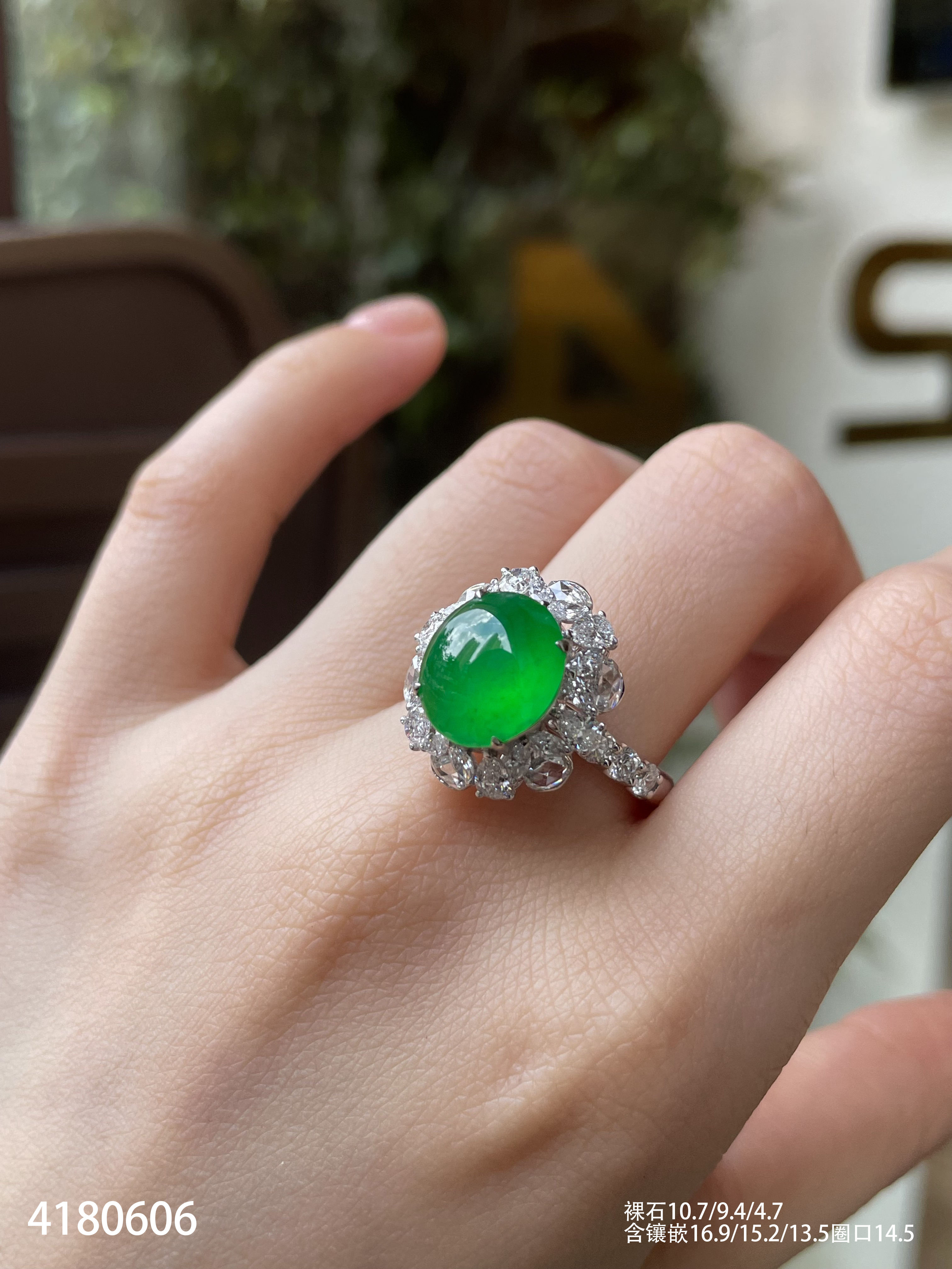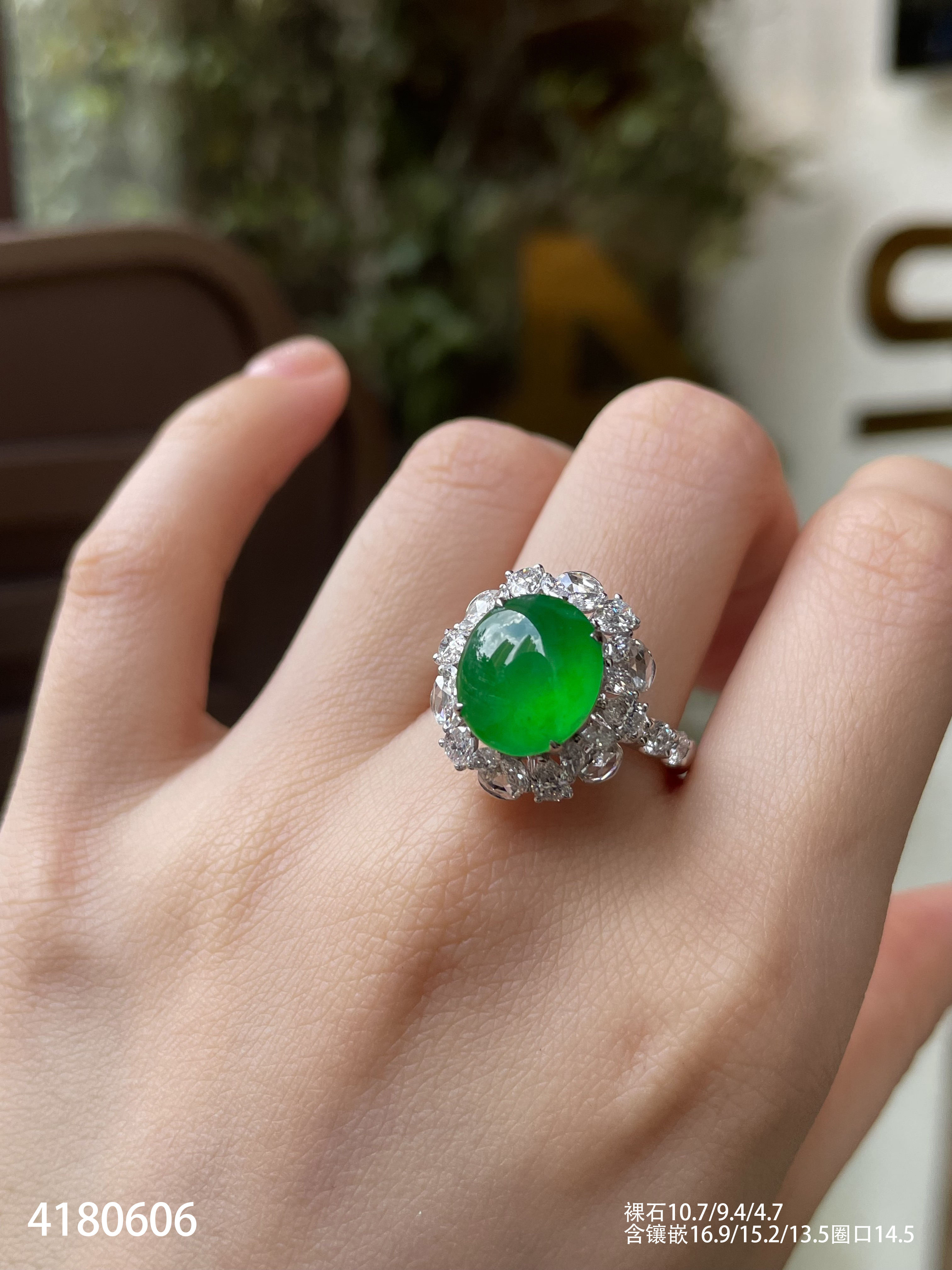 近玻璃种阳艳绿蛋面戒指【4180606】具体价格微信咨询