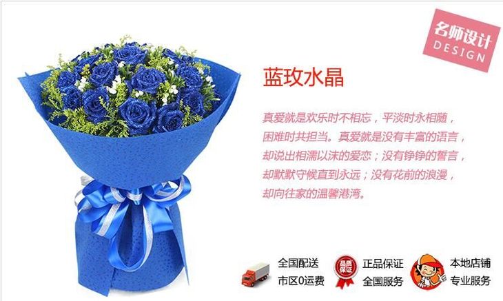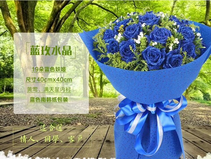 花材:19朵蓝玫瑰,点缀黄莺,相思梅