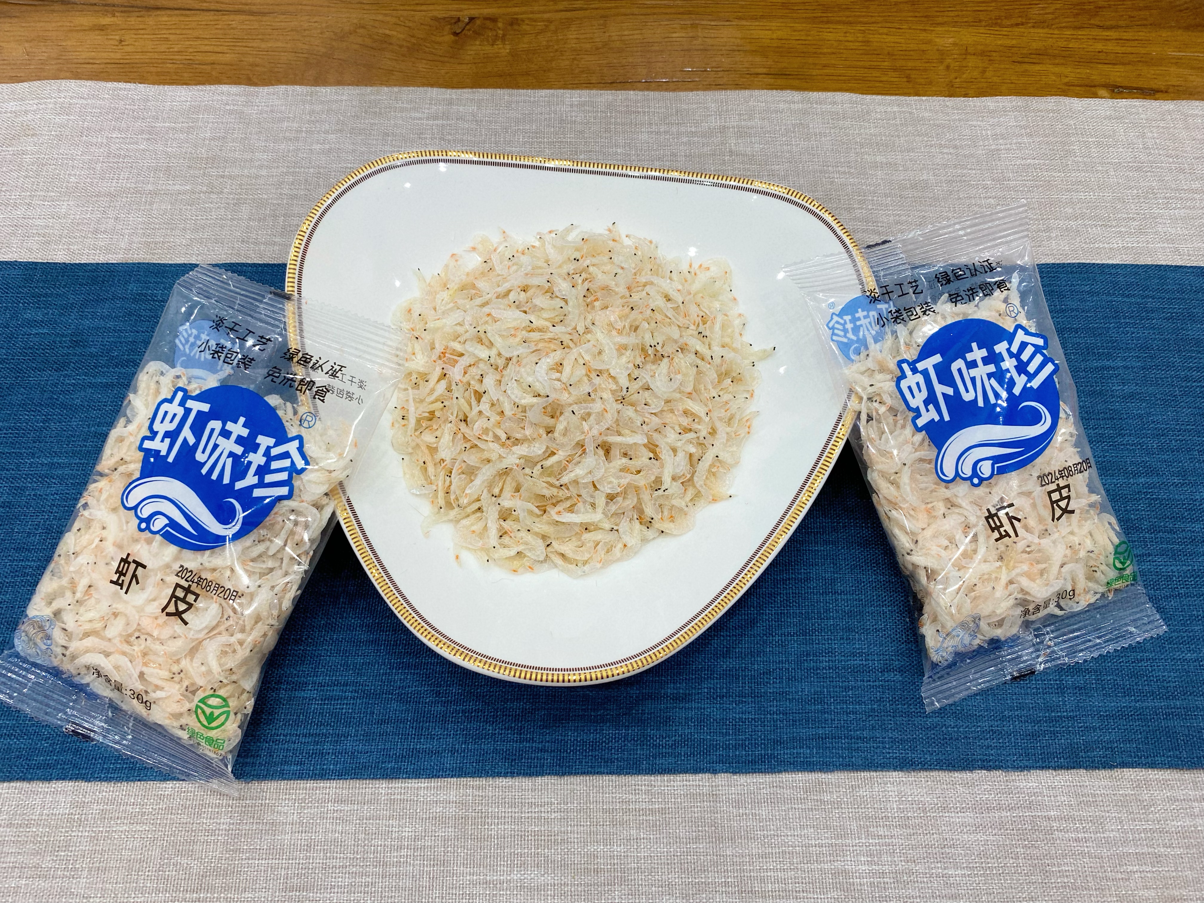 虾味珍®虾皮精选优质毛虾, 淡干工艺,每个虾身完整, 肉质鲜嫩,体色通透,干净无杂质, 保留了虾皮的鲜美和营养,免洗即食。