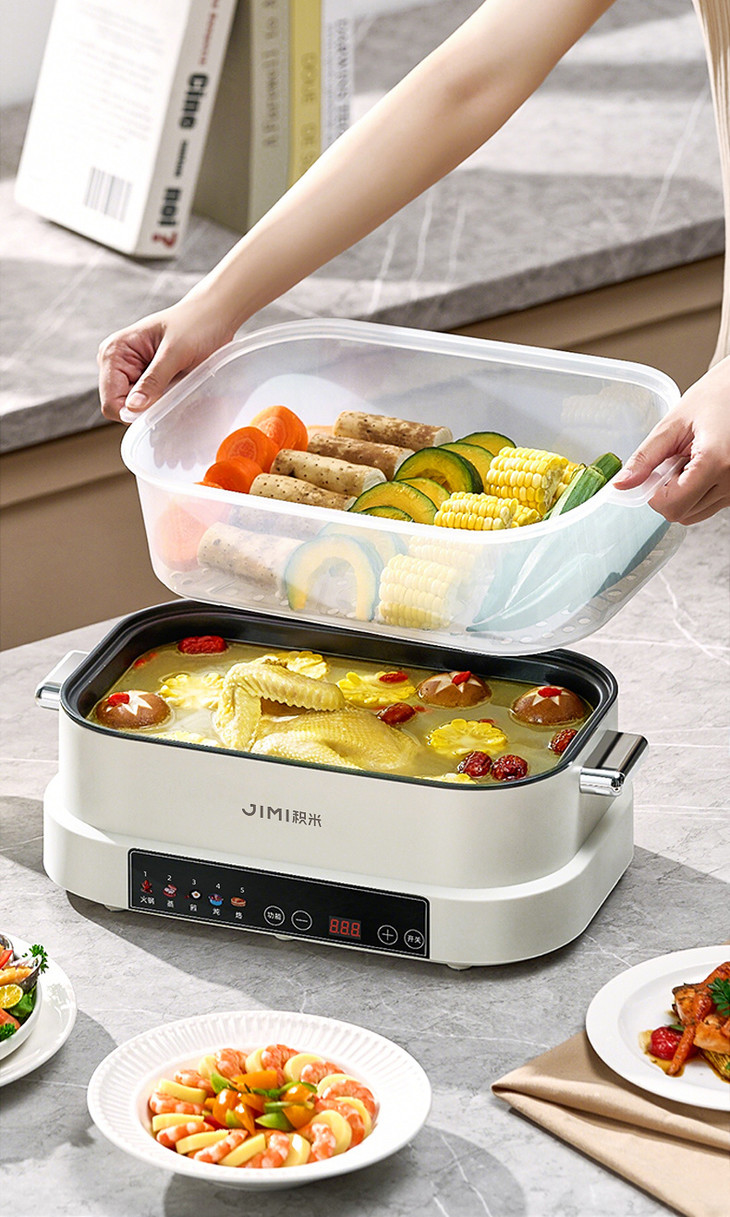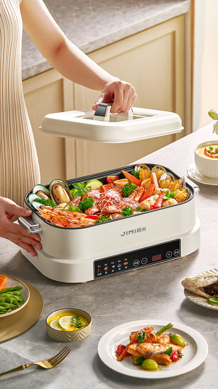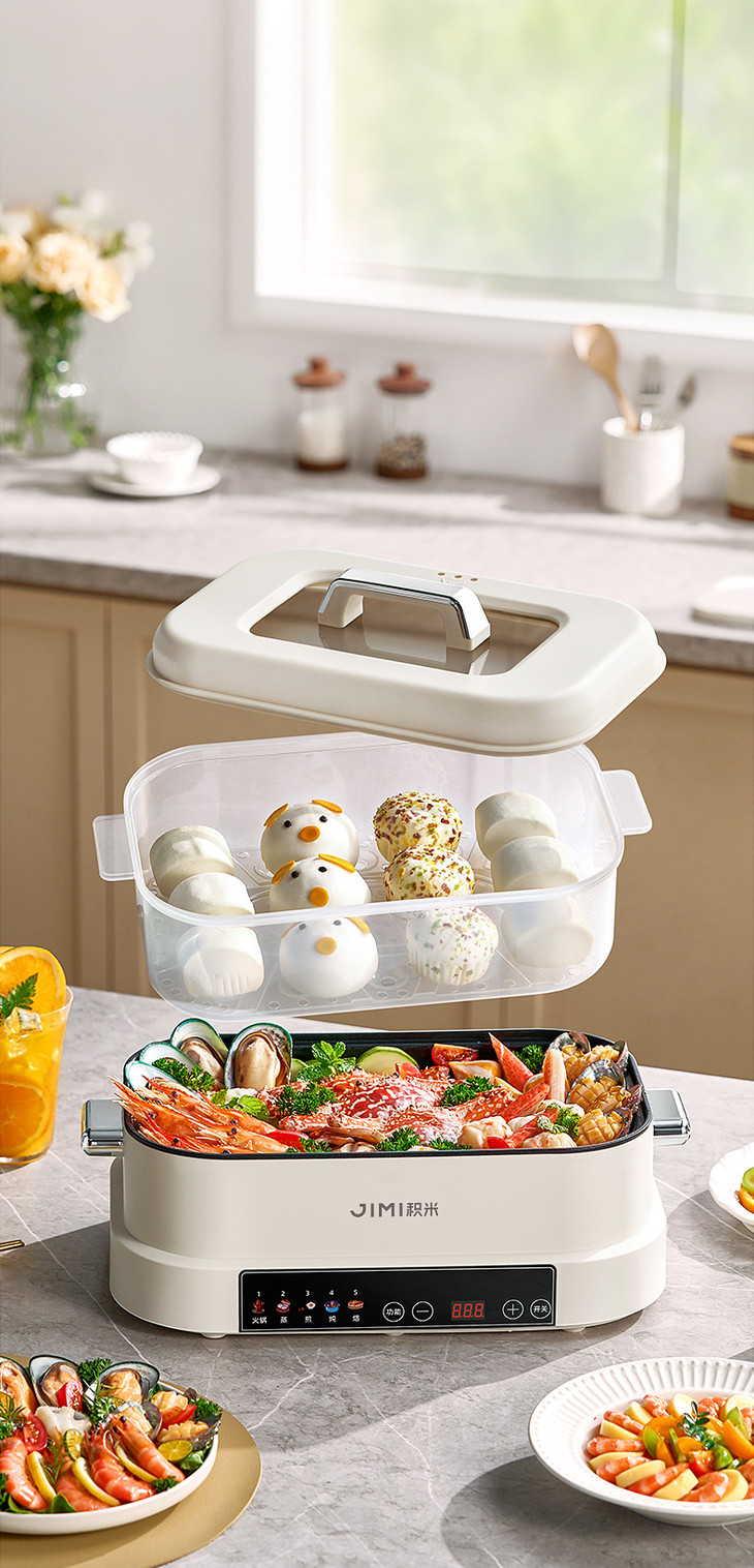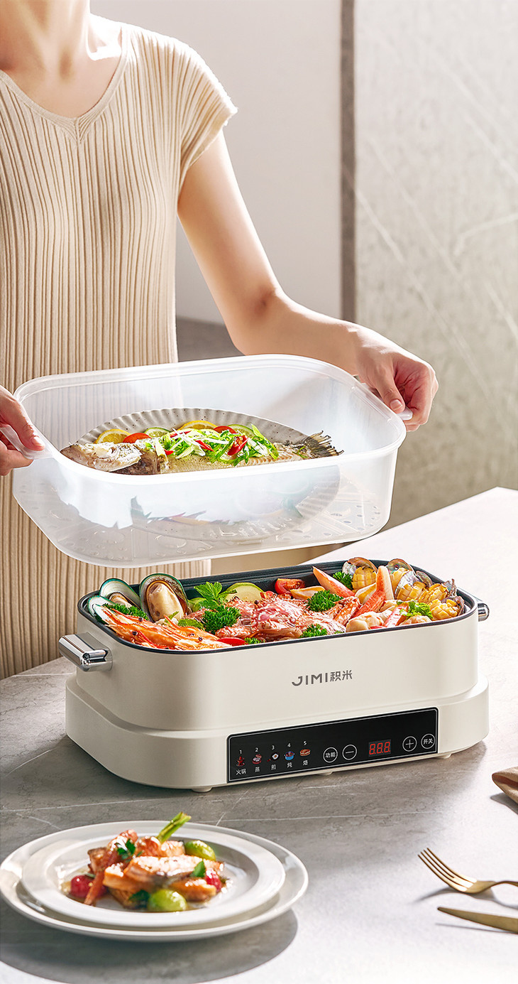 积米大容量多功能电蒸火锅家用蒸煮炒一体锅