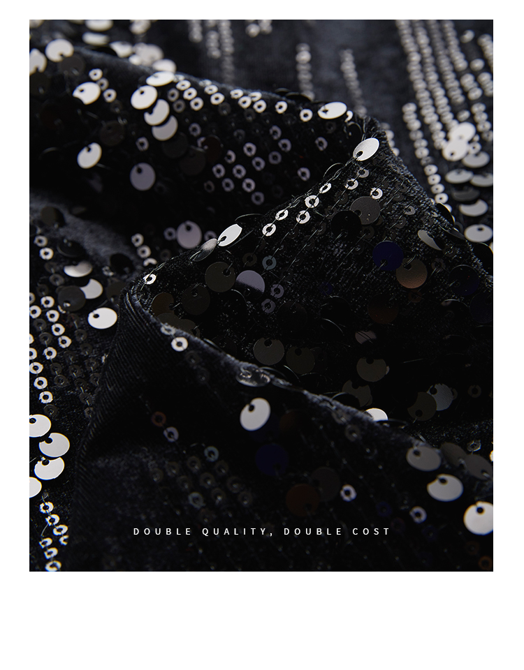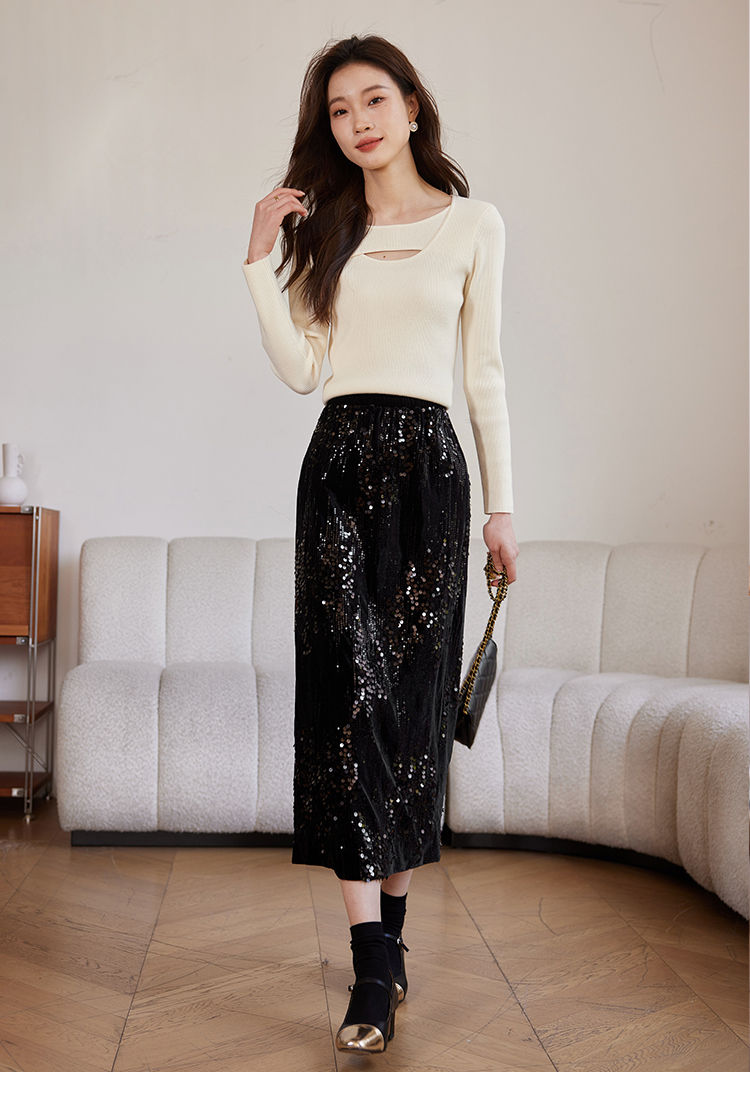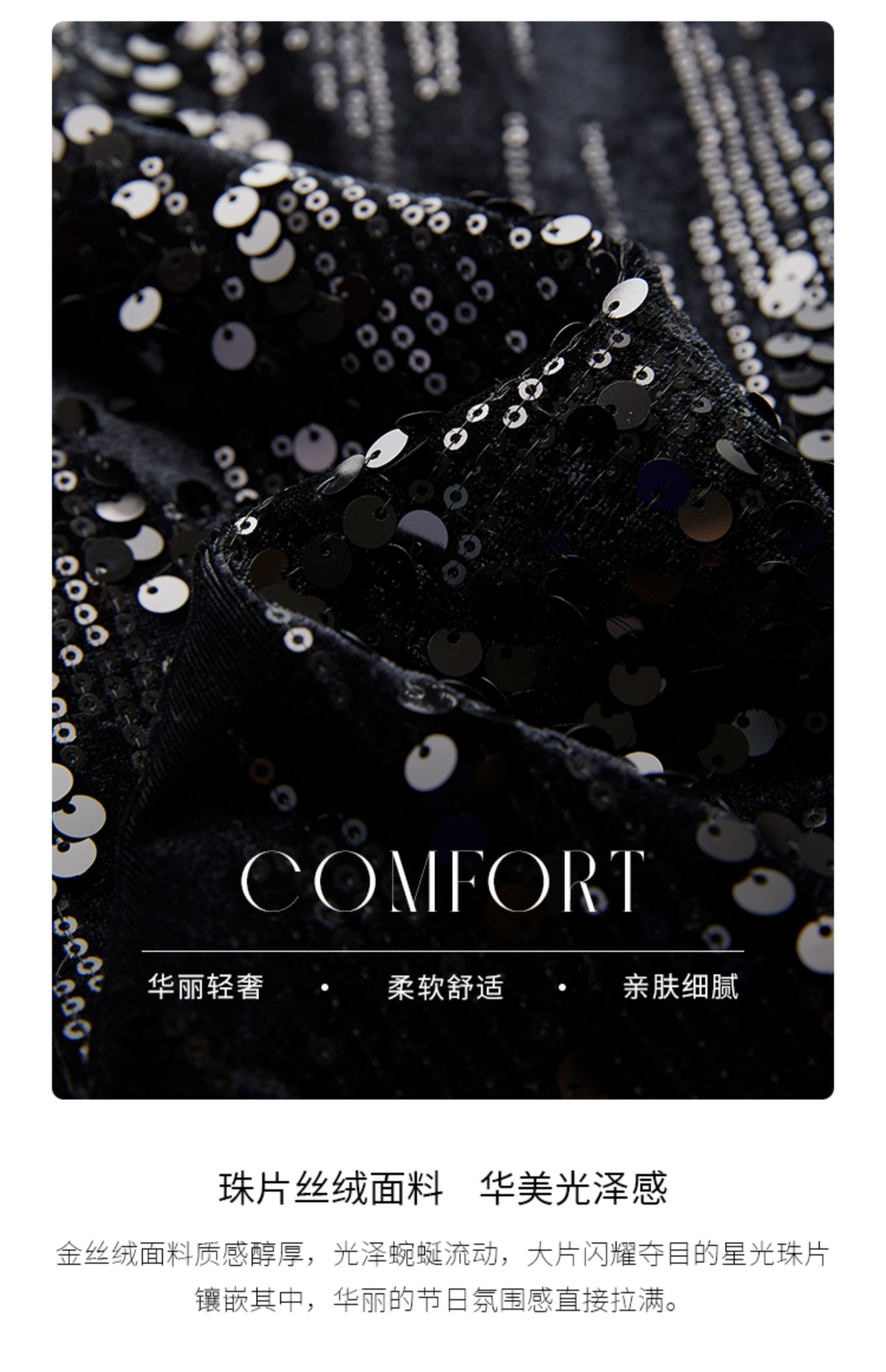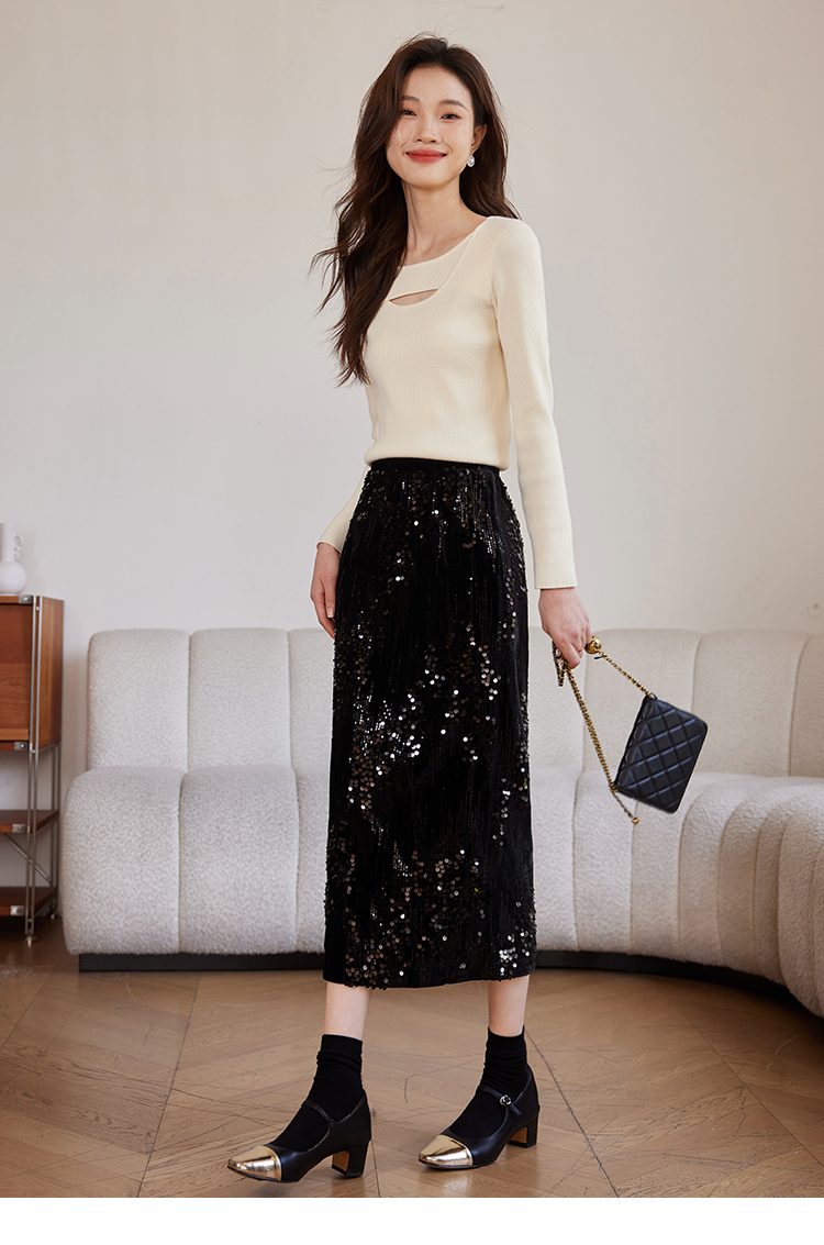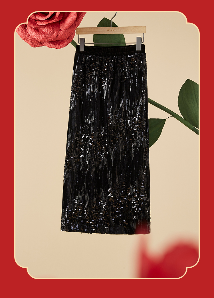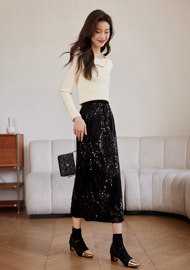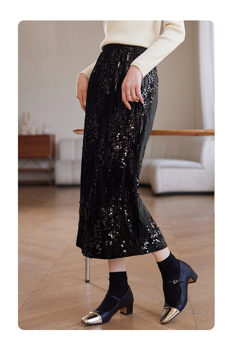 【年终特卖】熙世界亮片丝绒半身裙中长款女秋冬高腰黑色显瘦后开叉直筒包臀裙