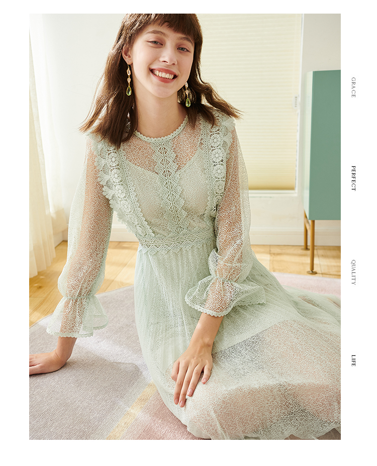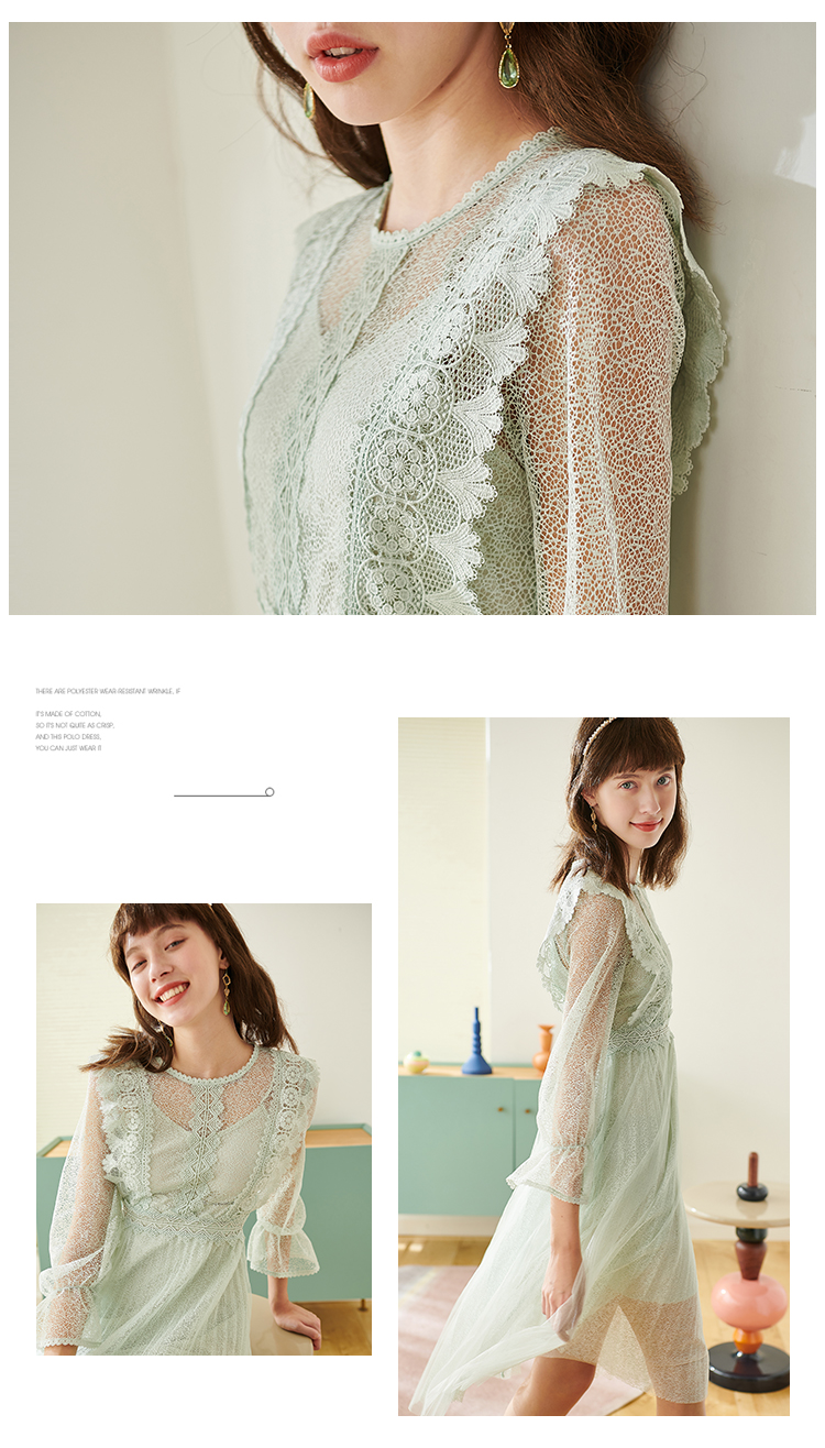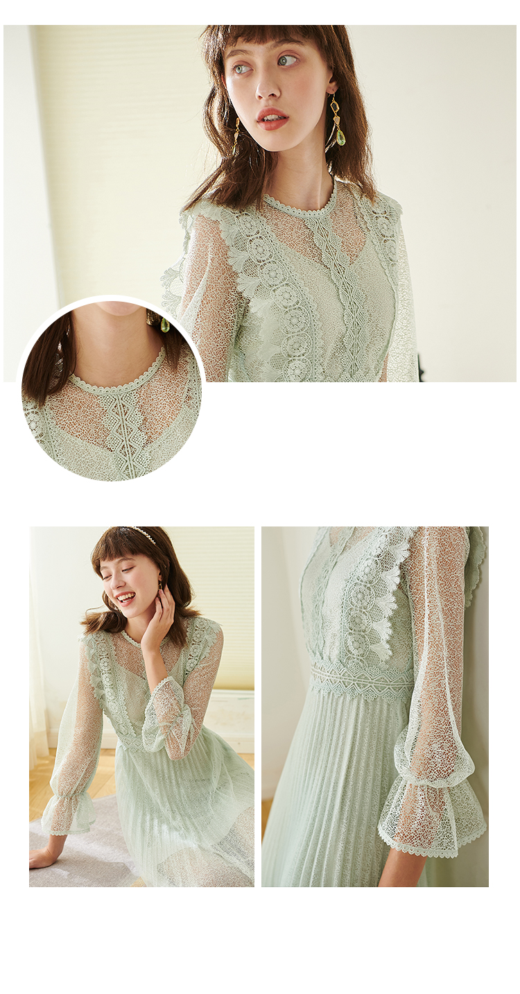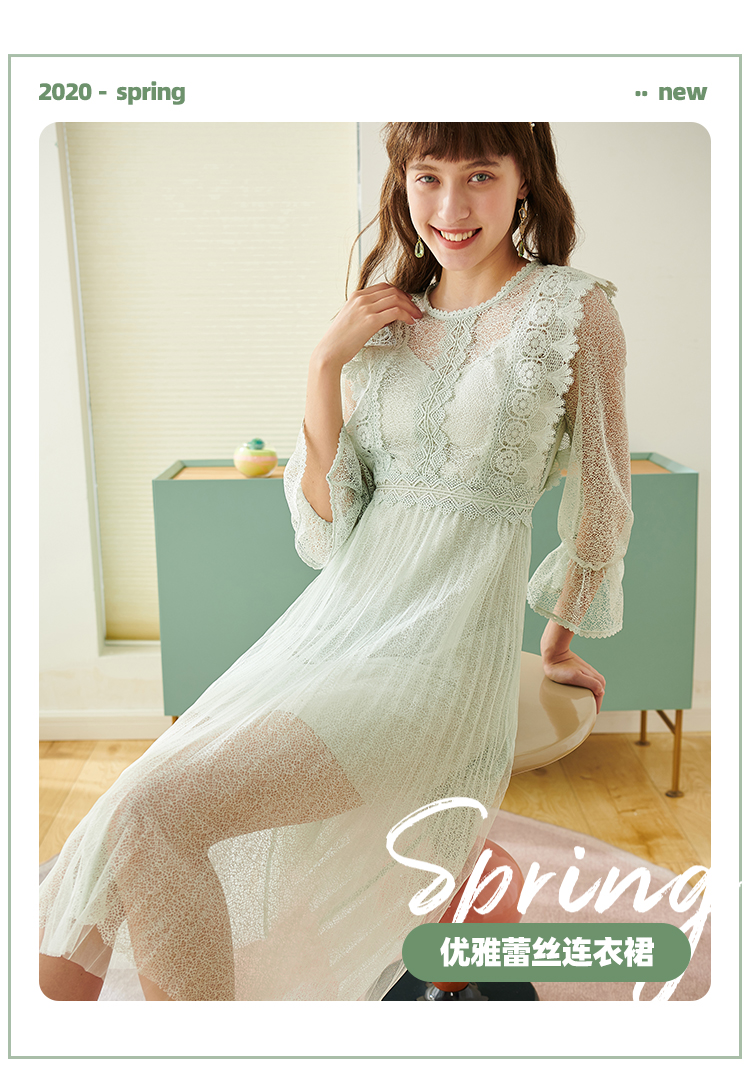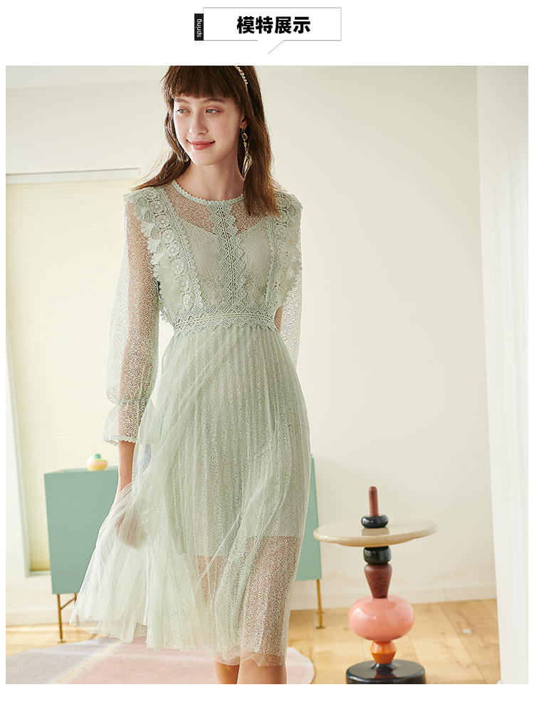 欧芮儿春夏装新款七分袖圆领蕾丝连衣裙女中长款网纱裙气质