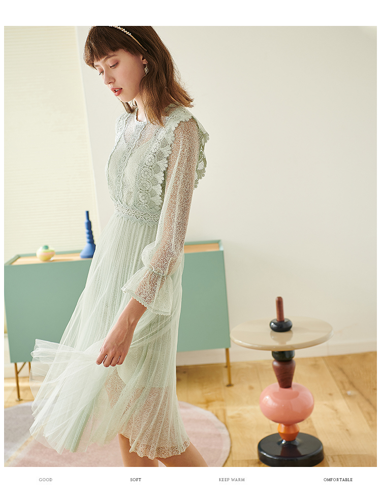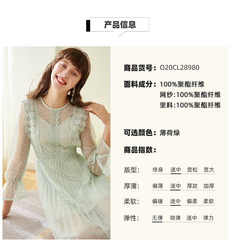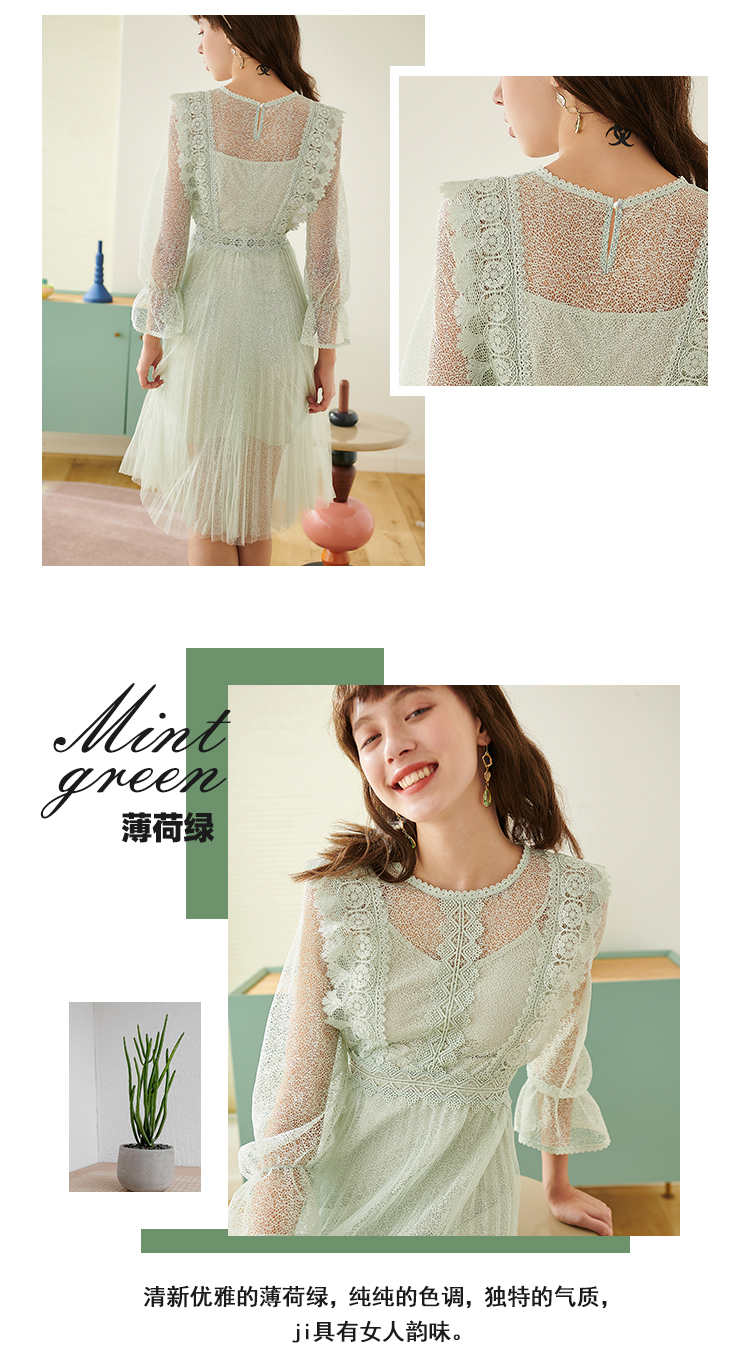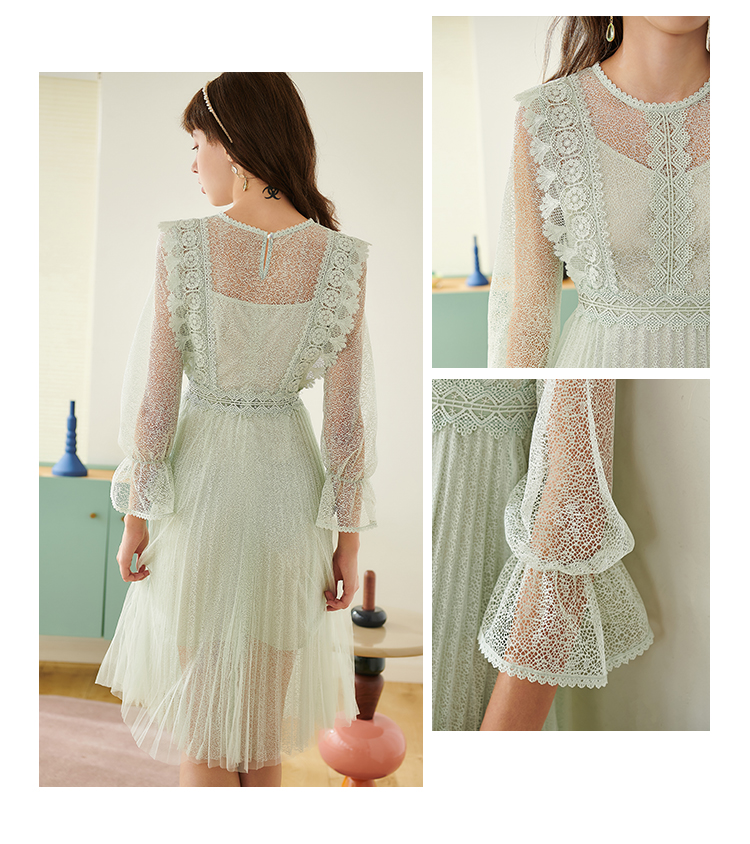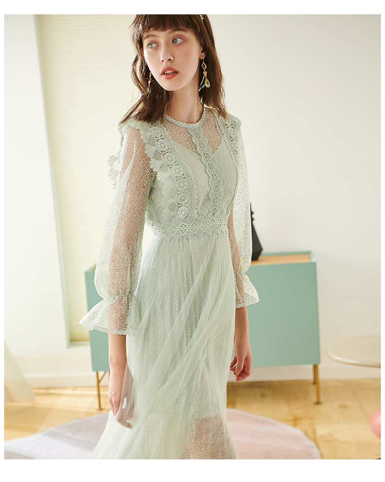 欧芮儿春夏装新款七分袖圆领蕾丝连衣裙女中长款网纱裙气质