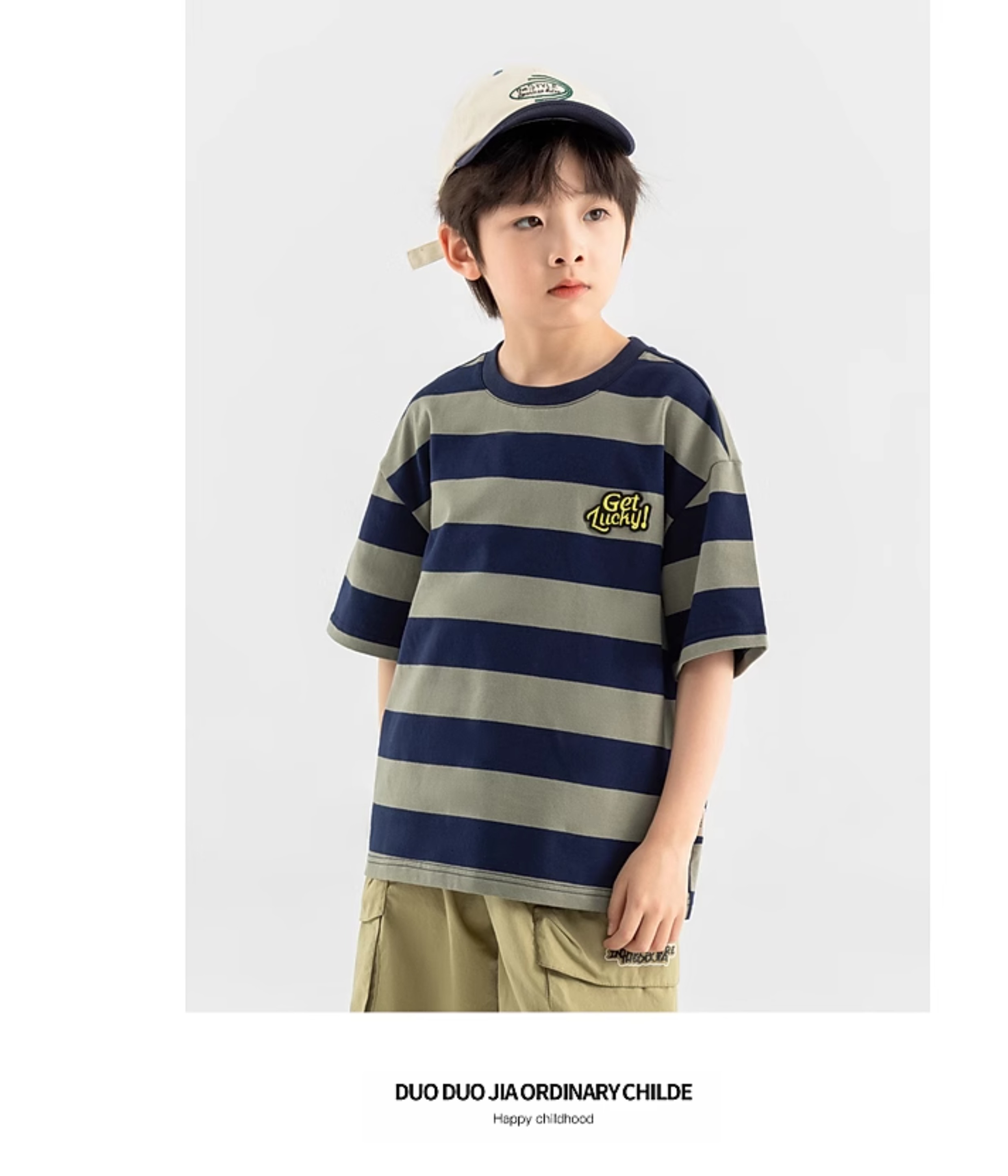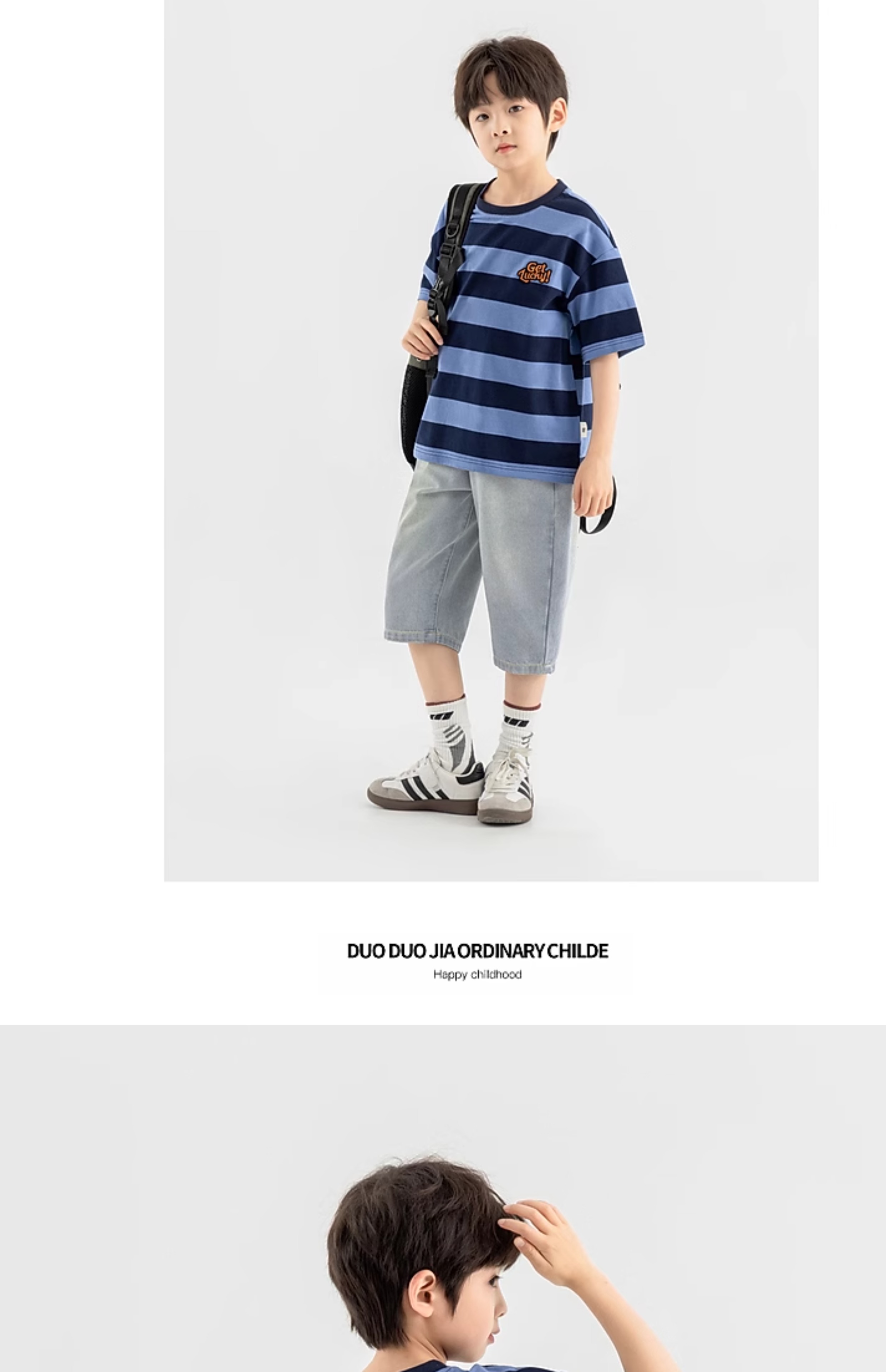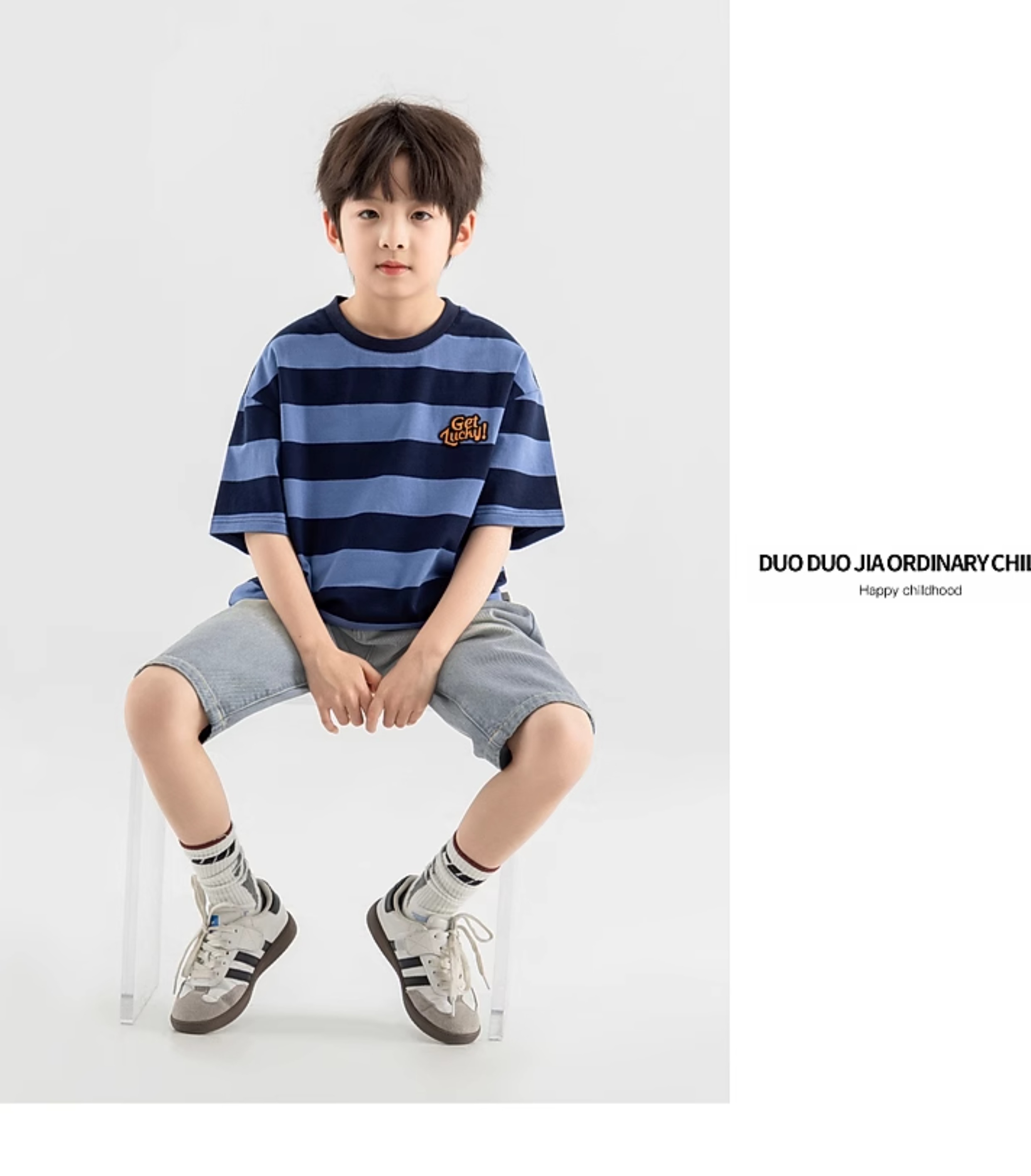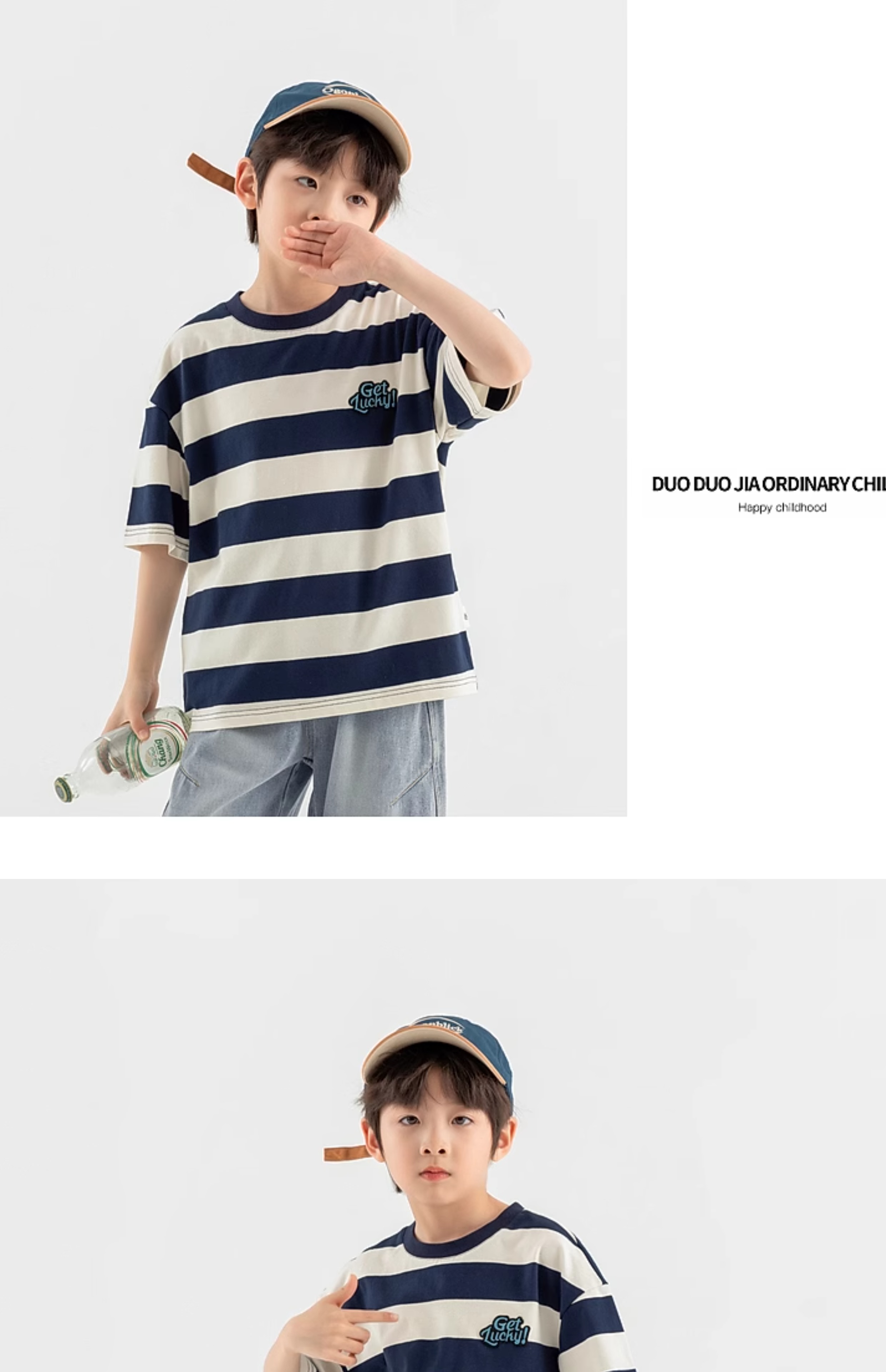 【团购价39.9-49.9】多多家男童条纹短袖T恤2025夏季新款儿童中大童半袖印花宽松上衣10803