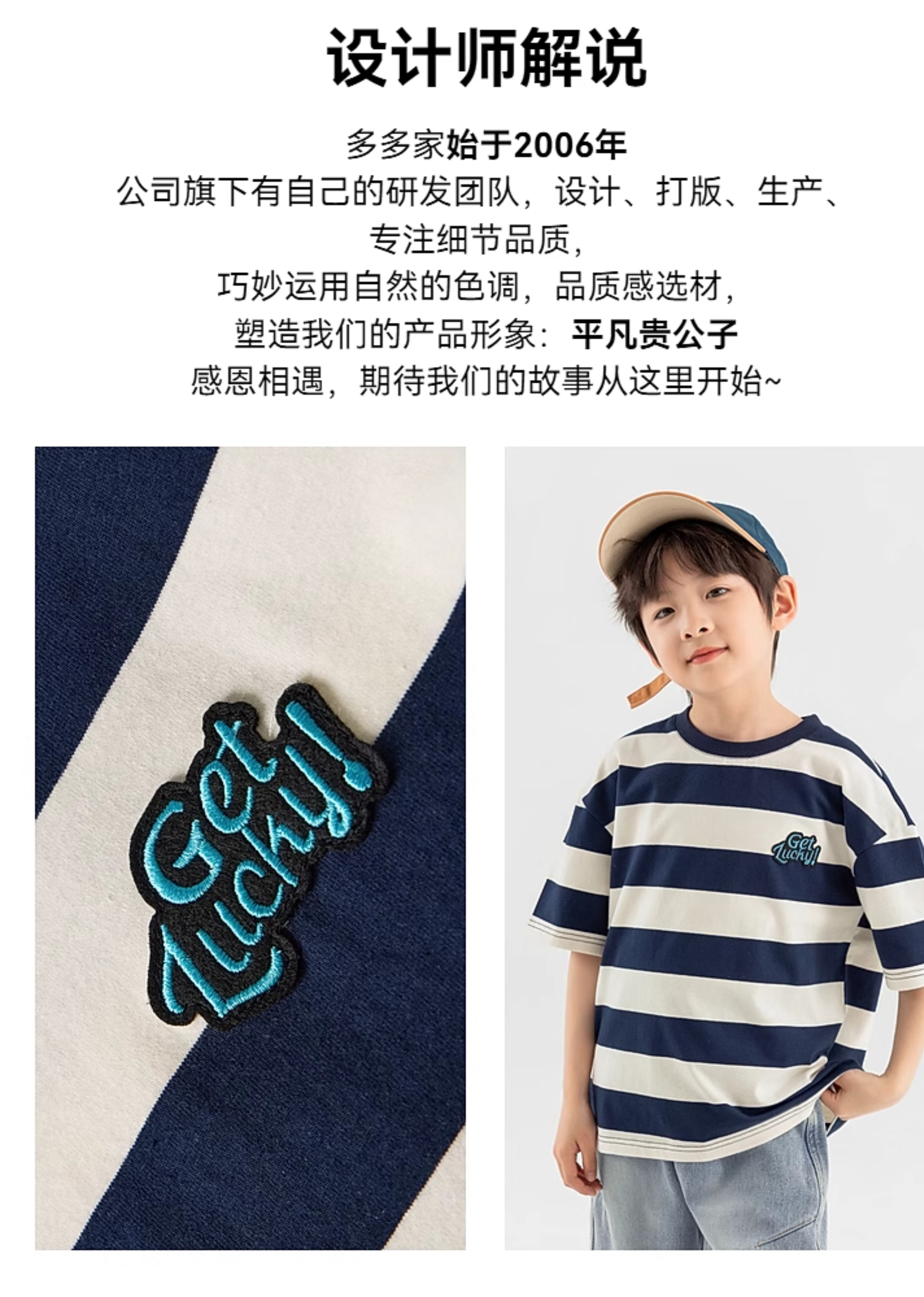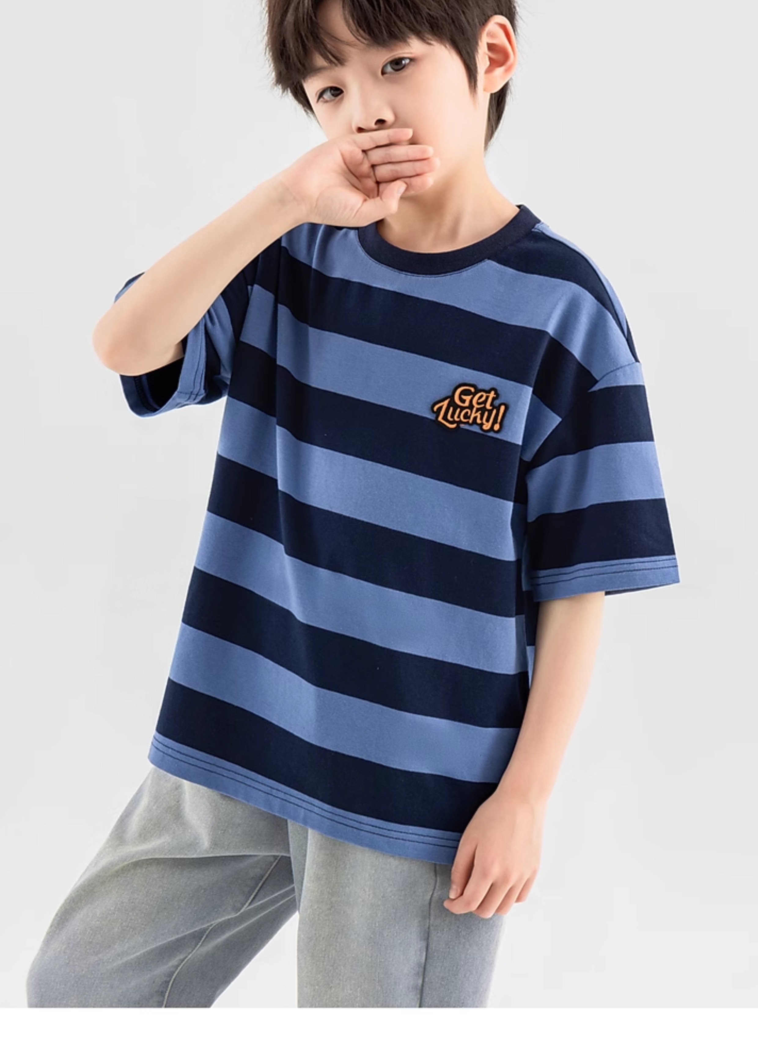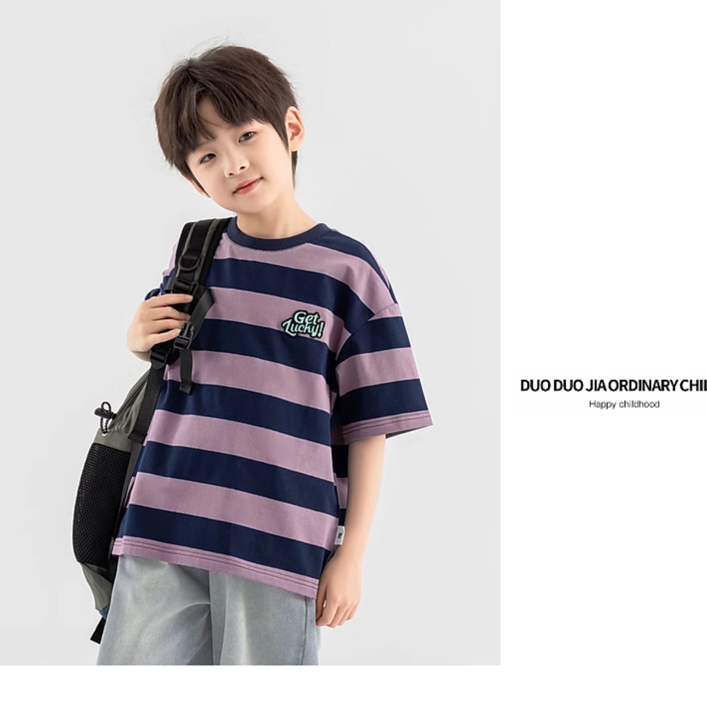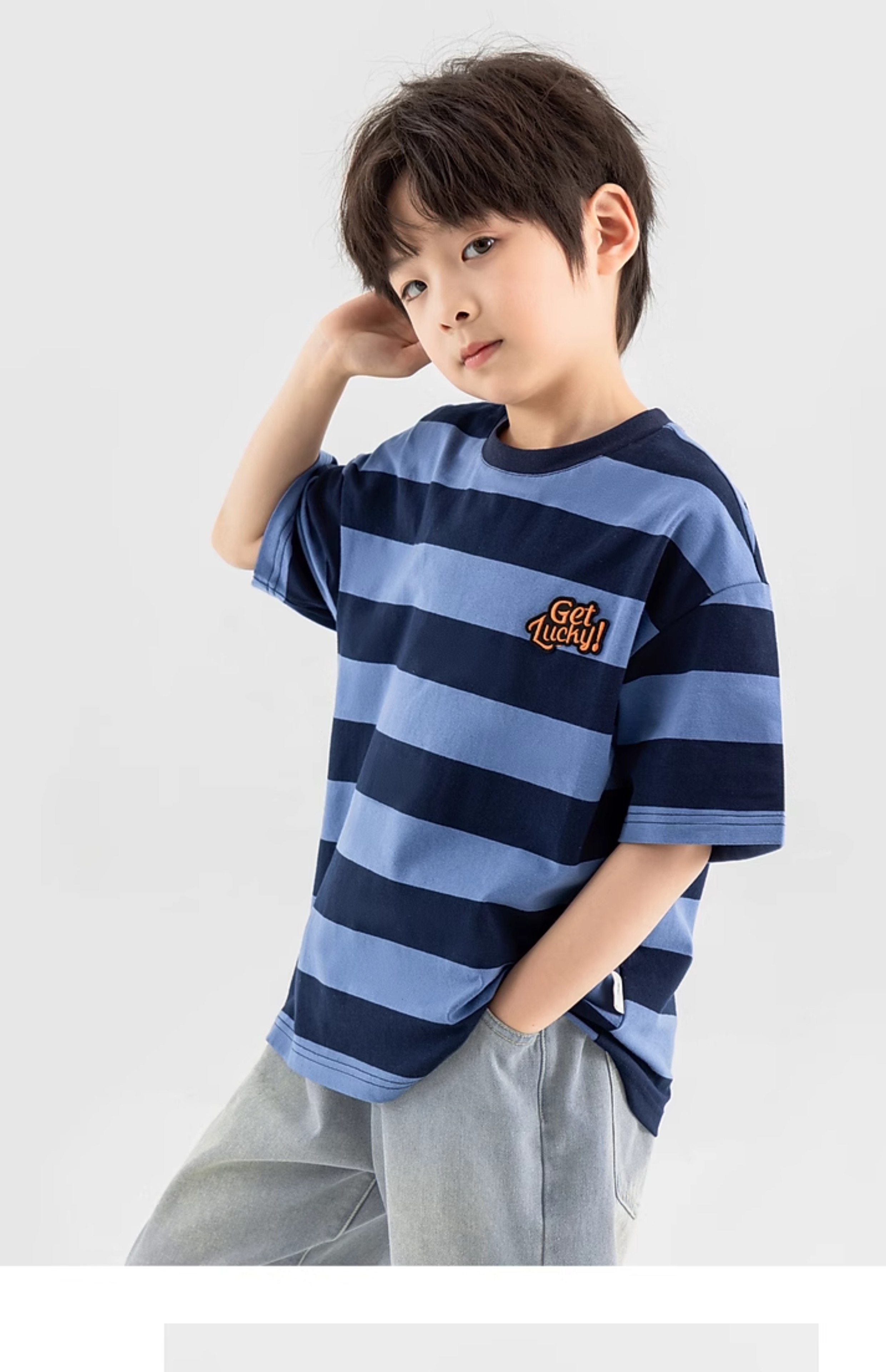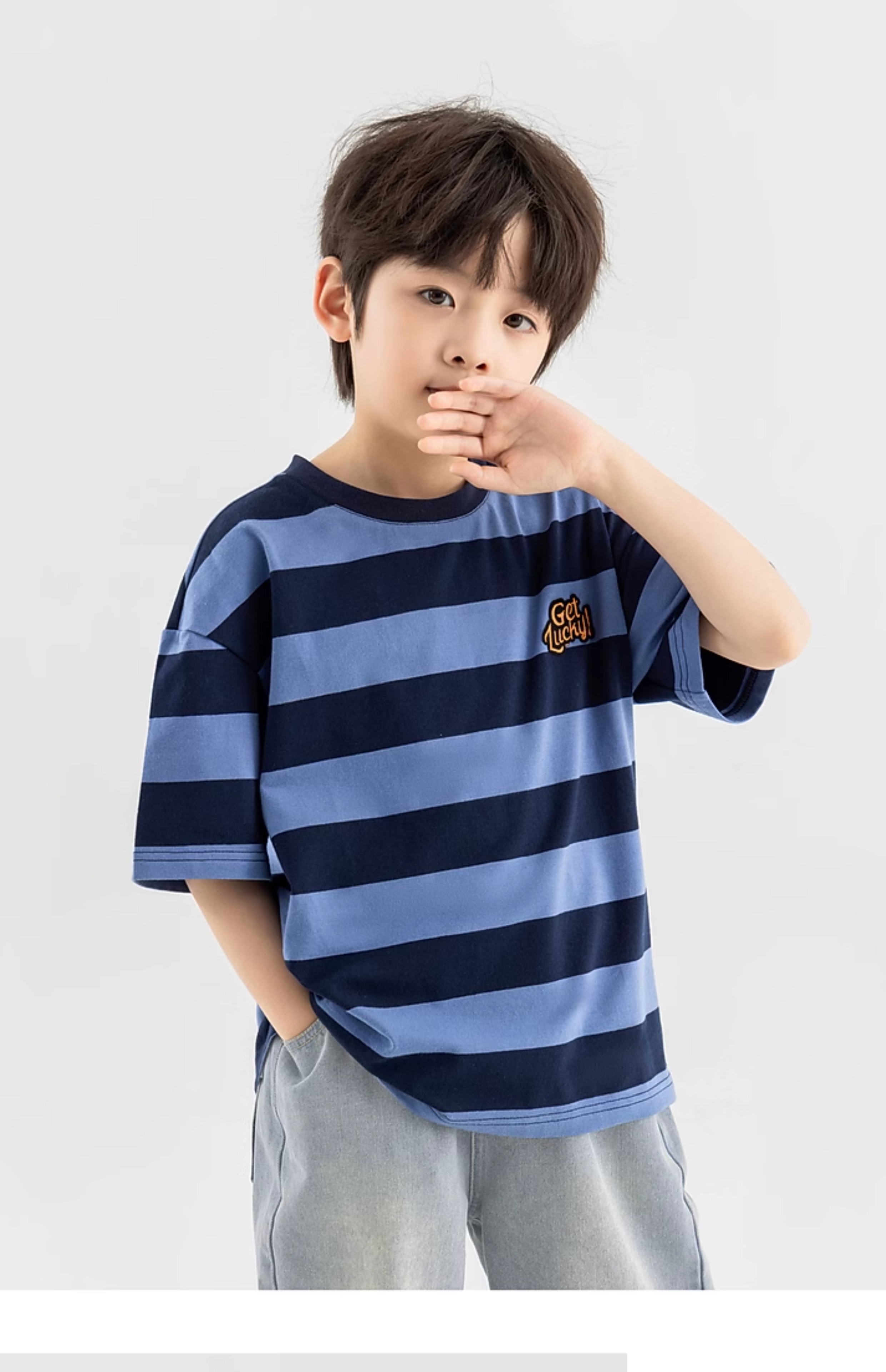 【团购价39.9-49.9】多多家男童条纹短袖T恤2025夏季新款儿童中大童半袖印花宽松上衣10803