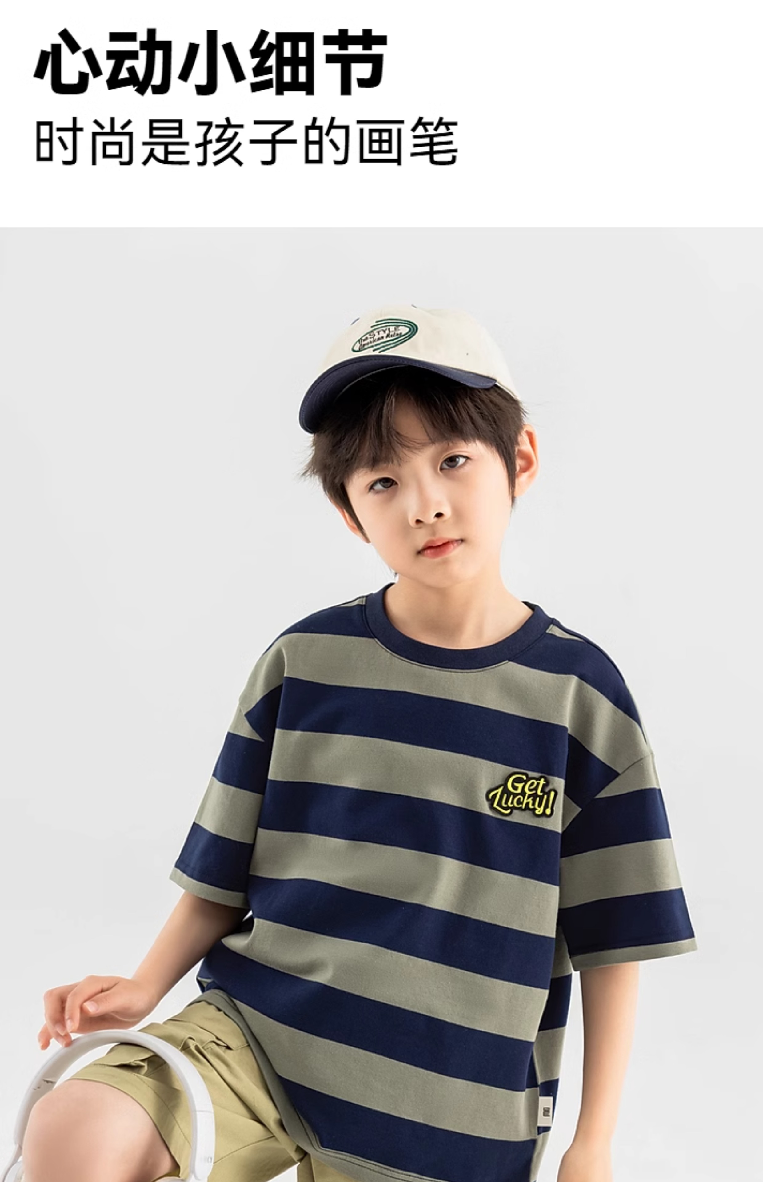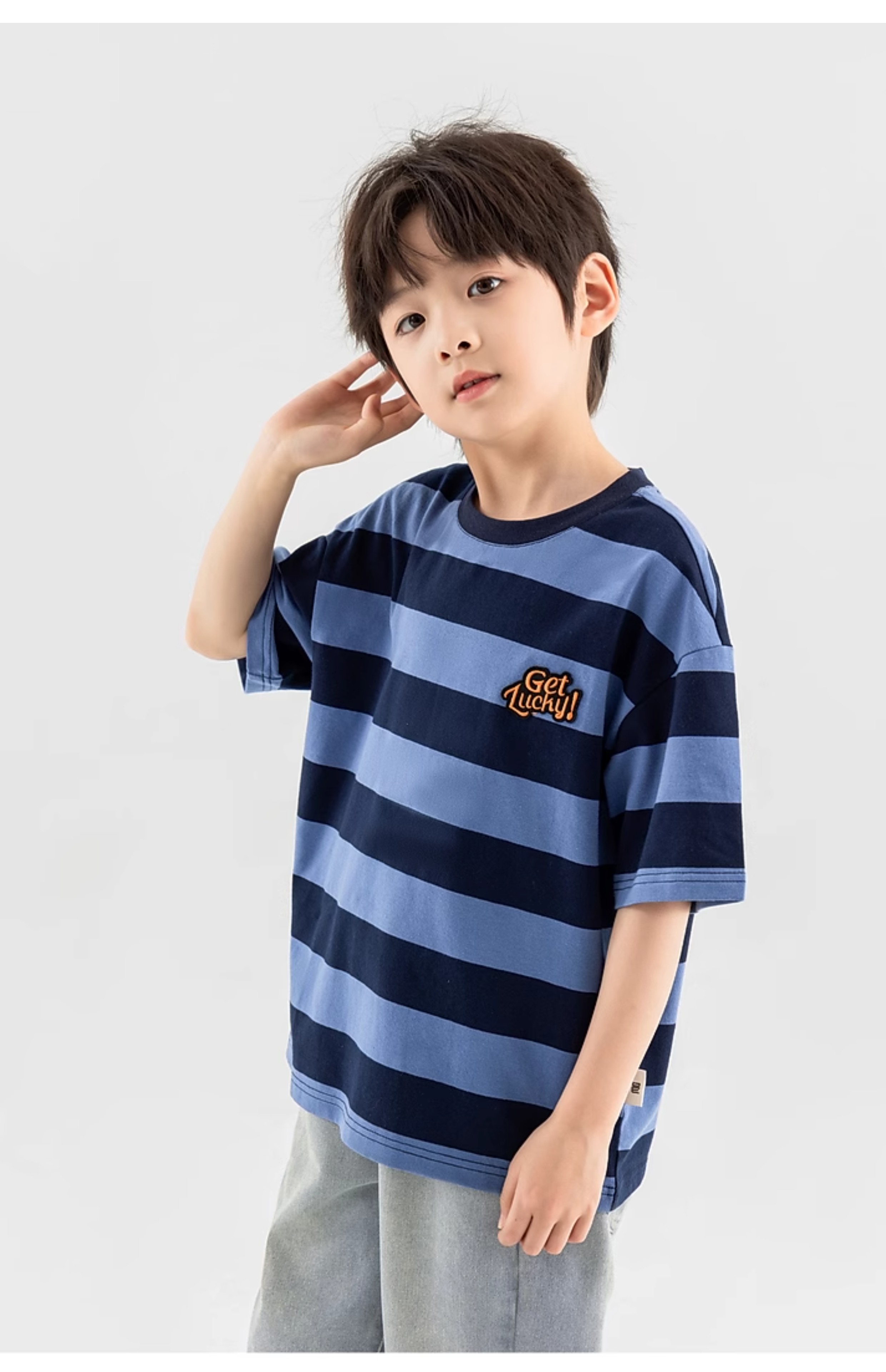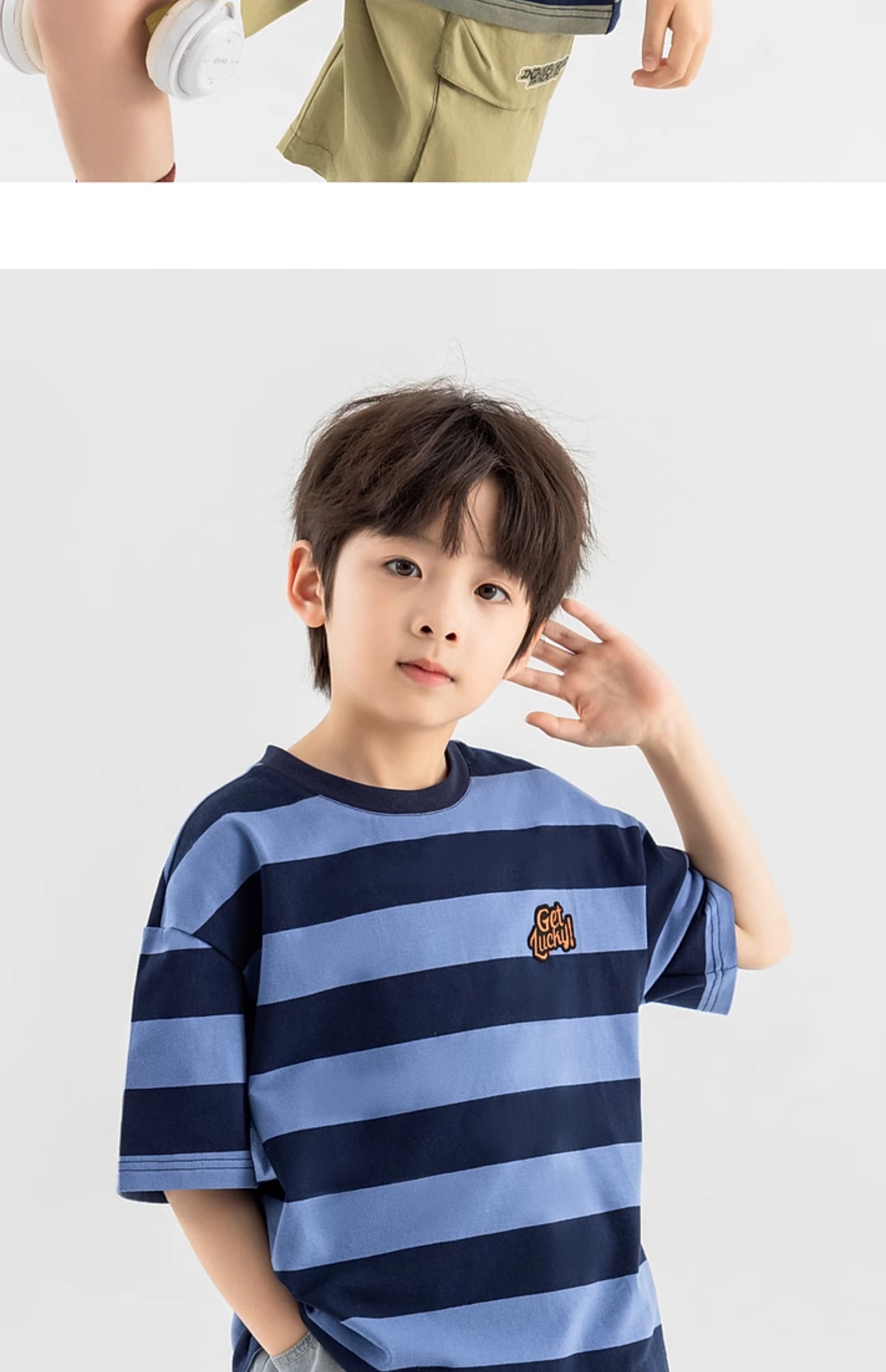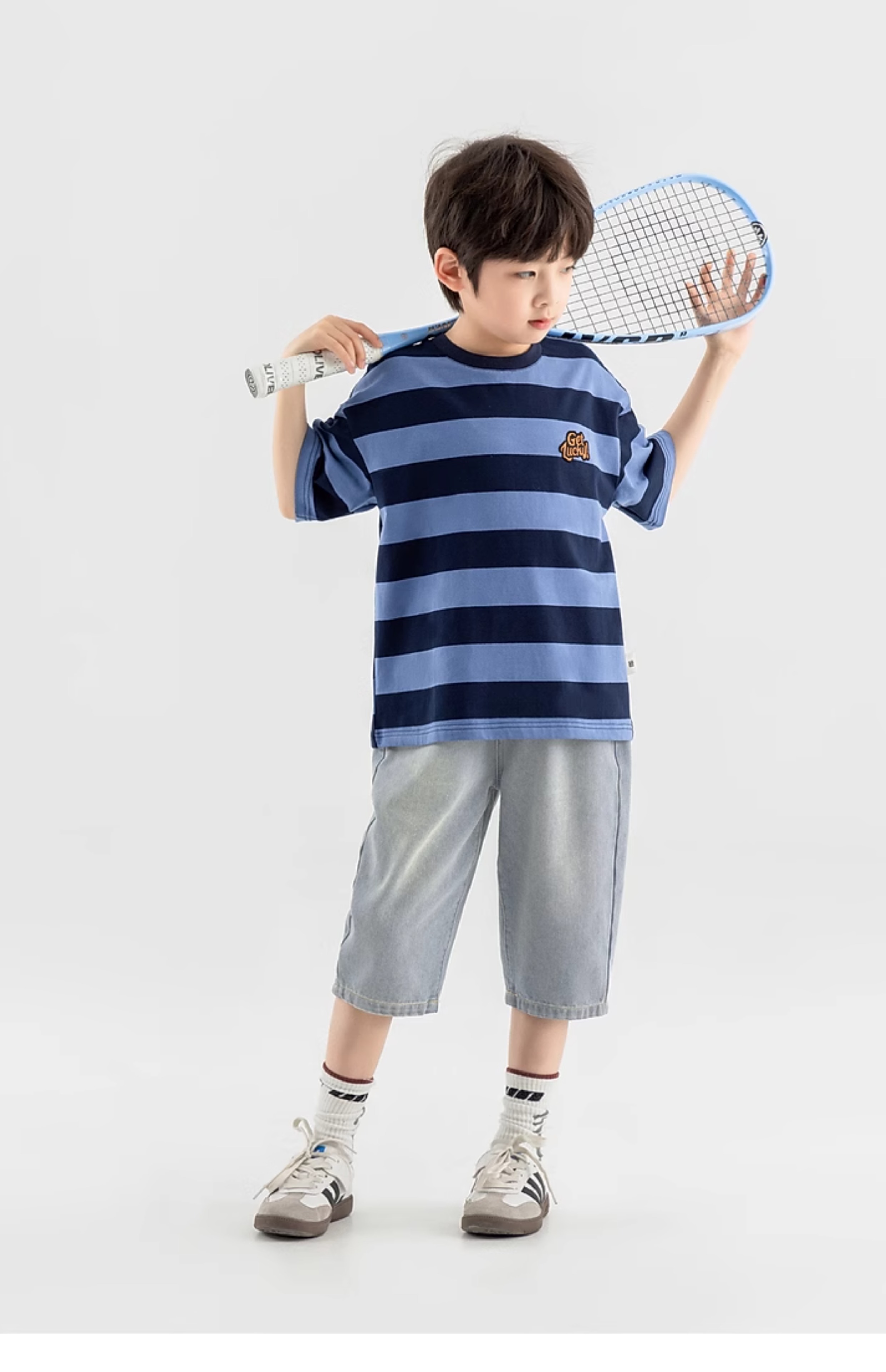 【团购价39.9-49.9】多多家男童条纹短袖T恤2025夏季新款儿童中大童半袖印花宽松上衣10803