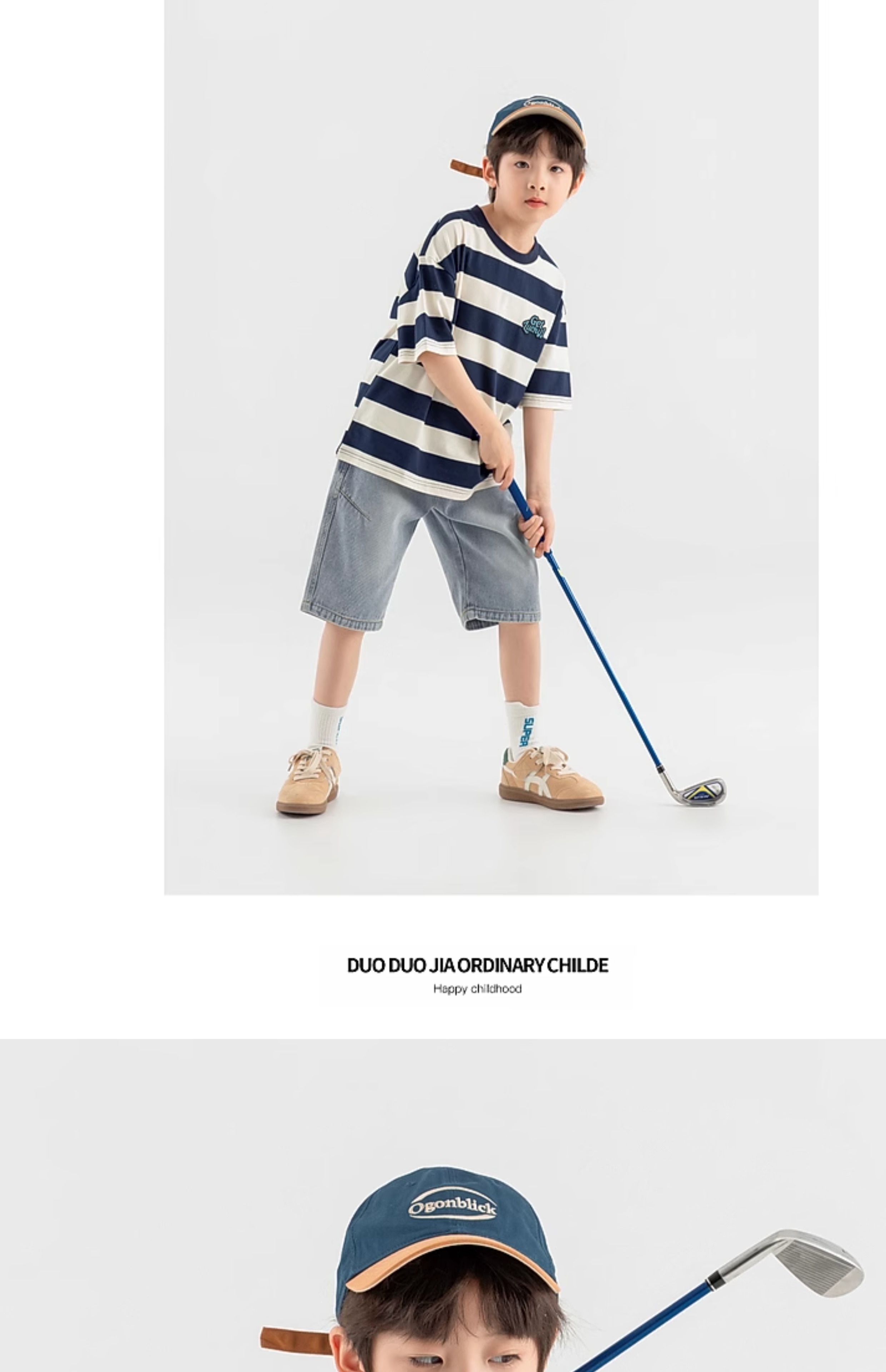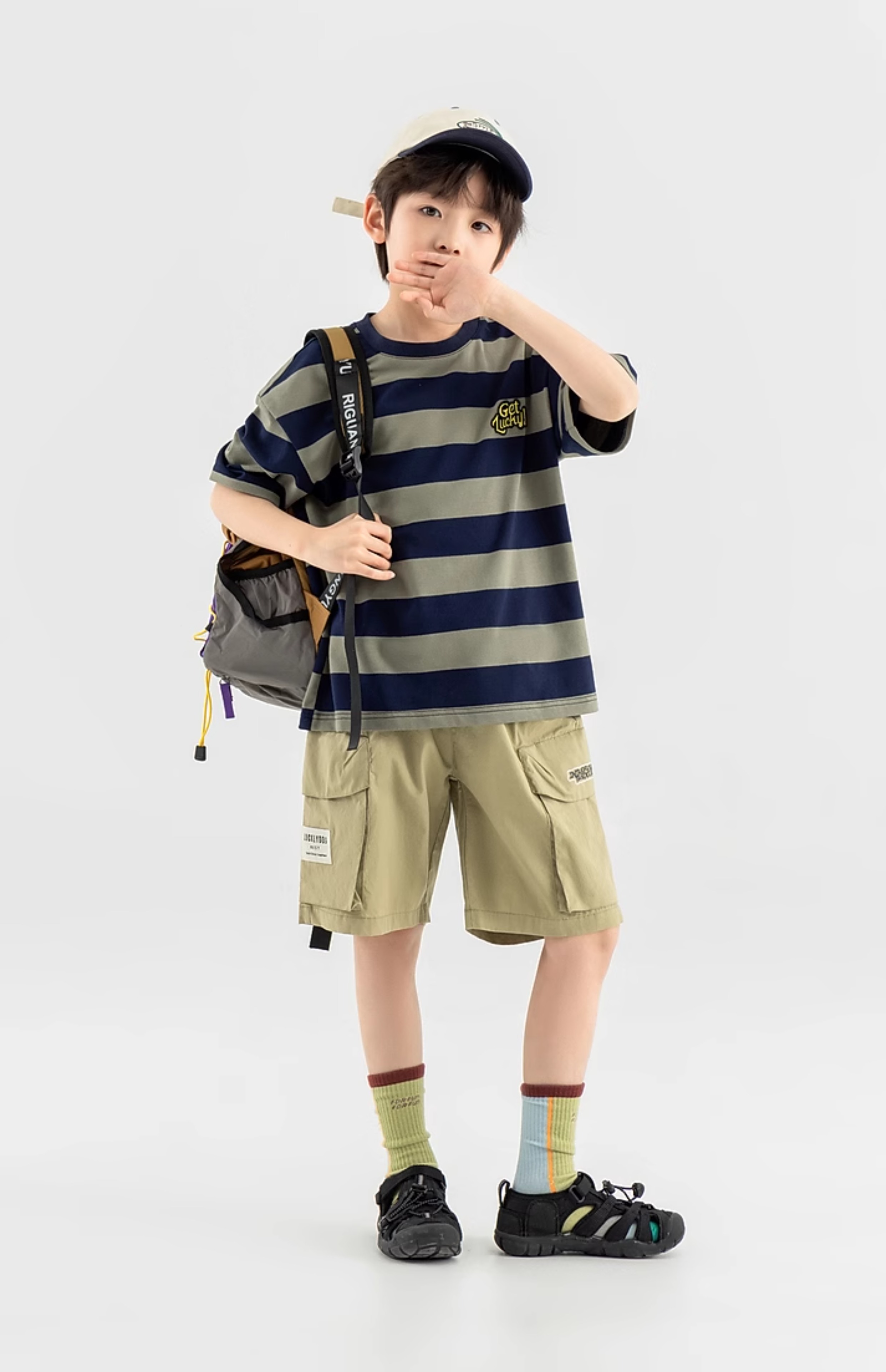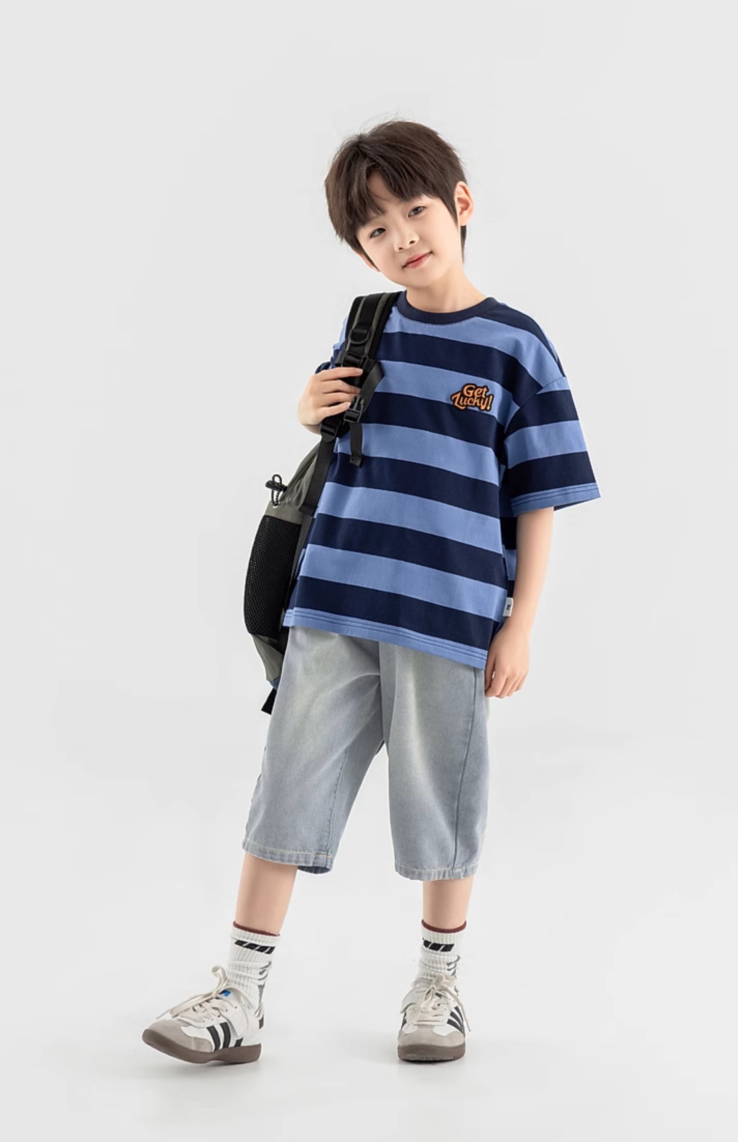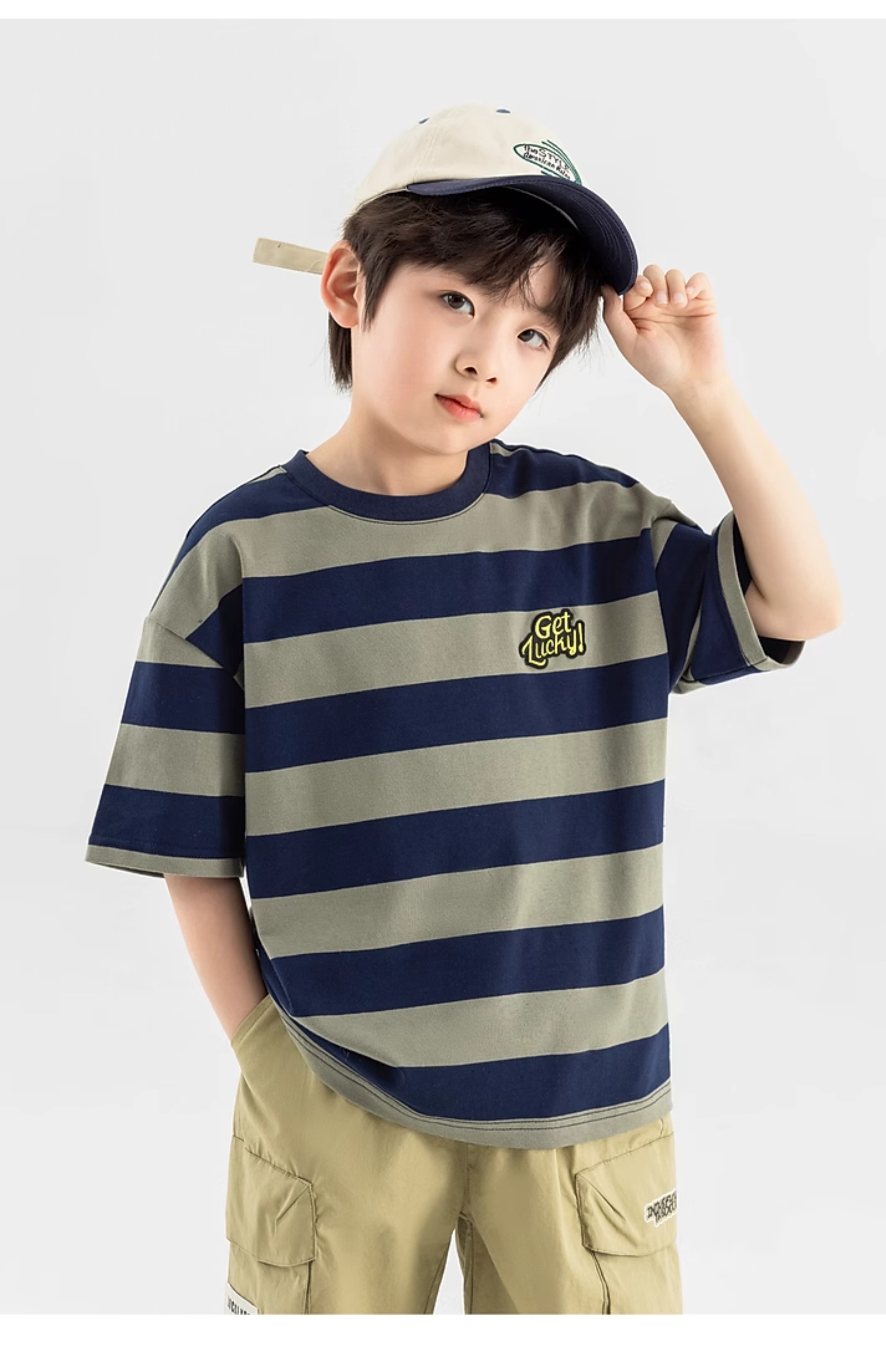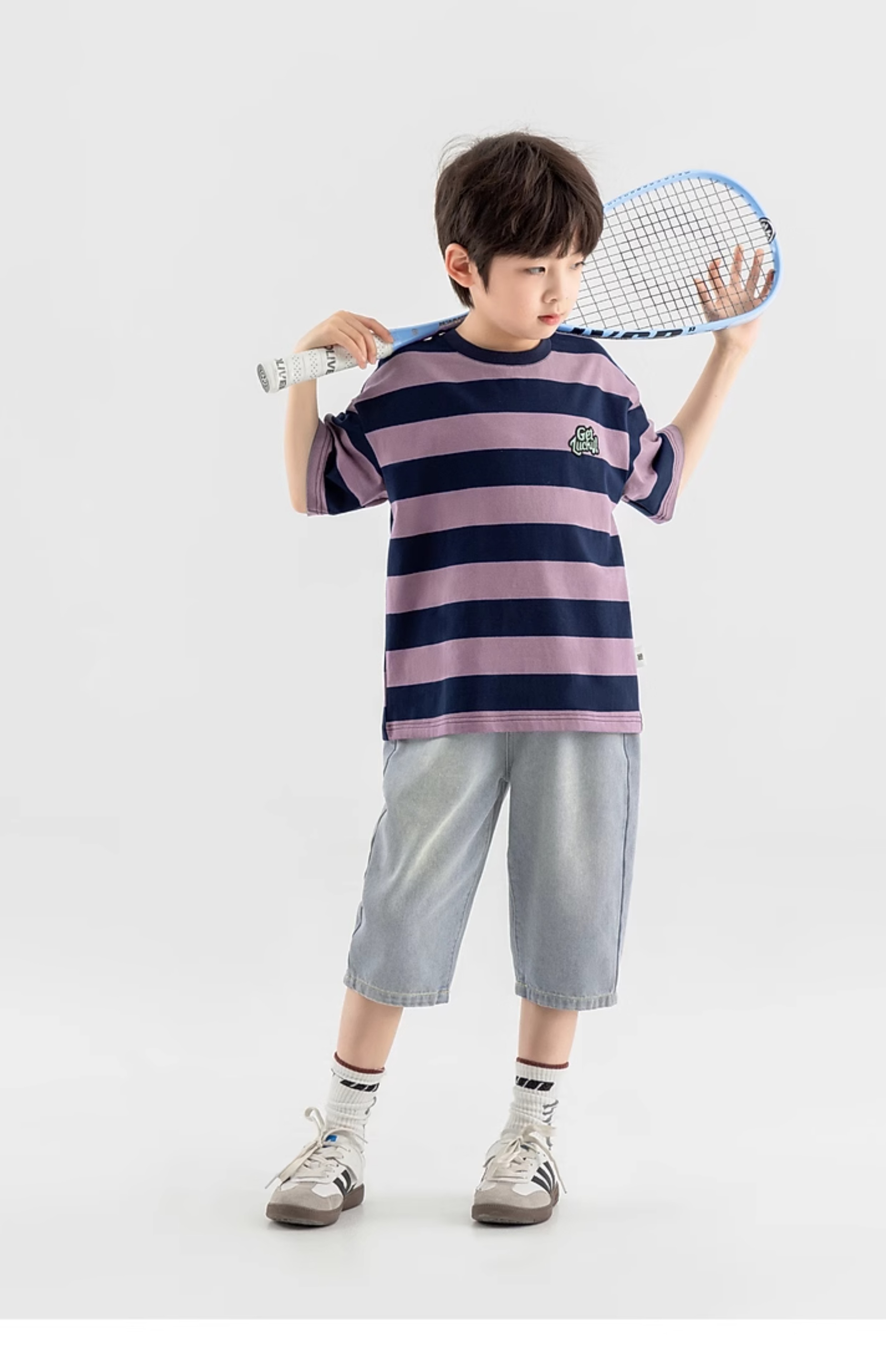 【团购价39.9-49.9】多多家男童条纹短袖T恤2025夏季新款儿童中大童半袖印花宽松上衣10803