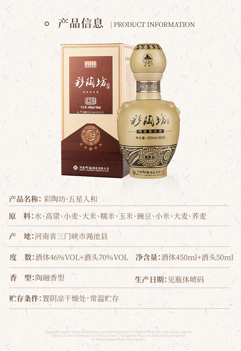 仰韶彩陶坊 五星人和 白酒 陶融型 450ml(46度)+50ml(70度)整箱6瓶 整箱装(6瓶)