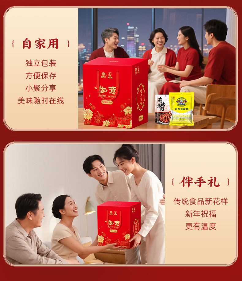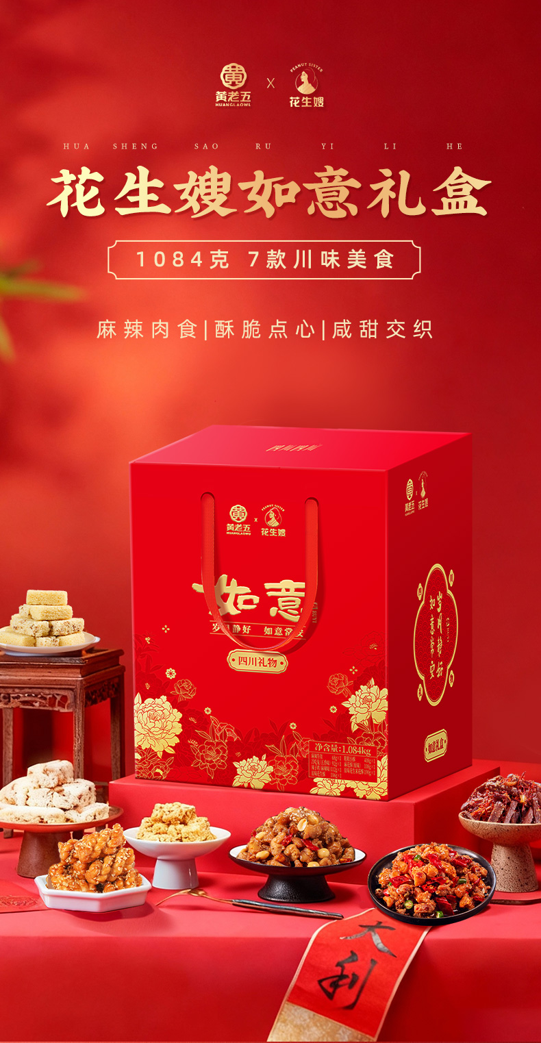 【黄老五花生酥如意1084g礼盒】集齐多款川味宝藏!从酥脆掉渣非遗花生酥到香辣过瘾冷吃牛肉、辣子鸡等!年货清单首选!