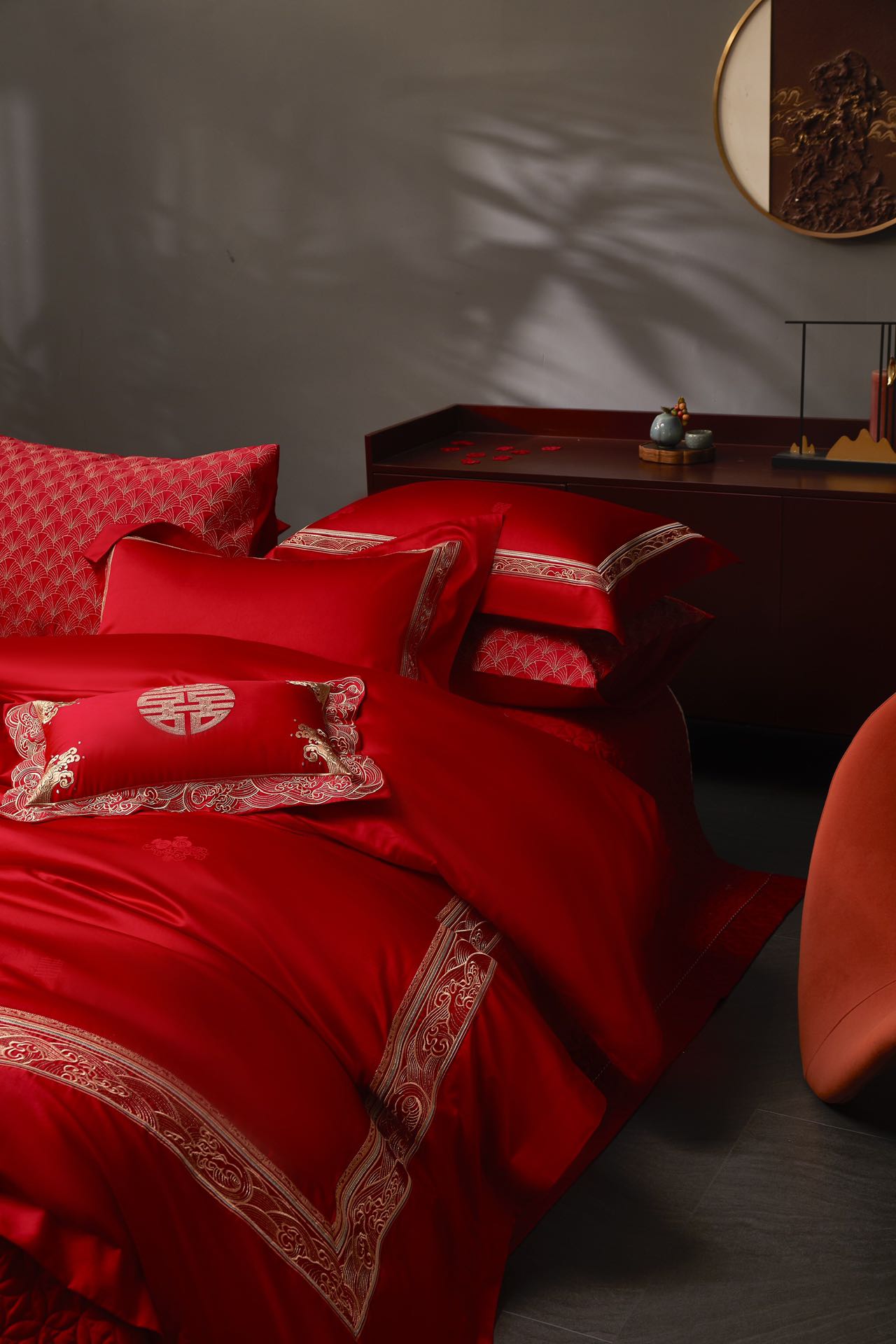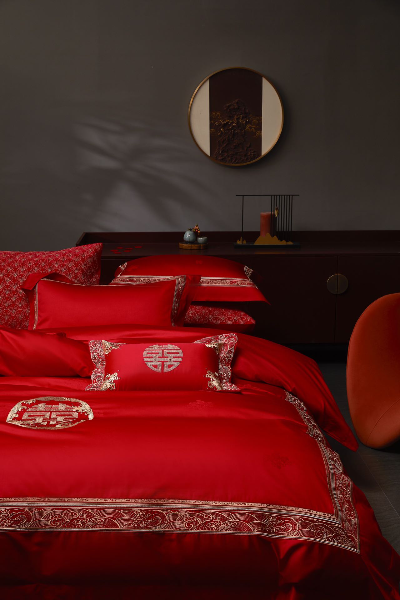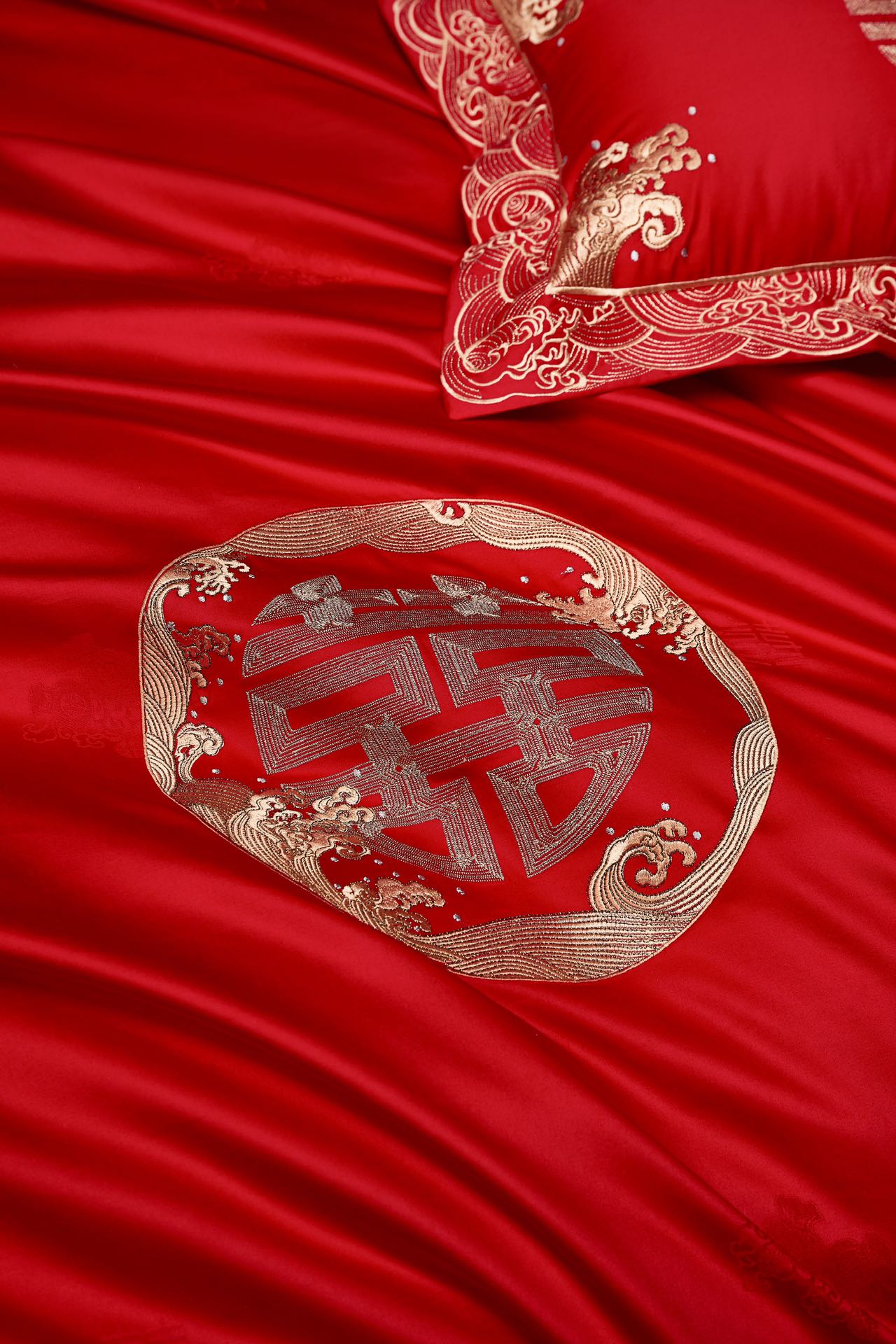 利路米家纺高档婚嫁婚庆喜被六件套百支棉陪嫁大红色系--欢喜