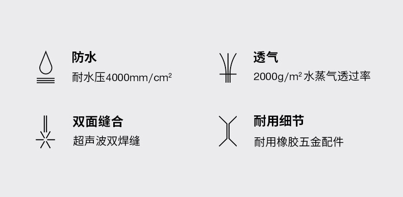 防水4000mm/平方厘米,防暴风,透气2000g/平方厘米。超级好打理,可洗可不洗,平时湿布擦擦。穿几年都像羽绒服一样饱满。