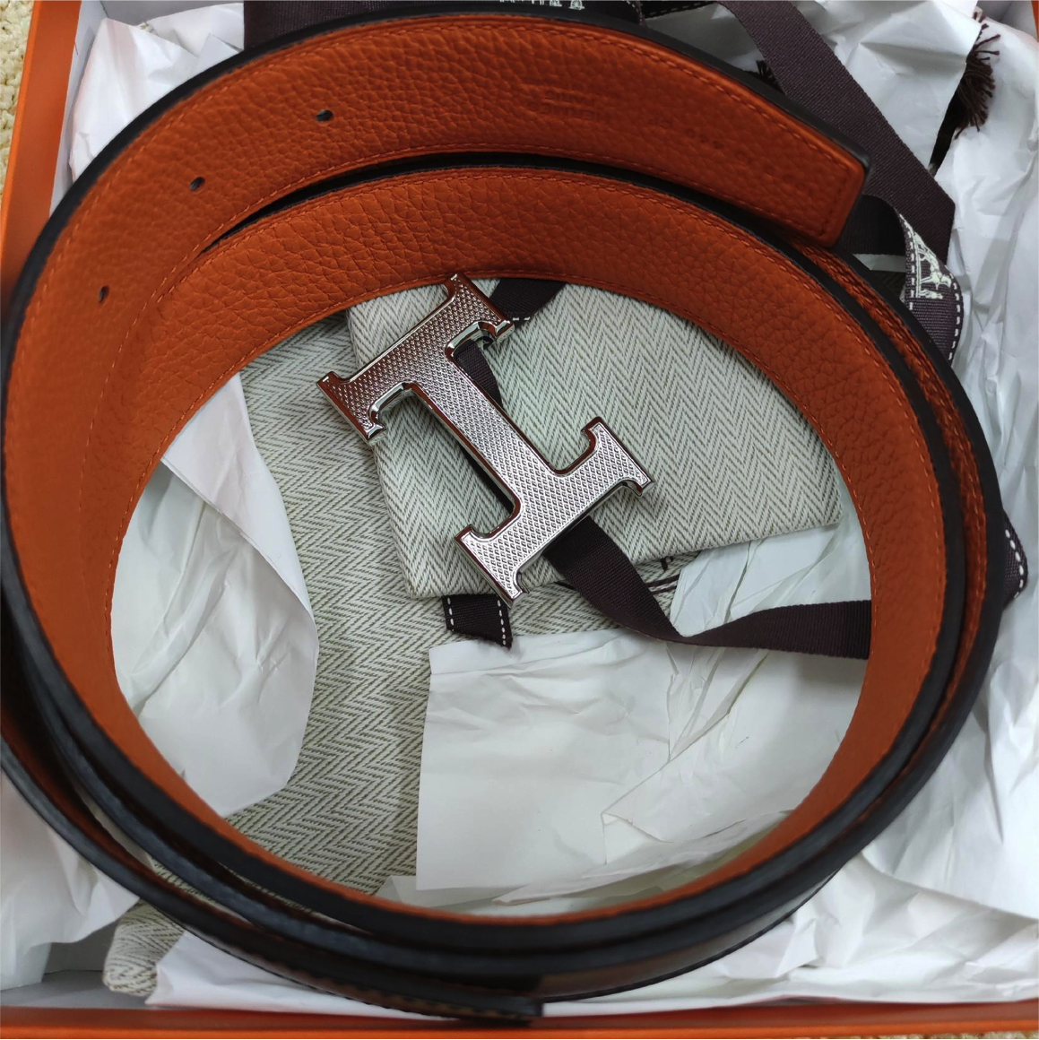 HERMES爱马仕 雕纹银色扣 Togo 小牛皮双面皮腰带 女款 黑色
