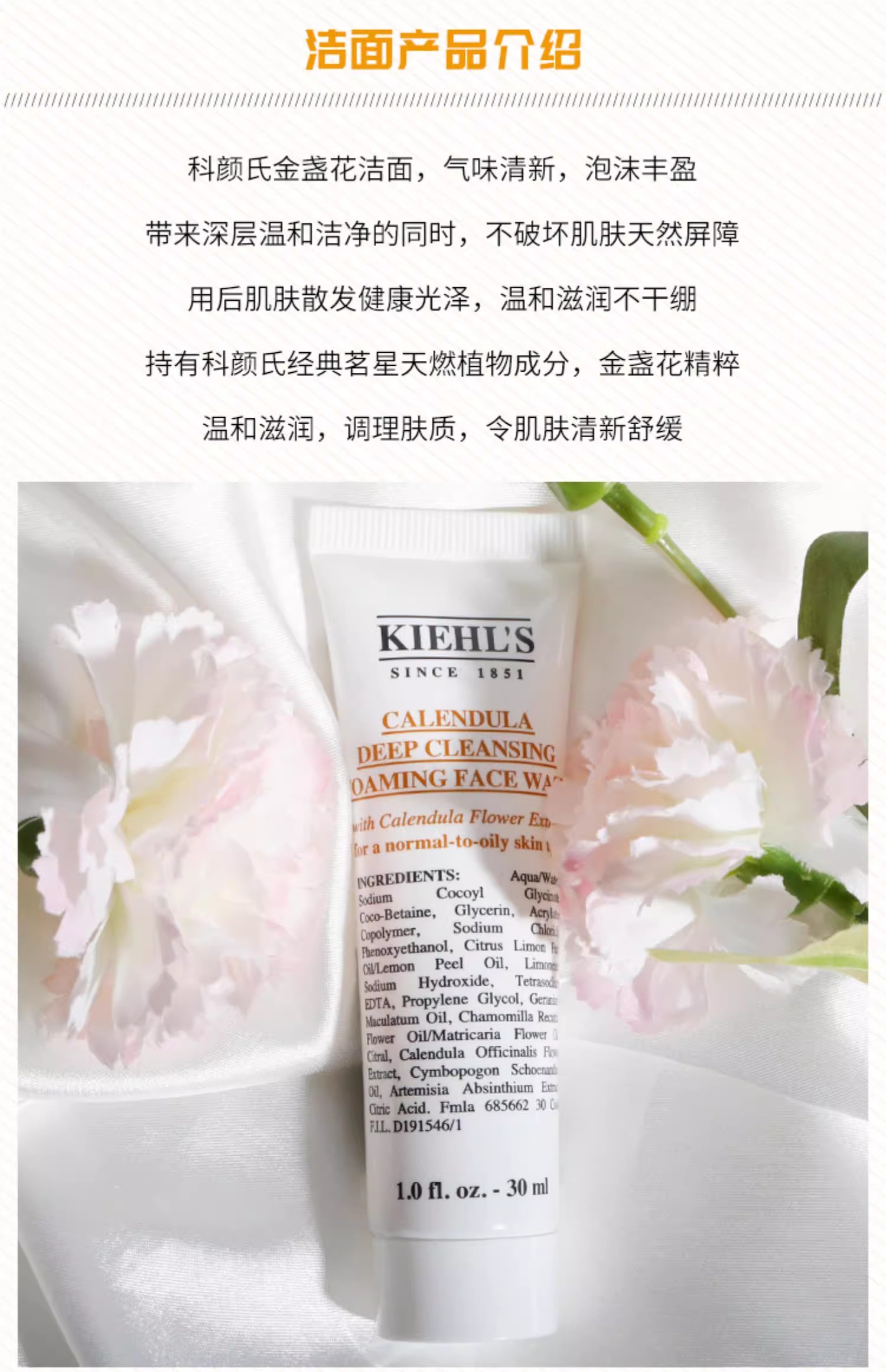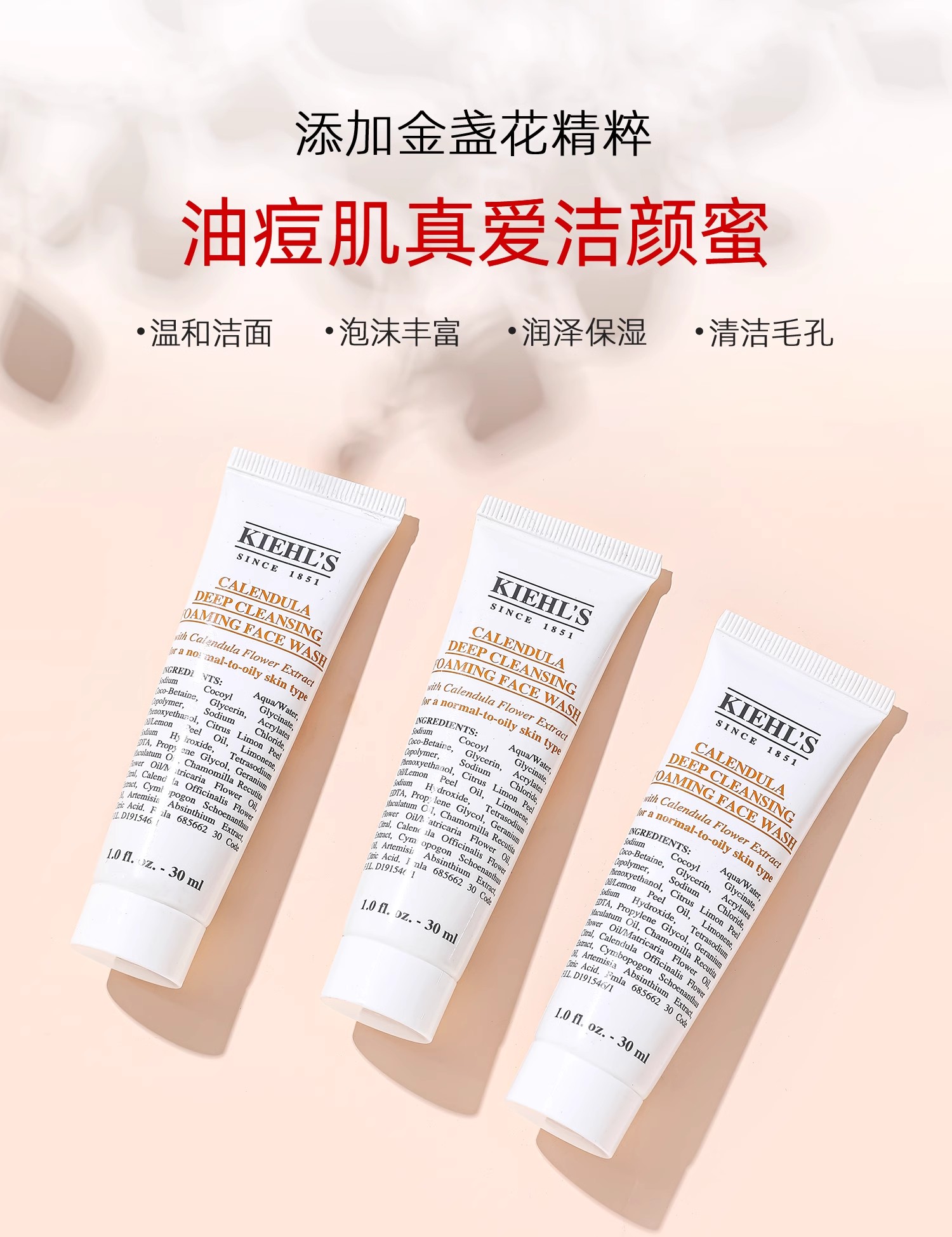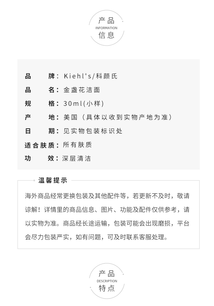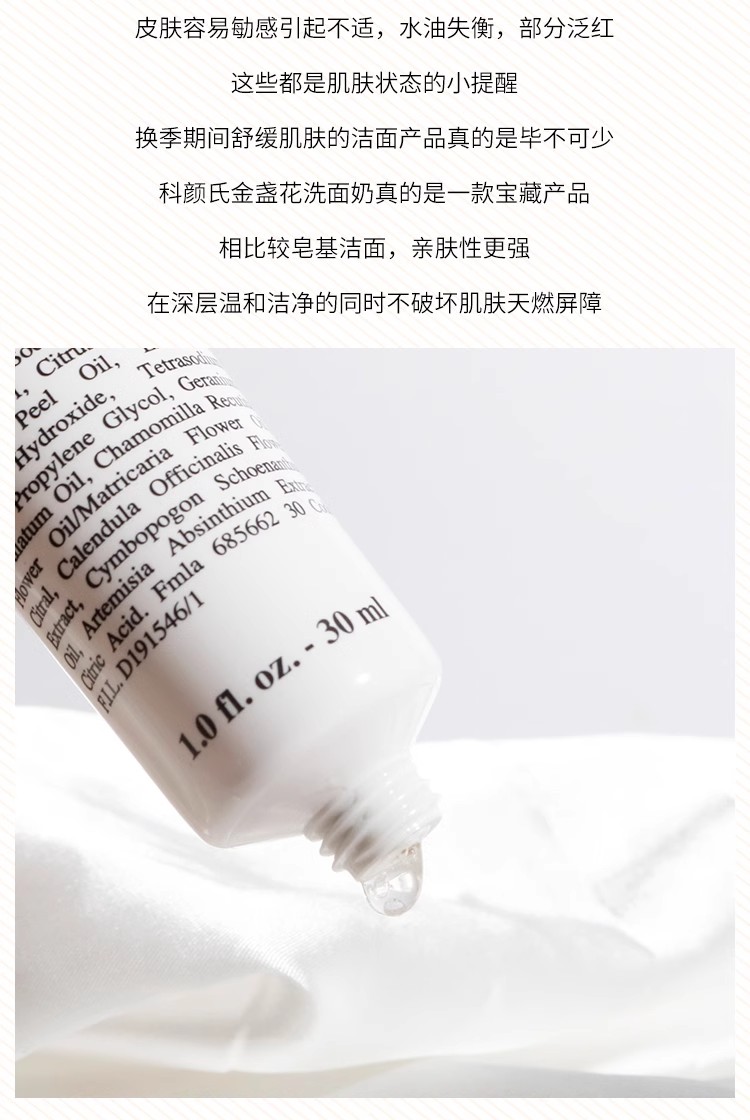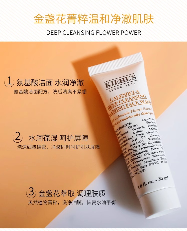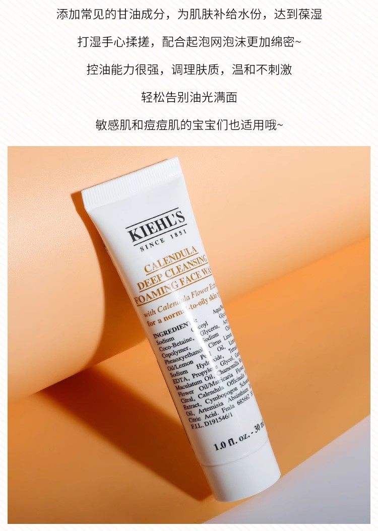 科颜氏kiehl's金盏花洁面乳 清洁泡沫洗面奶小样敏感温和控油 30ml小样