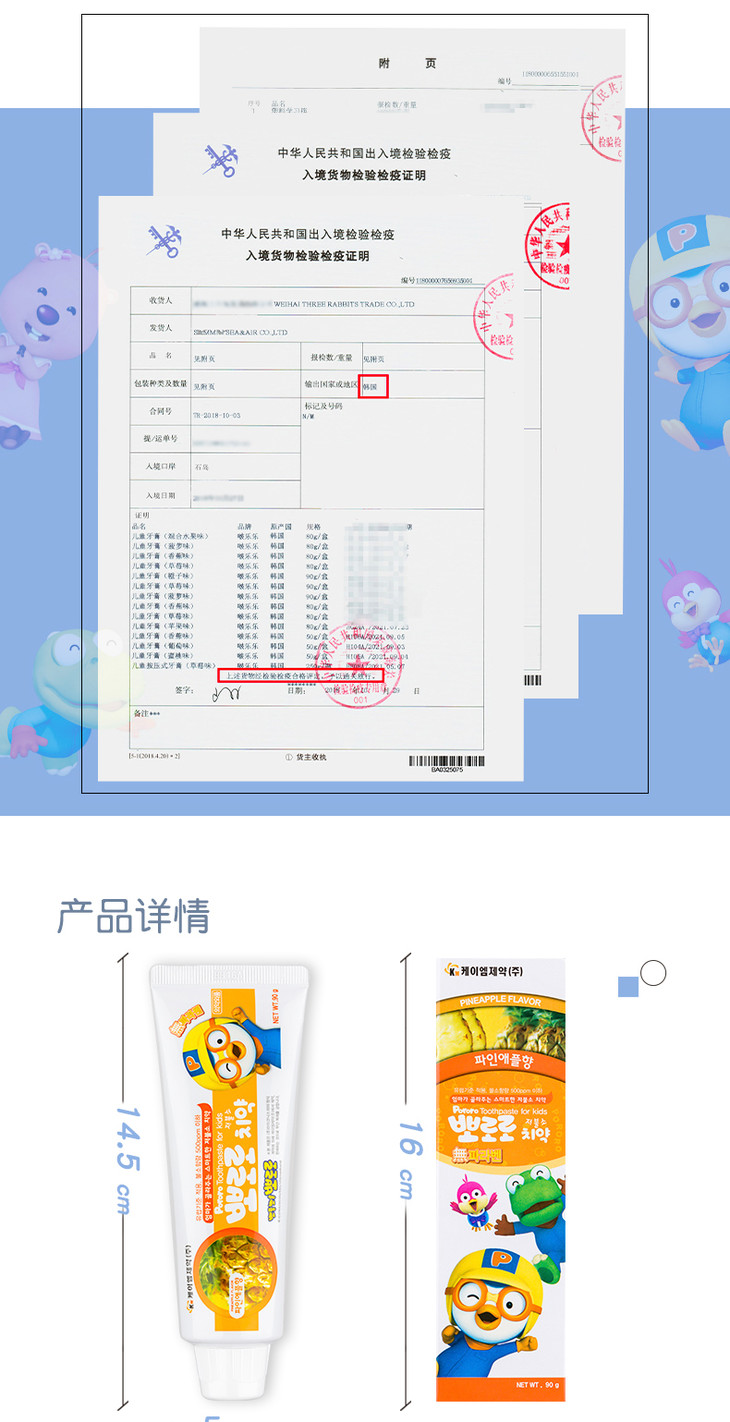【中欧班列精选】HG韩国进口 啵乐乐牙膏(菠萝味)3岁+90g/支