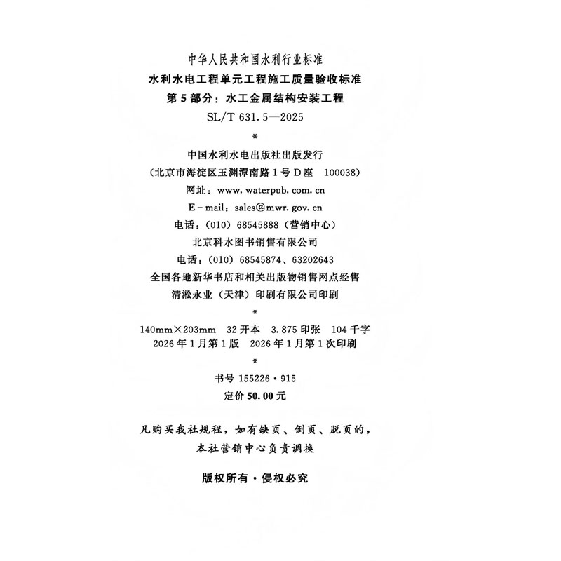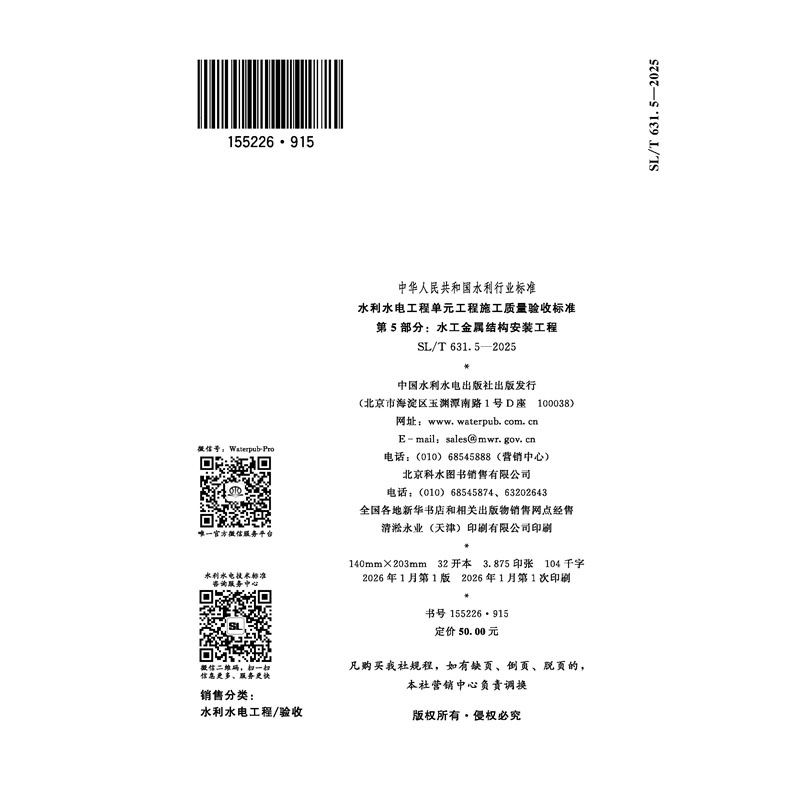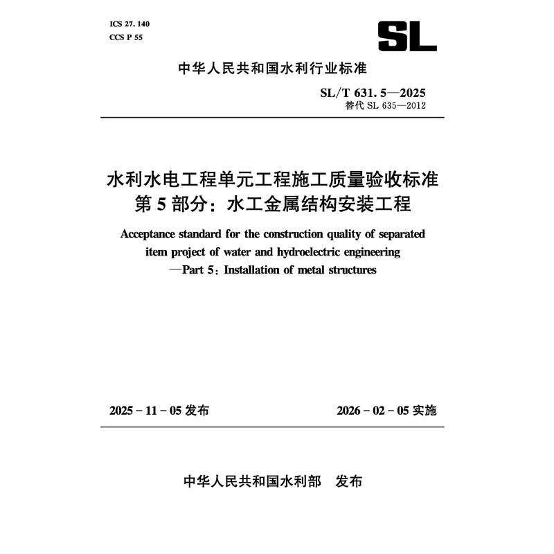 SL/T631.5-2025水利水电工程单元工程施工质量验收标准 第5部分:水工金属结构安装工程(中华人民共和国水利行业标准)