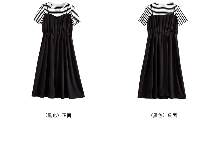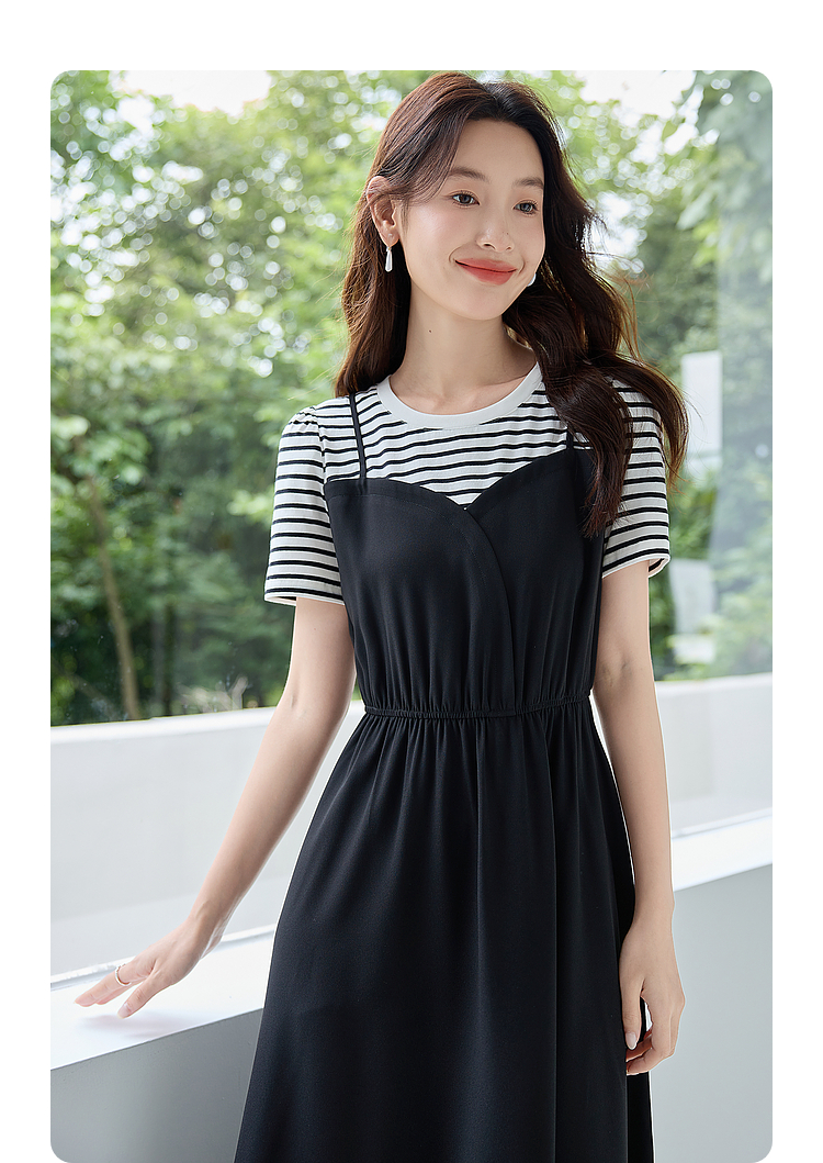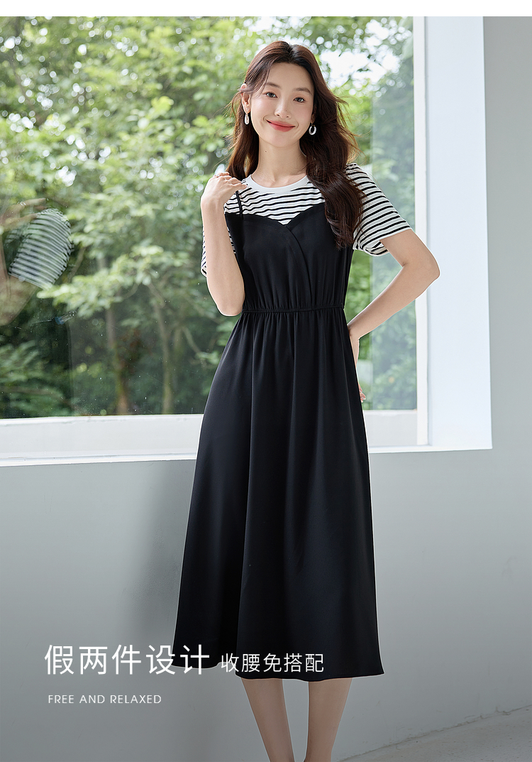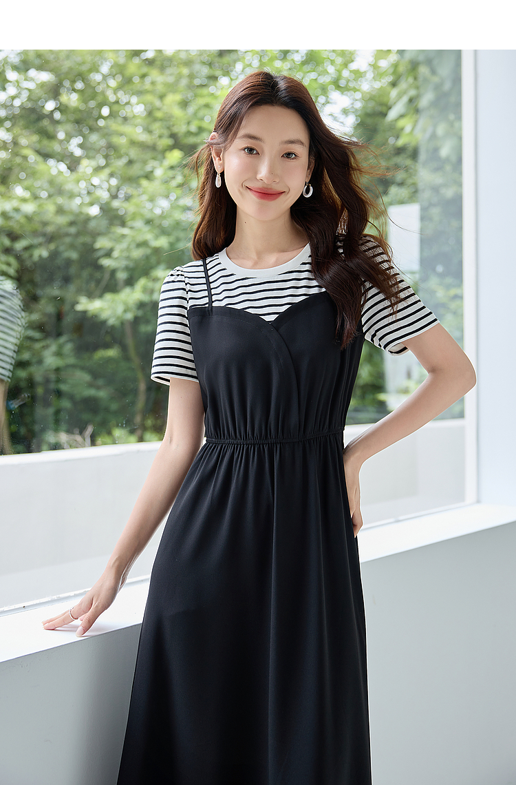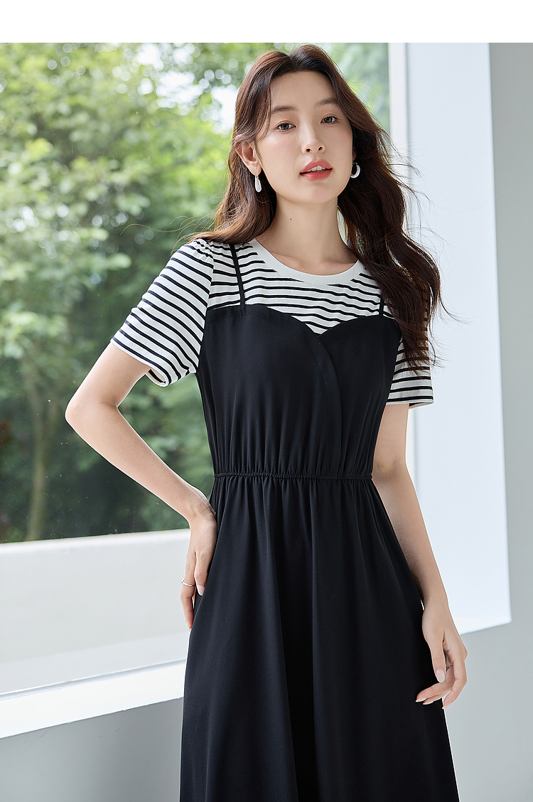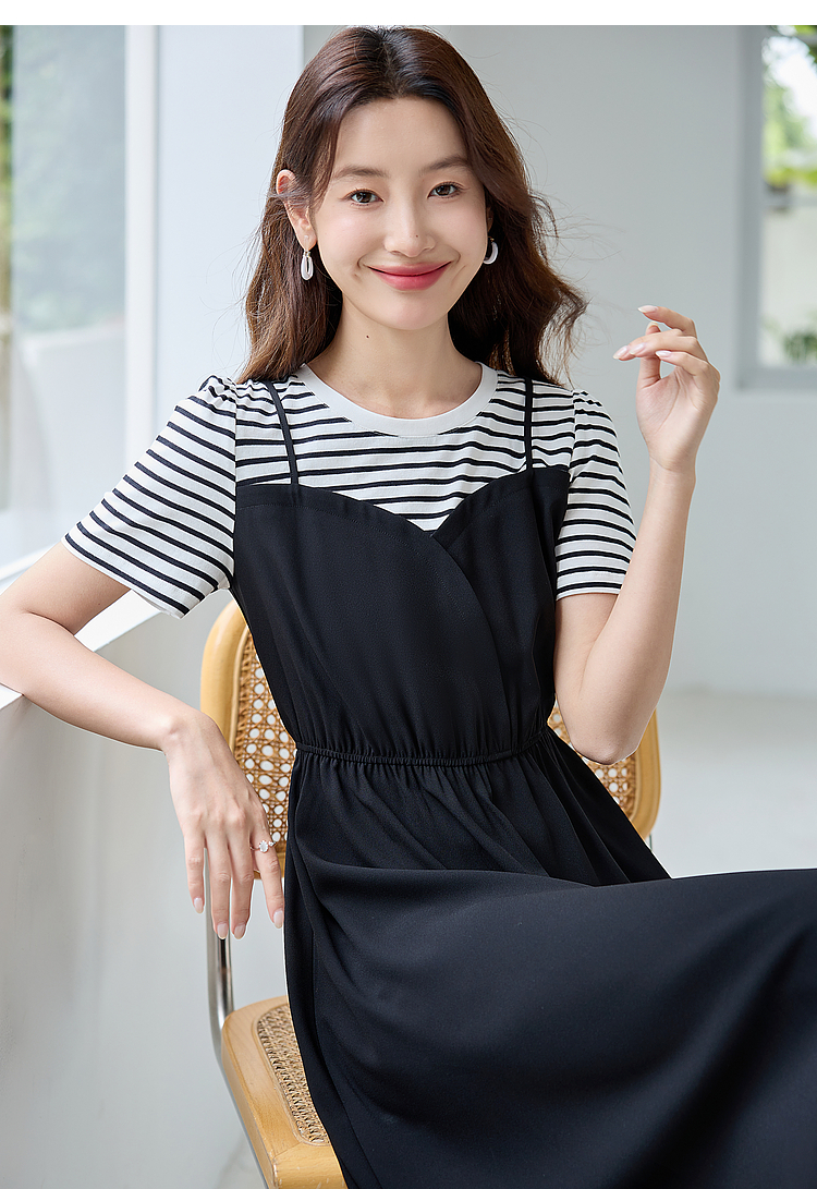 【五折购】熙世界休闲时尚假两件连衣裙2025夏装新款短袖条纹拼接T恤裙子