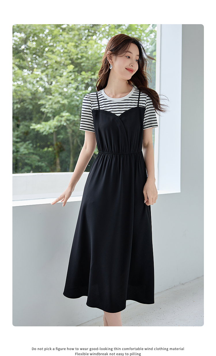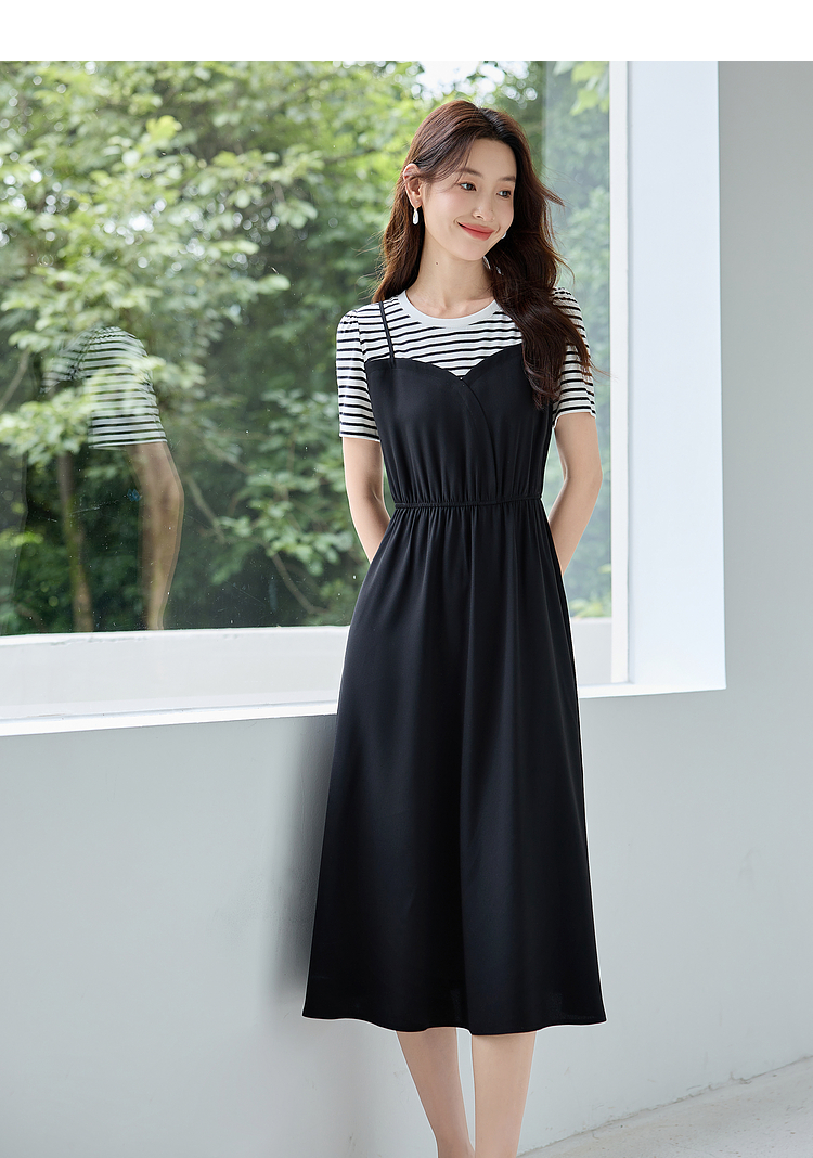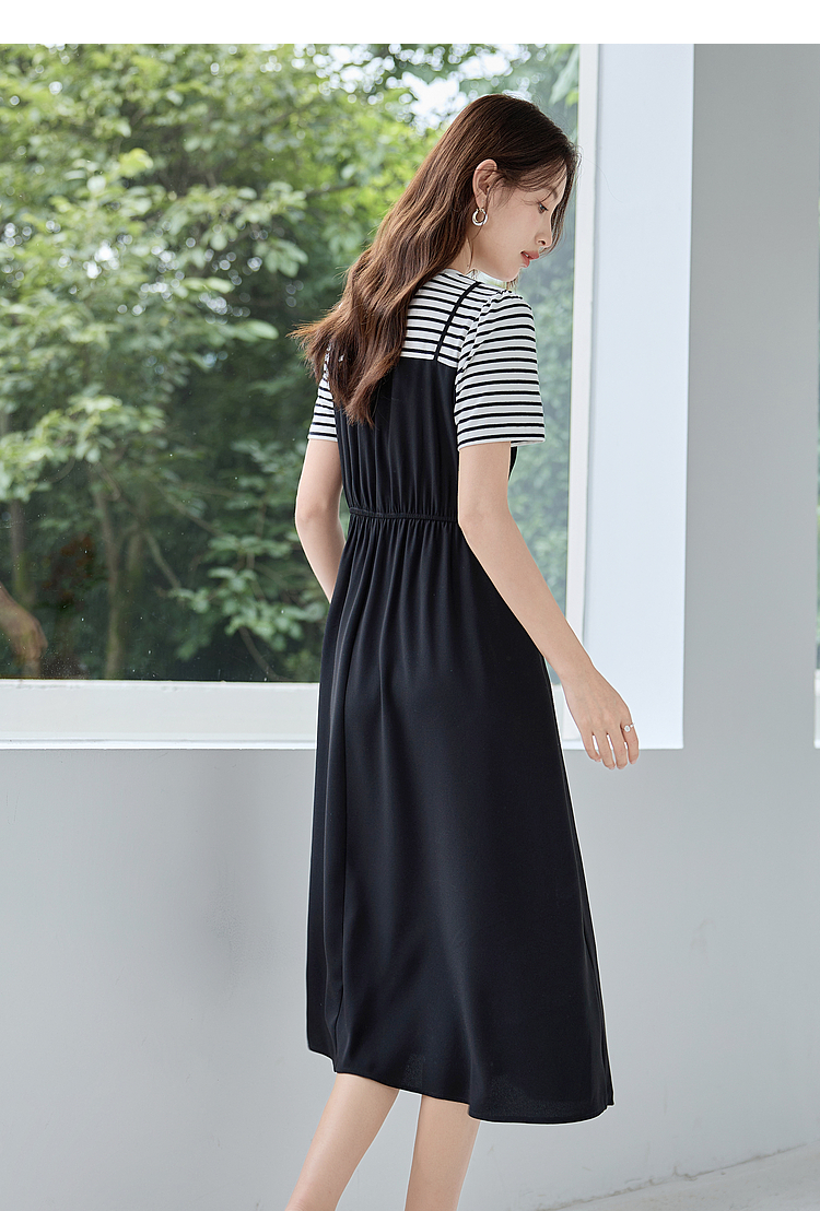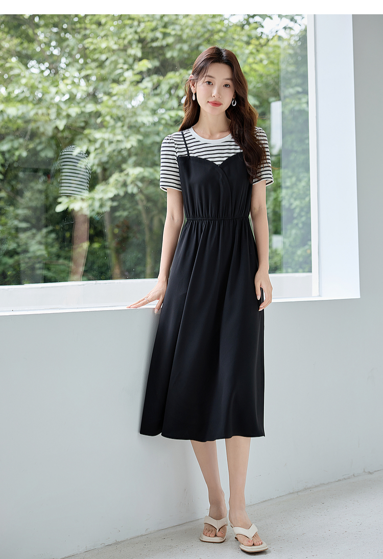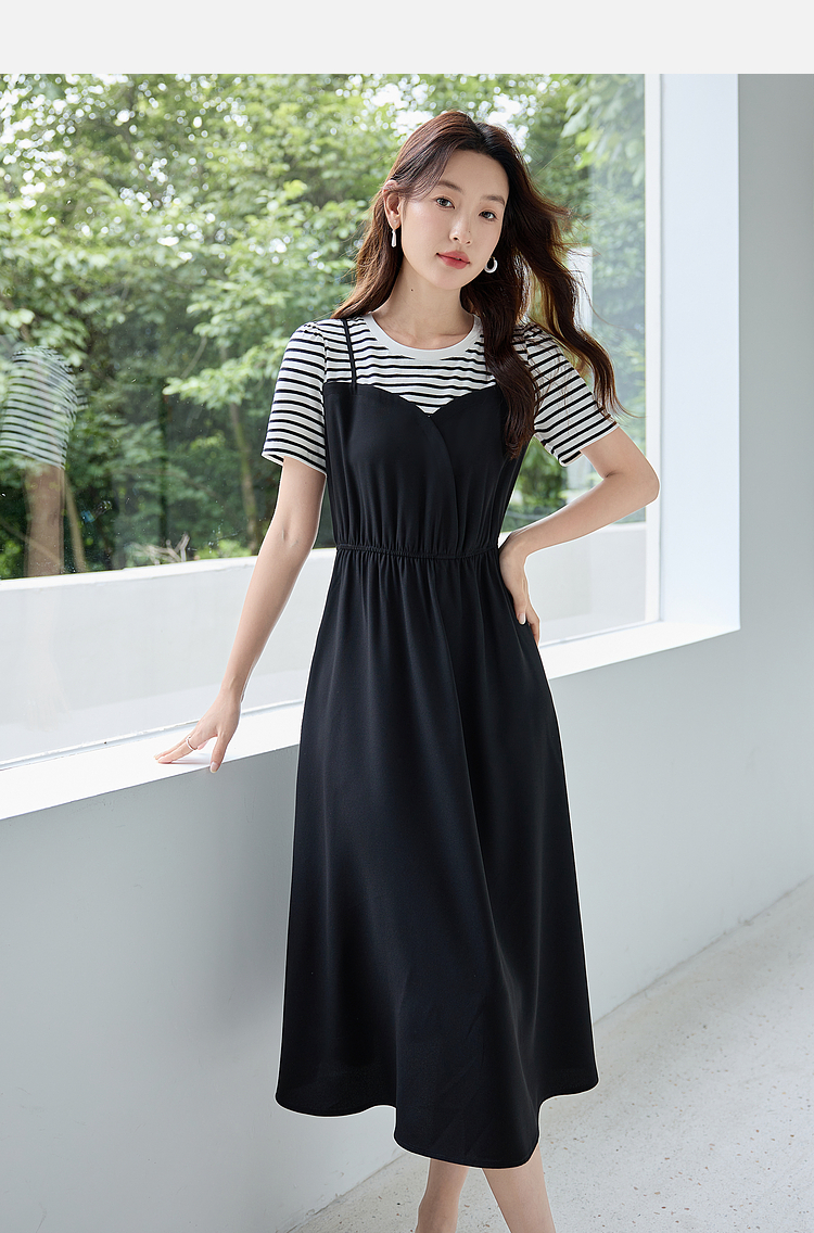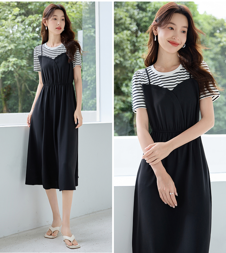 【五折购】熙世界休闲时尚假两件连衣裙2025夏装新款短袖条纹拼接T恤裙子