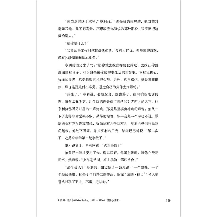“是个男人?”亨利问,伯父歇了一会儿说:“一个姑娘,一个年轻的姑娘。这是今年的第二起事故,她在‘威廉·拉贝’号火车进站时跳了下去,不错,进站时。”