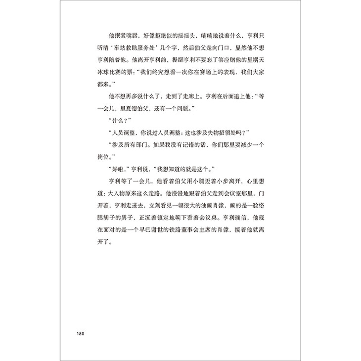 亨利等了一会儿,他看着伯父用小腿迈着小步离开,心里想道:大人物原来这么走路。他慢慢地跟着伯父走到会议室那里,门开着,亨利走进去,立刻看见一幅很大的油画肖像,画的是一脸络腮胡子的男子,正沉着镇定地朝下看着会议桌。亨利确信,他现在面对的是一个早已谢世的铁路董事会主席的肖像,接着他就离开了。
