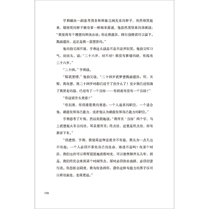“很遗憾,亨利,我觉得这种态度并不有趣,我认为一点儿也不有趣。一个人必须不辜负自己的生命,难道不是吗?在某个时段,我们也许可以浑浑噩噩地消磨时光,可以浪费掉开头几年,但是,我们终究会来到某个时间节点,届时必须作出选择,必须付诸行动。你恐怕会同意,我有权告诉你,像你这样有能力的男子汉可以再往前走,走得更远。