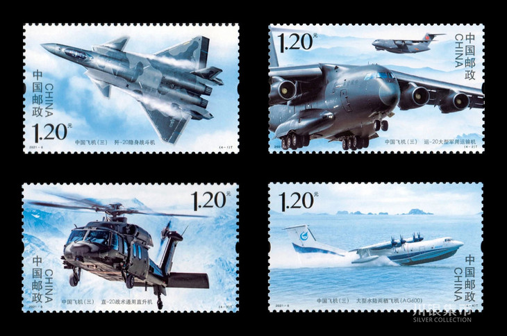 为了展现新中国航空工业发展的最新成就,中国邮政于2021年4月17日发行《中国飞机(三)》特种邮票1套四枚。该套邮票由于雪设计,北京邮票厂有限公司胶版工艺印制。