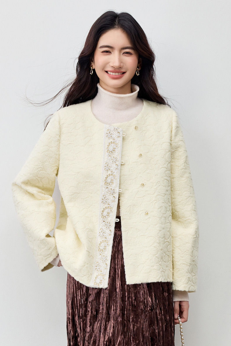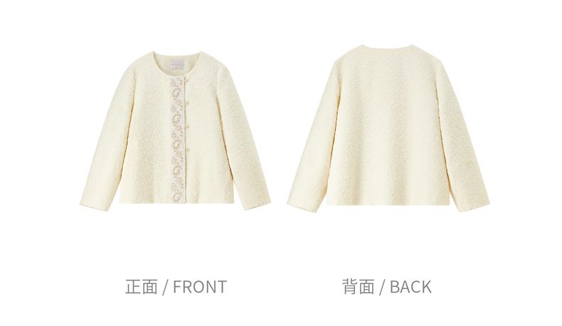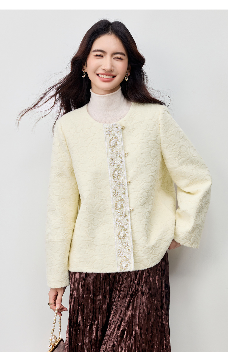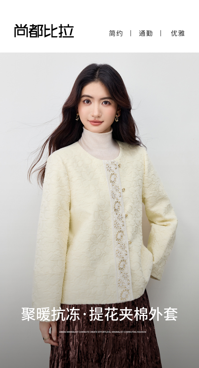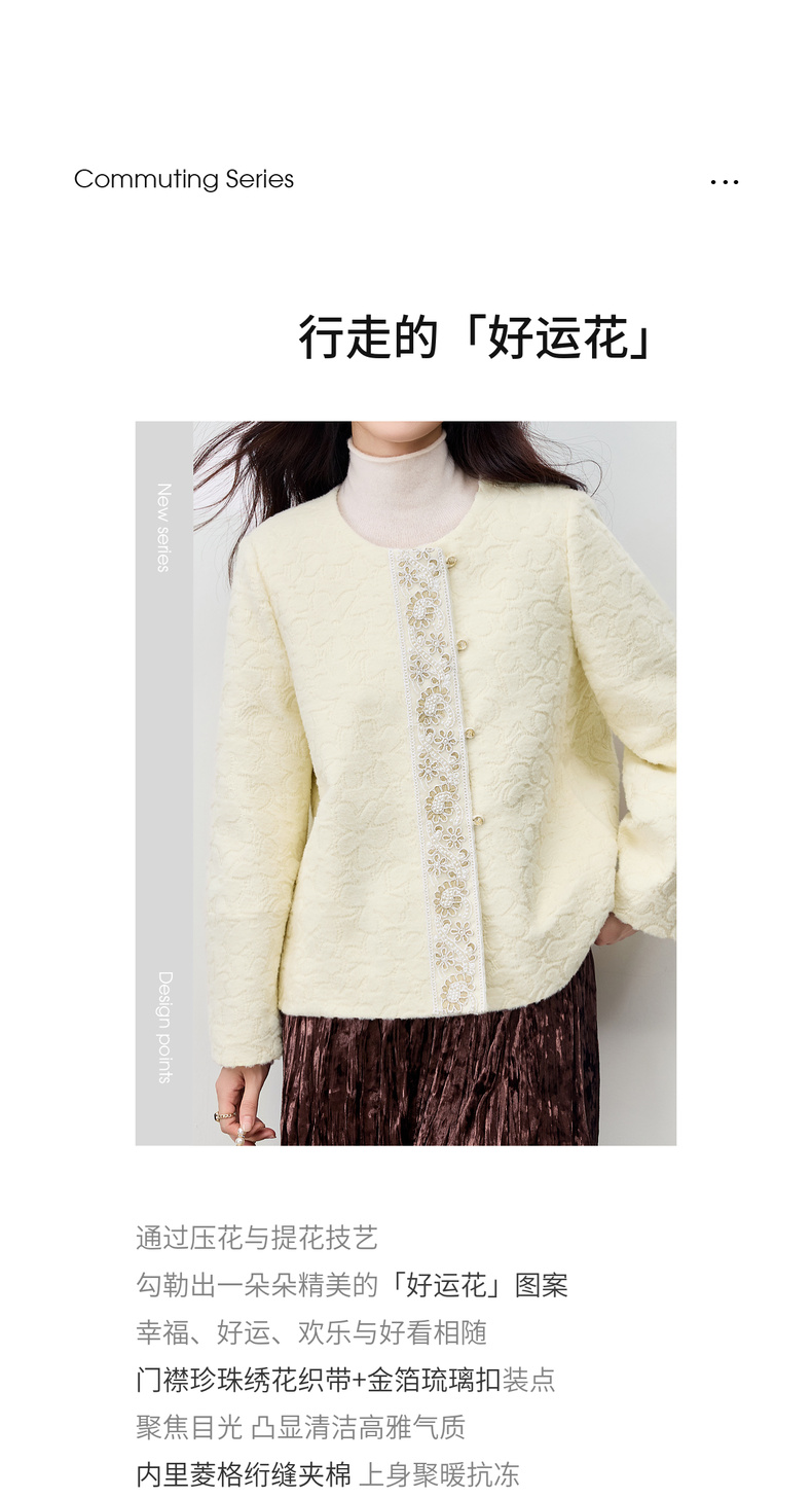 【内购】[夹棉保暖]优雅通勤圆领撞色珍珠绣花织带幸运花肌理厚保暖外套-154WL3890