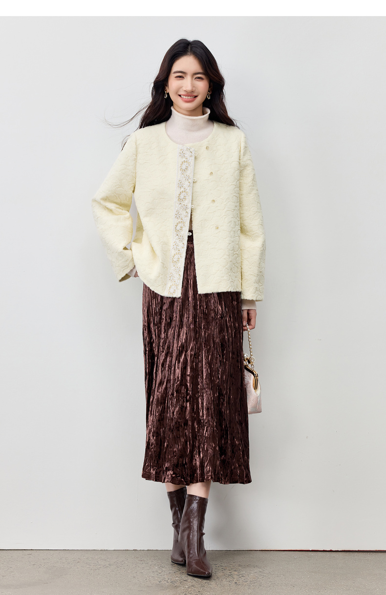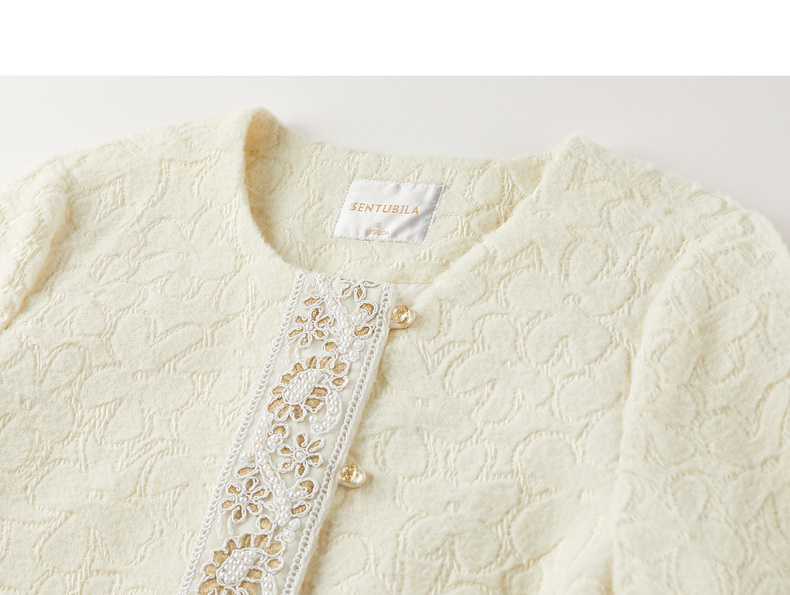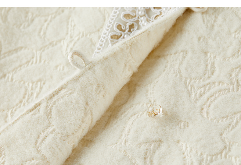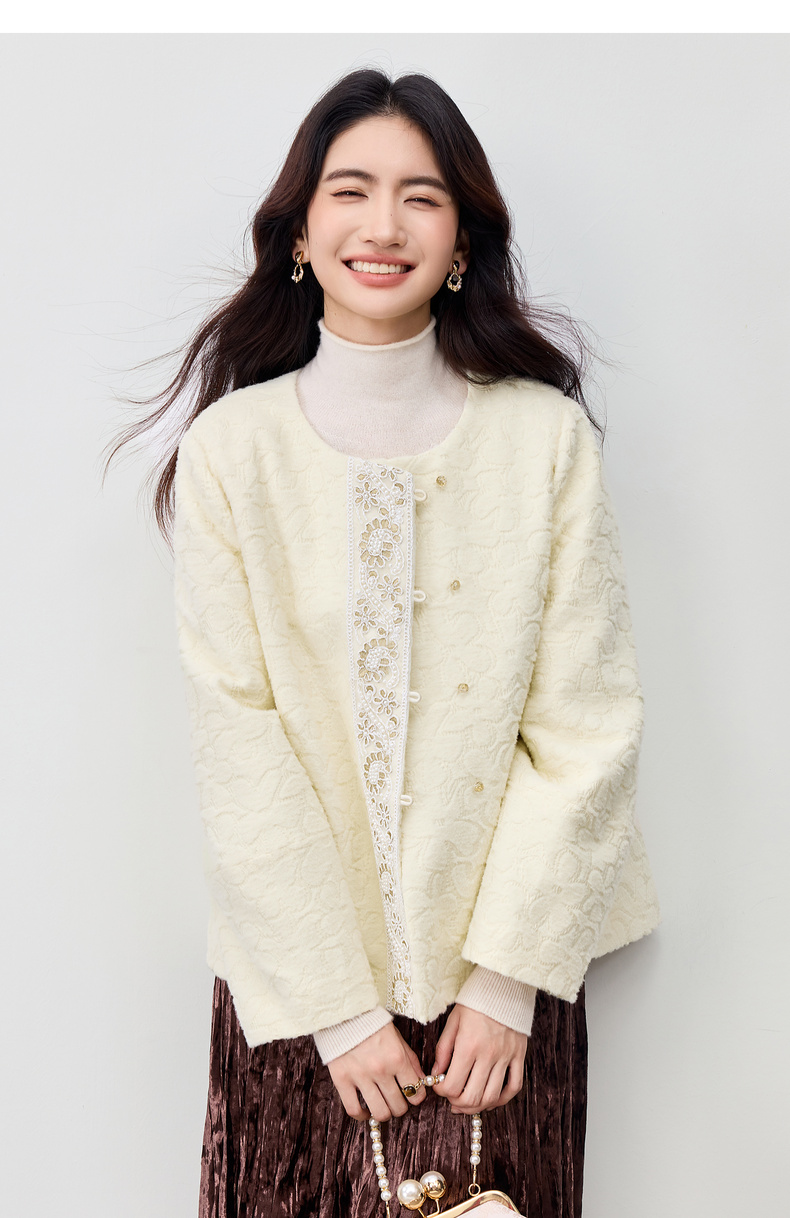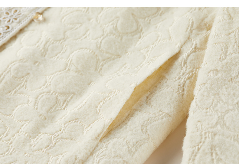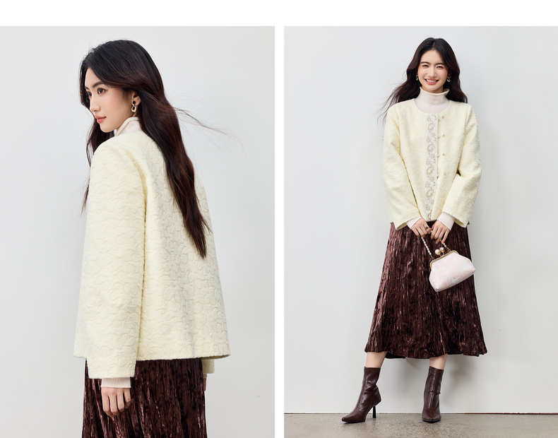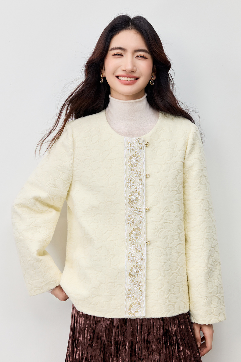 【内购】[夹棉保暖]优雅通勤圆领撞色珍珠绣花织带幸运花肌理厚保暖外套-154WL3890