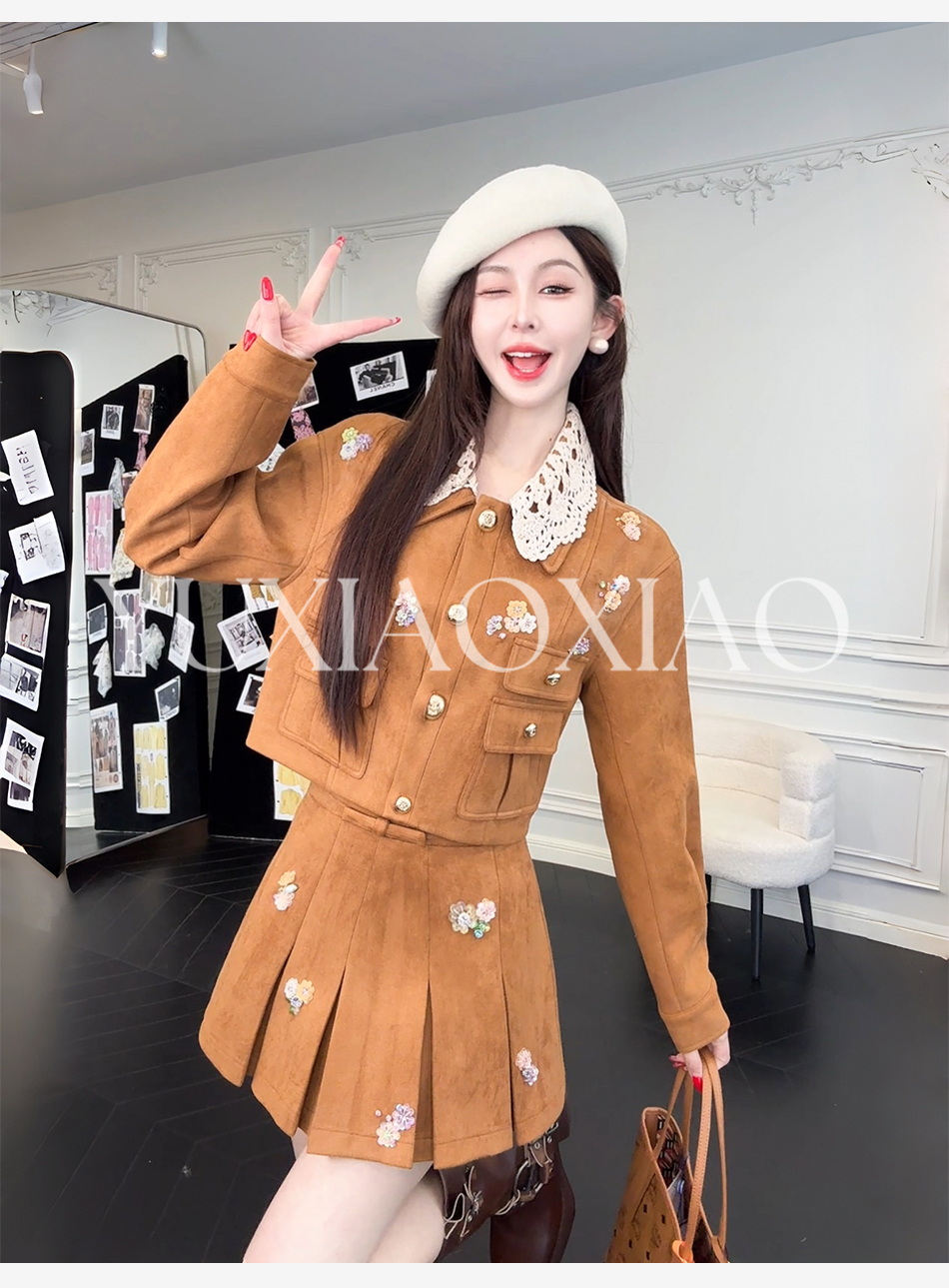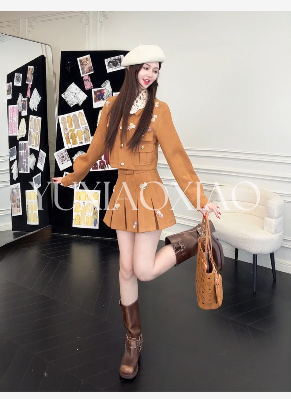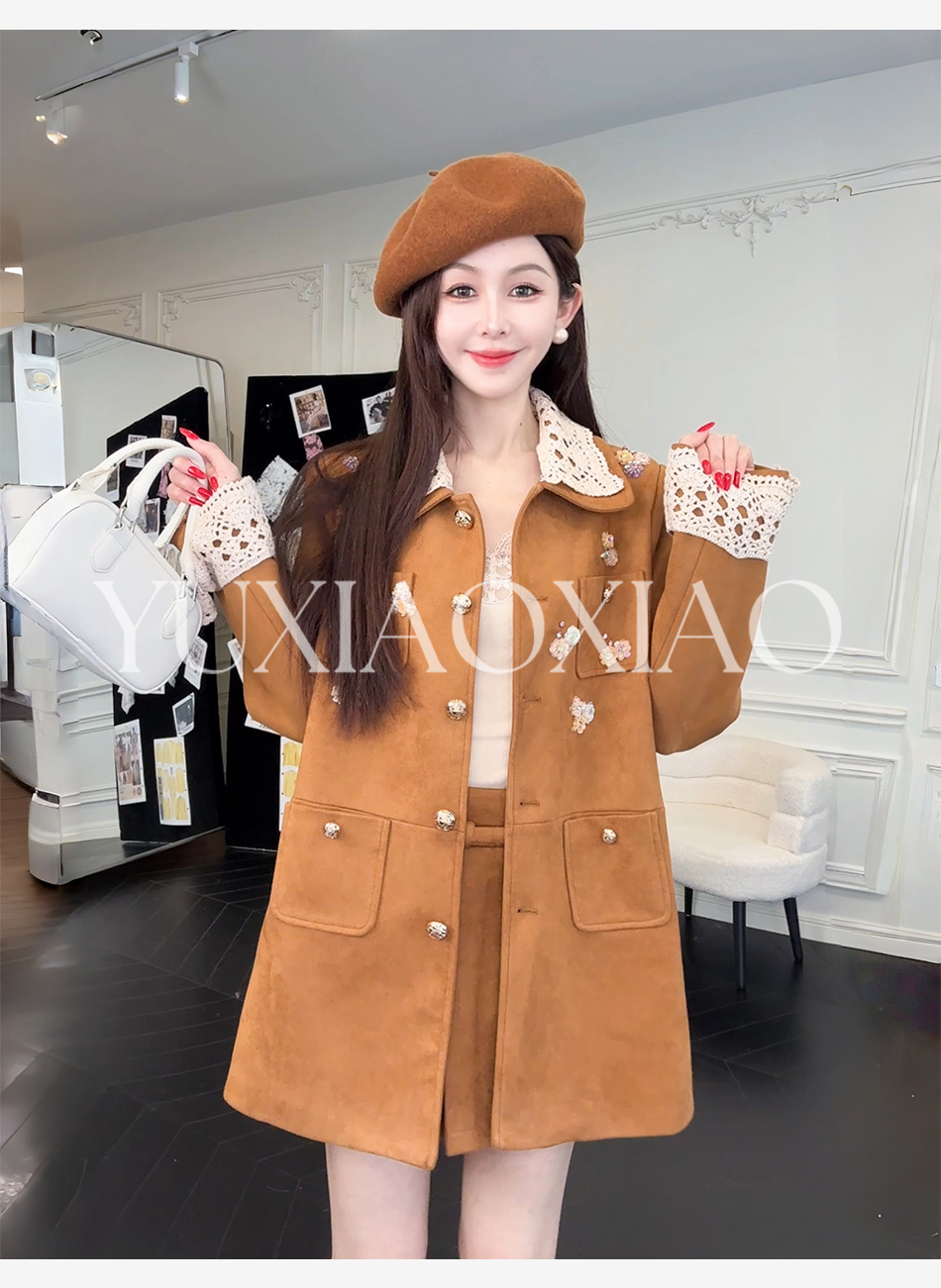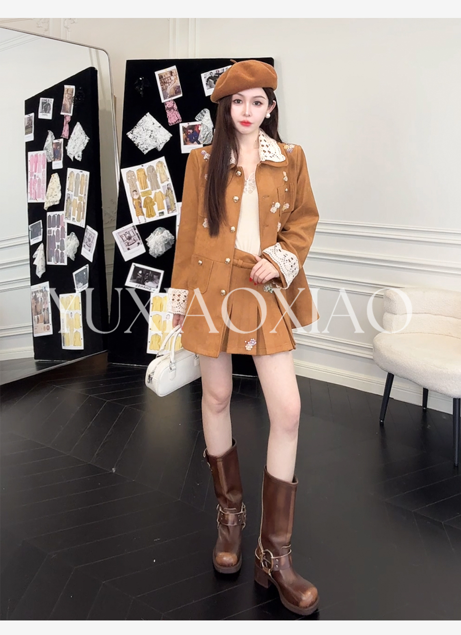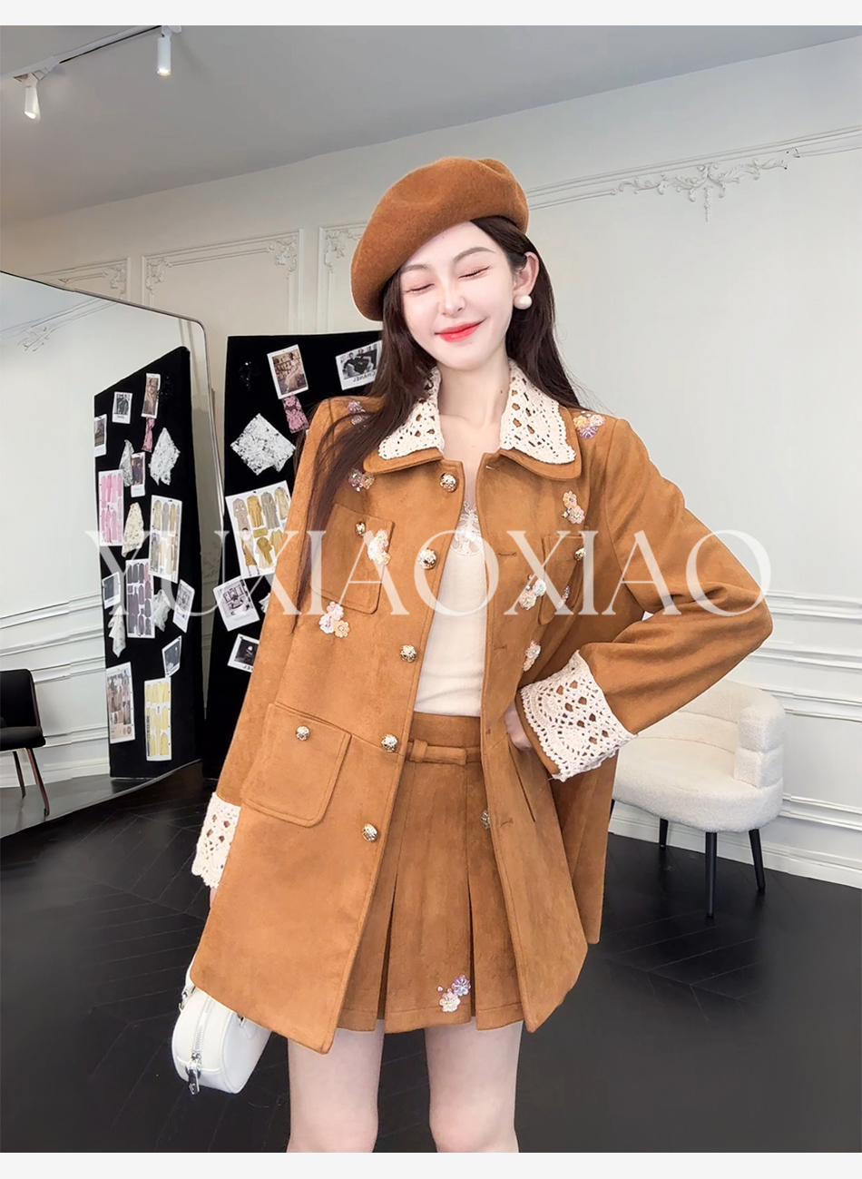 余潇潇【焦糖美术馆】复古麂皮绒钩花蕾丝短款&中长款外套&百褶半裙