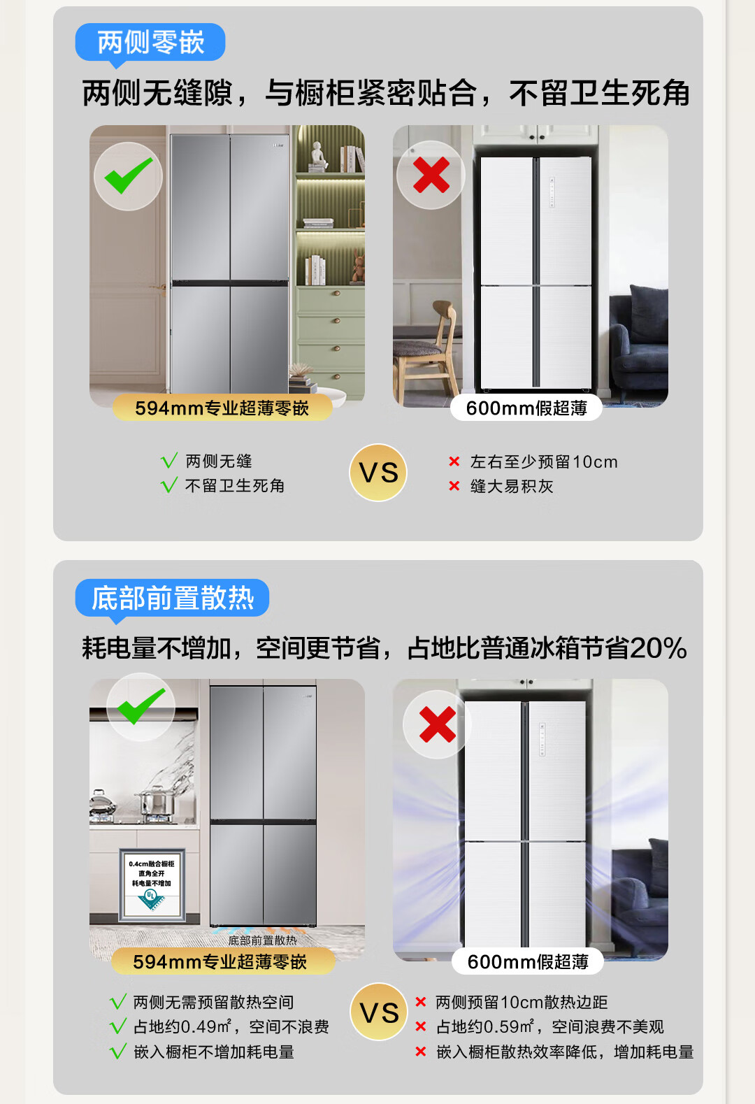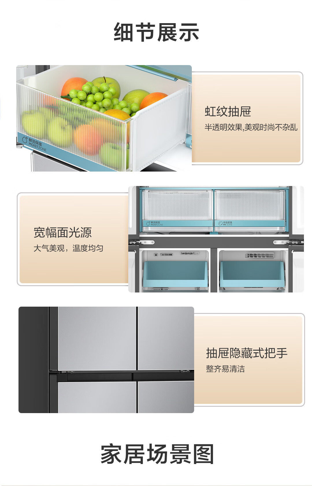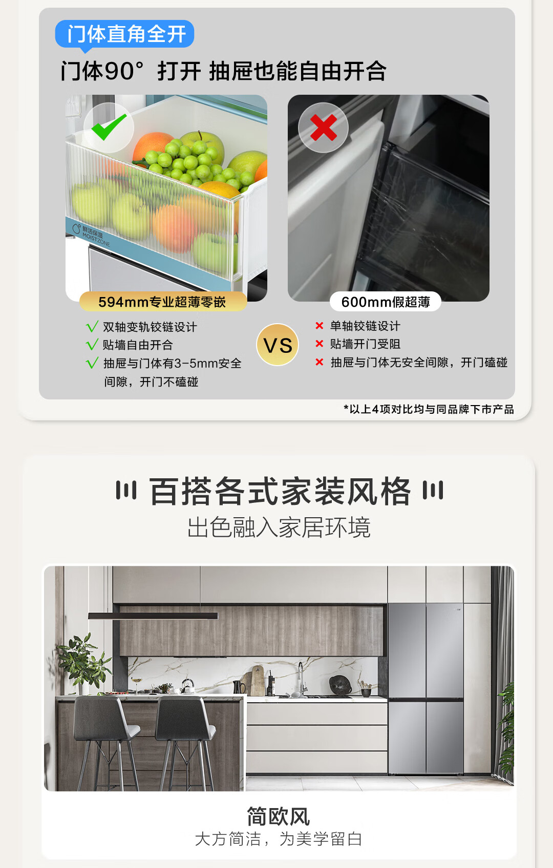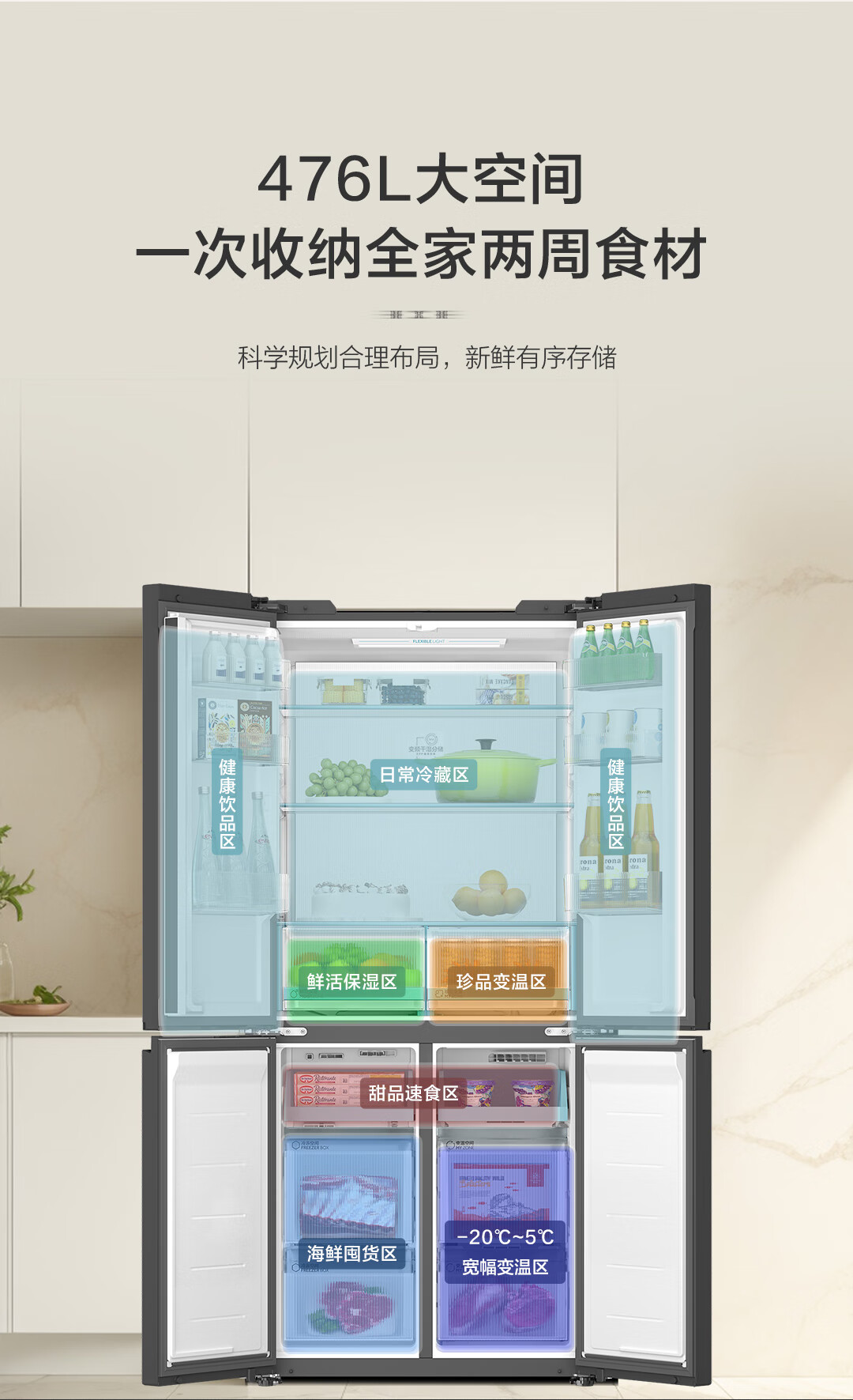海尔(Haier)【小红花套系】476升冰河银594mm超薄零嵌EPP超净彩晶T型冰箱BCD-476WGHTDB9SNU1