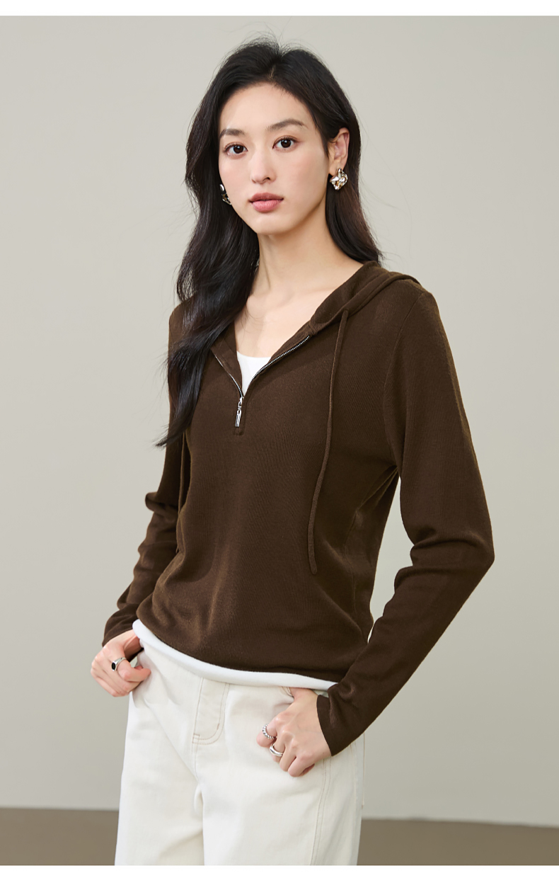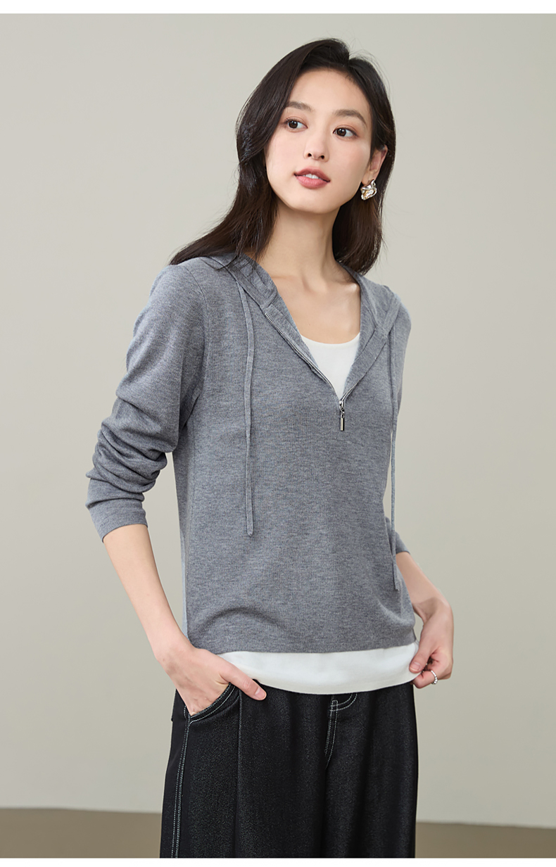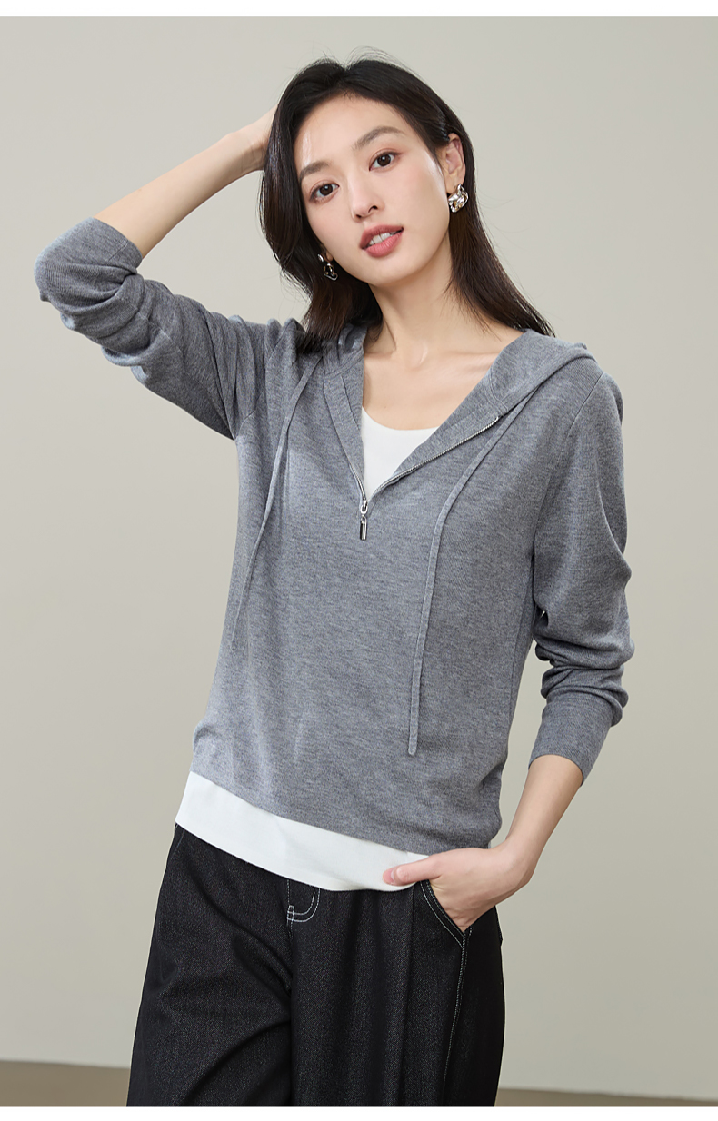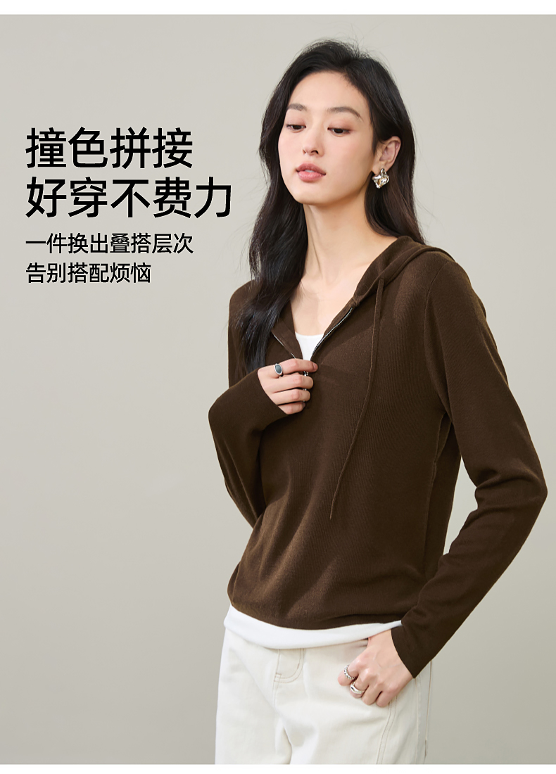 【桑蚕丝+绵羊毛-假两件打底】逸阳秋新款撞色V领连帽休闲卫衣5287