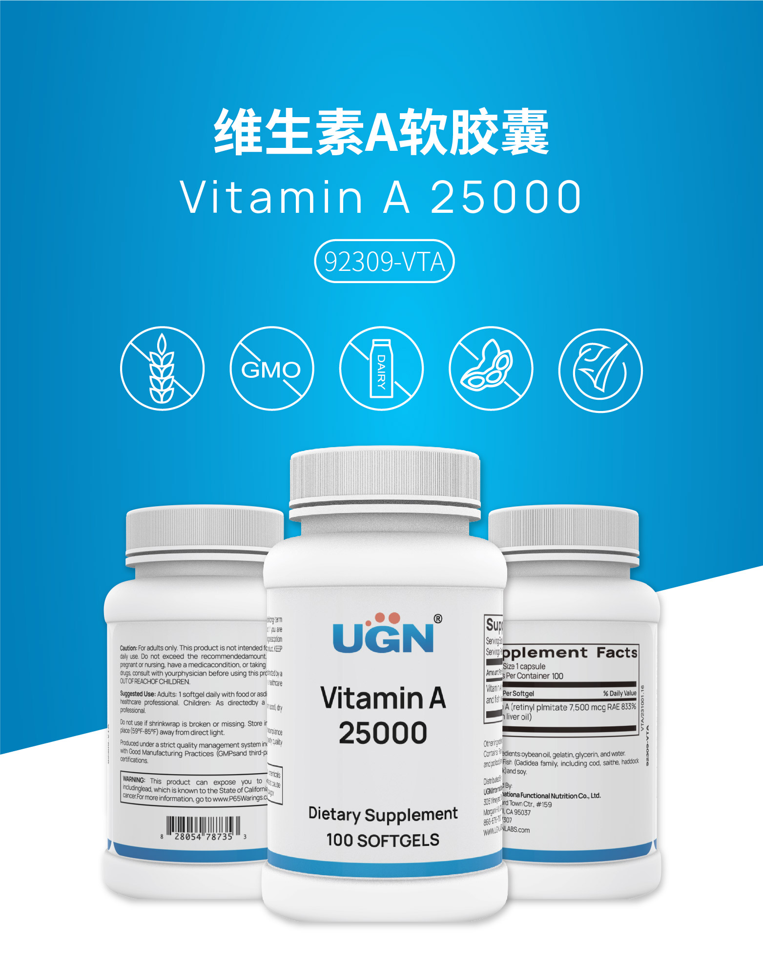 UGN提供的维生素A软胶囊每粒含有7500微克(25000国际单位)的维生素A。作为一种必需的维生素,维生素A与视觉、生长、生殖、细胞分裂和免疫系统健康直接相关。