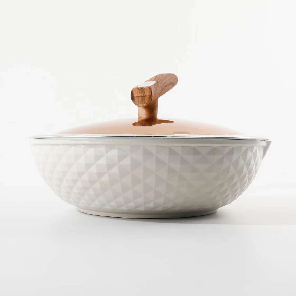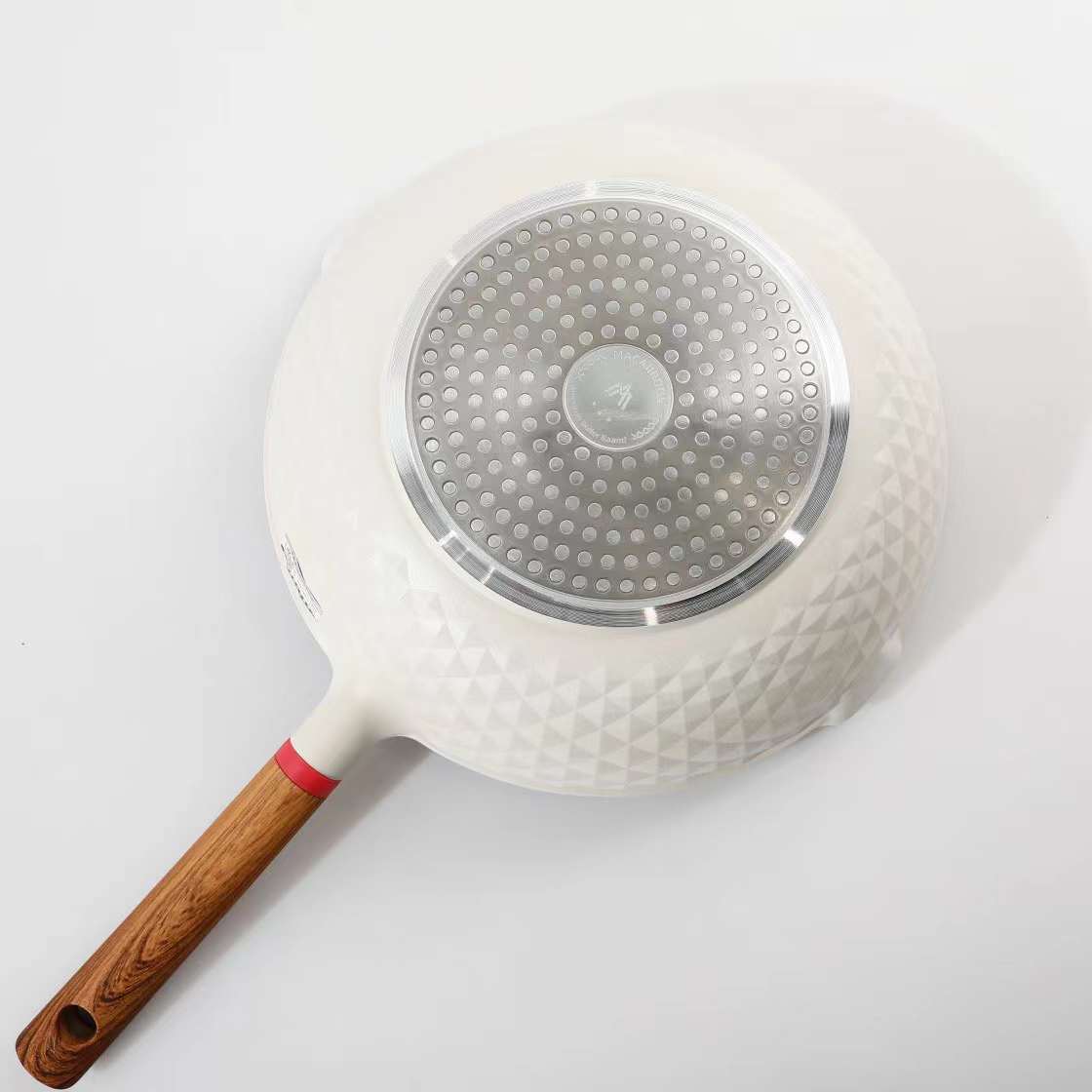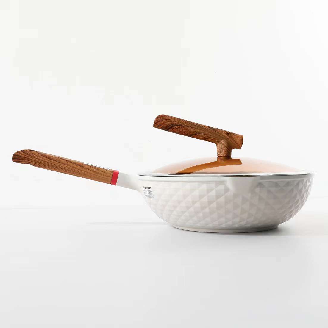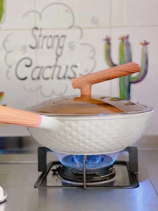 合金一体复合成型 高效聚能环复合锅底 让锅子受热均匀 外观很高级 钻石纹理的高颜值做工很精致 手柄是仿木纹胶木 摸起来特别舒服 不用担心做饭的时候会烫到 还有就是加厚口沿防止食材溢出 用起来超级nice~