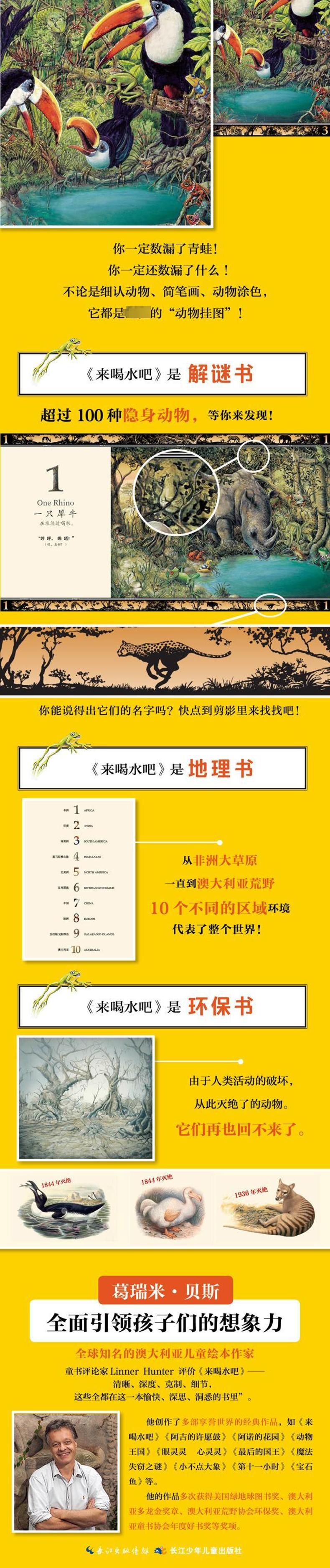 《来喝水吧》可不是一本简单的图画书,它既是数数书,又是解谜书,还是故事书和美术书,更是环保书。作者葛瑞米·贝斯带领我们展开了一场激动人心的发现之旅:从非洲大草原到亚马孙雨林,从北美洲森林到澳大利亚内陆沙漠。