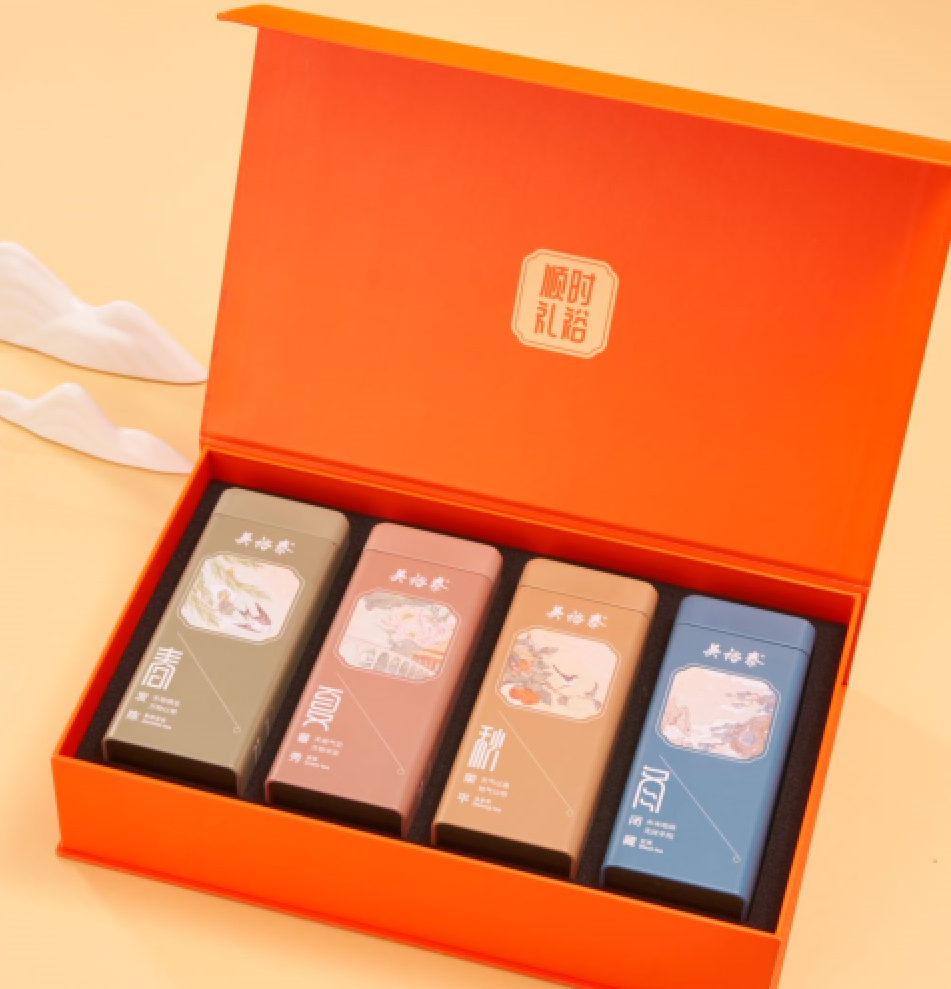 该伴手礼盒内装四个精美铁罐,分别内装四种茶叶,每种茶叶净含量均为50克。礼盒内含一张书签卡片,内容包括该品的文化理念与茶叶品质特色简介。